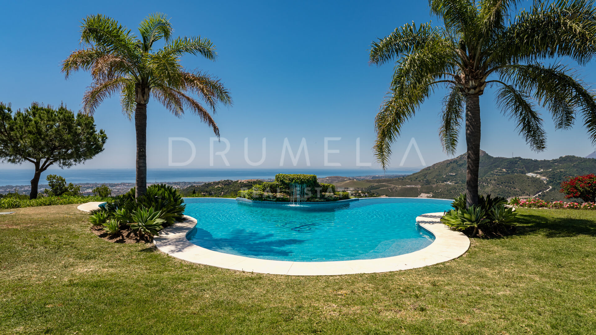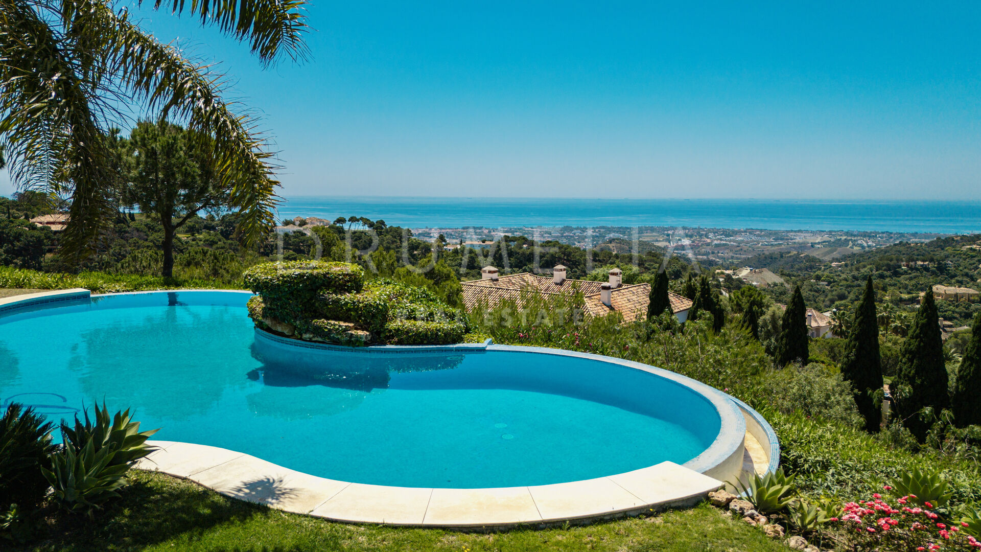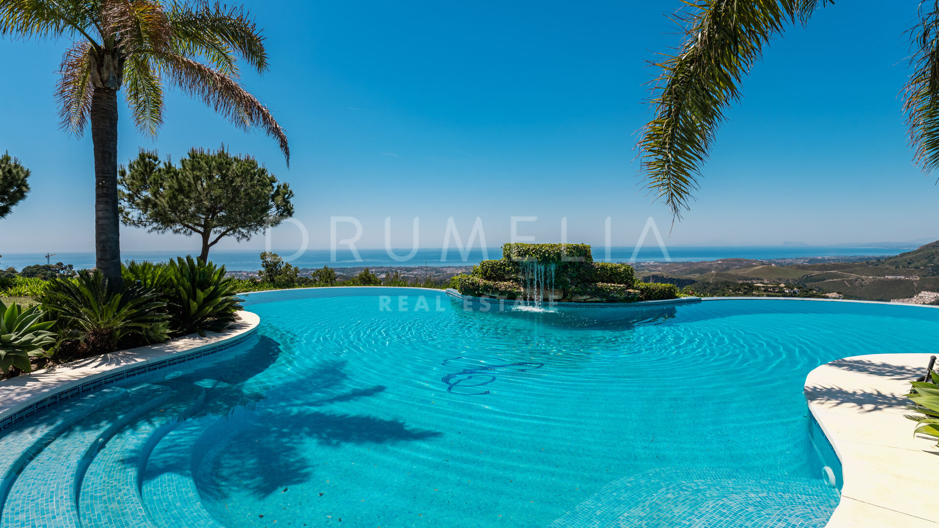 Uteområdet omges av terrasserade trädgårdar och mogen grönska. Den klöverformade infinitypoolen, inramad av två palmer, har ett charmigt vattenfall som förstärker den lugna atmosfären. Flera lounge- och solytor skapar den perfekta platsen för att njuta av Marbellas solsken året runt, havsutsikten och fastighetens naturliga skönhet.