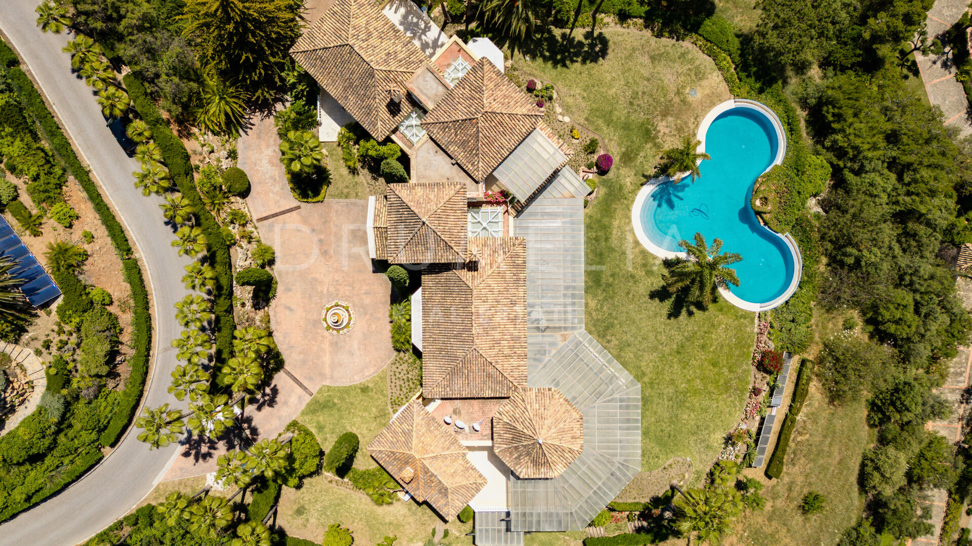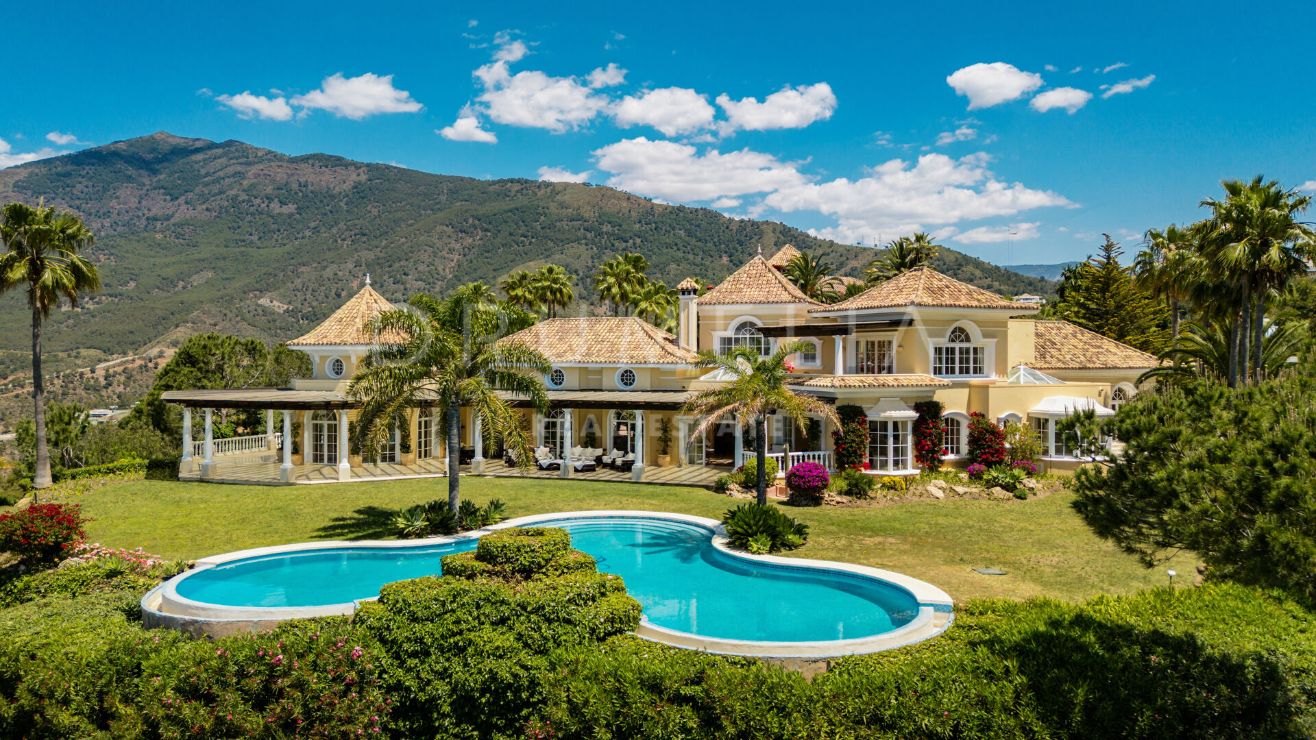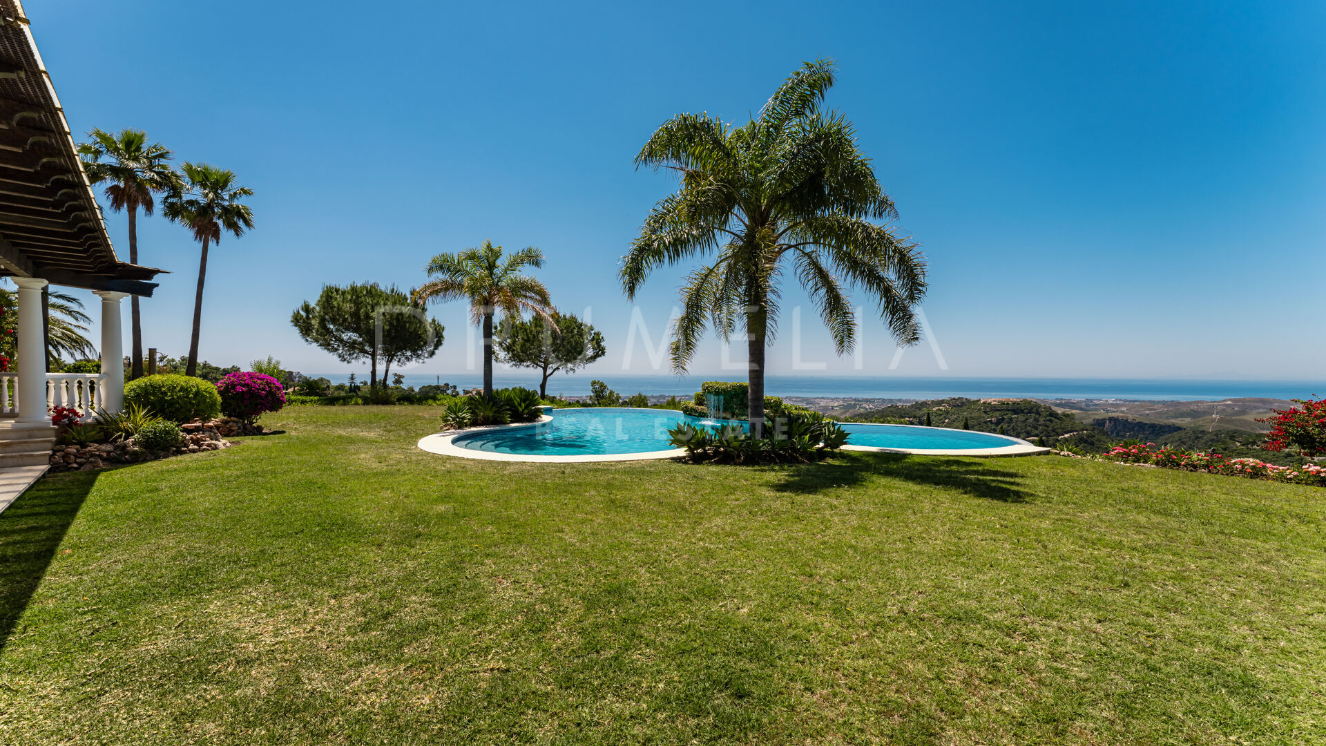 Uteområdet omges av terrasserade trädgårdar och mogen grönska. Den klöverformade infinitypoolen, inramad av två palmer, har ett charmigt vattenfall som förstärker den lugna atmosfären. Flera lounge- och solytor skapar den perfekta platsen för att njuta av Marbellas solsken året runt, havsutsikten och fastighetens naturliga skönhet.