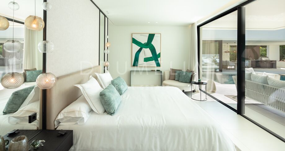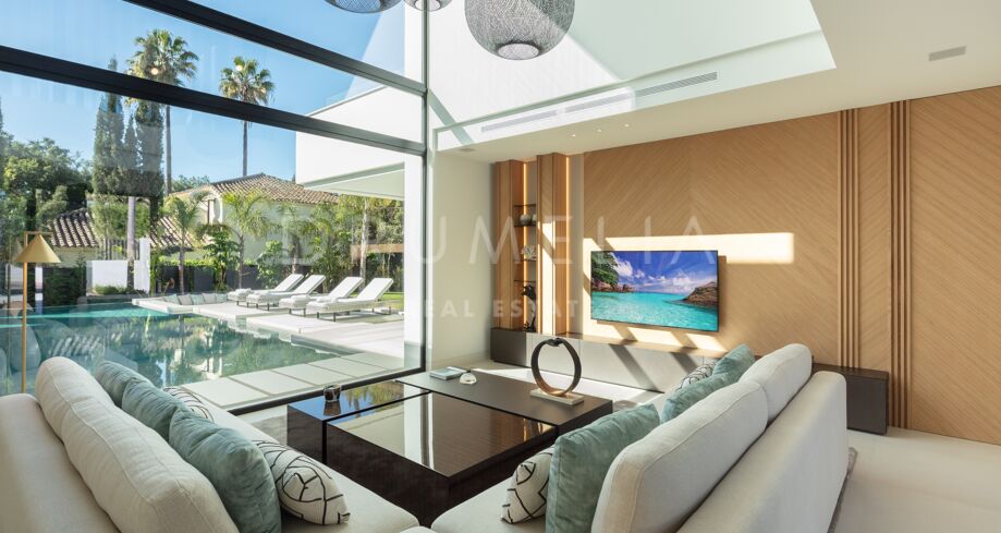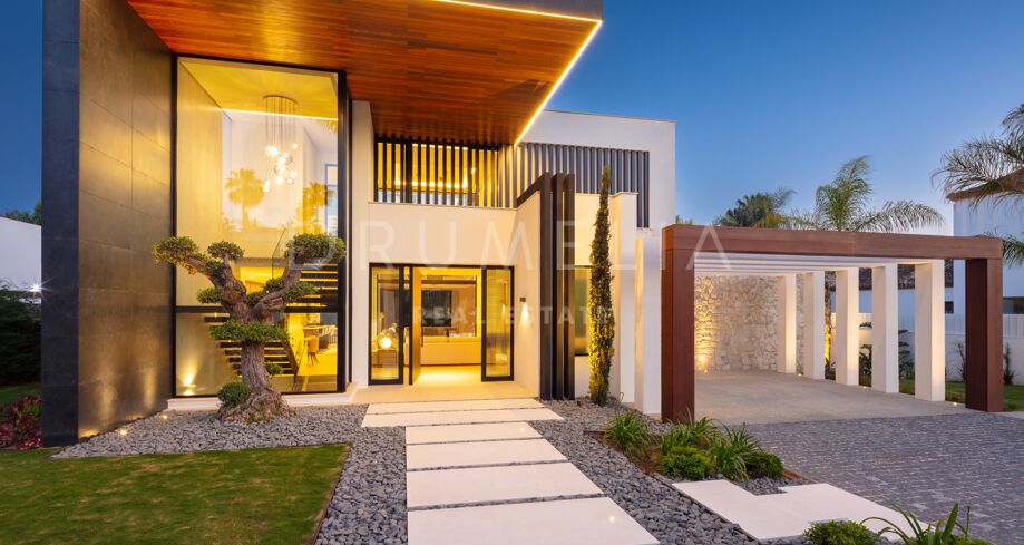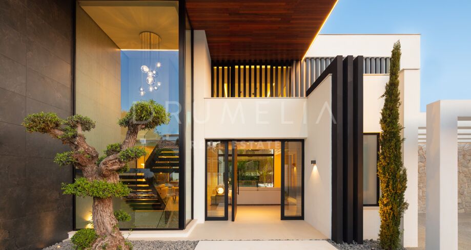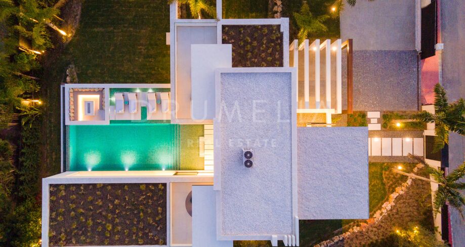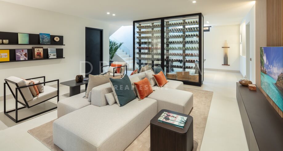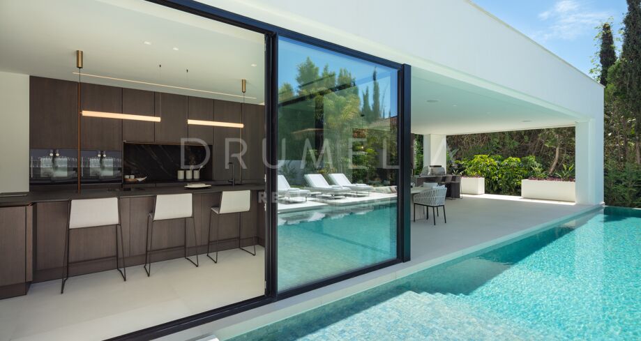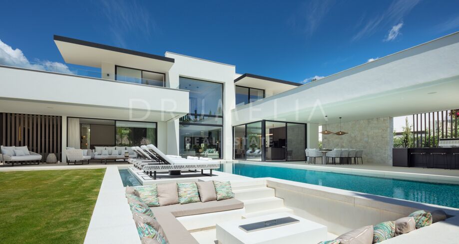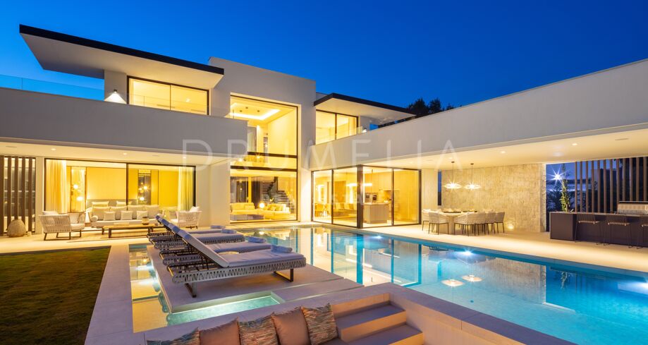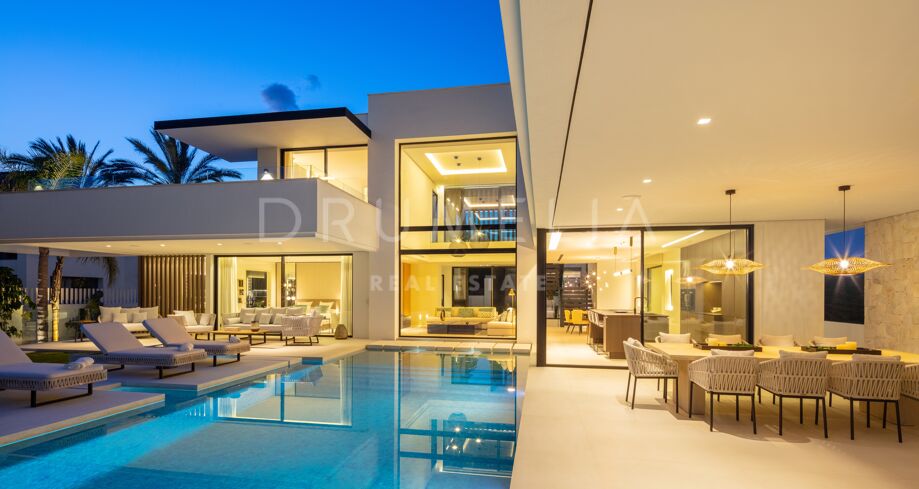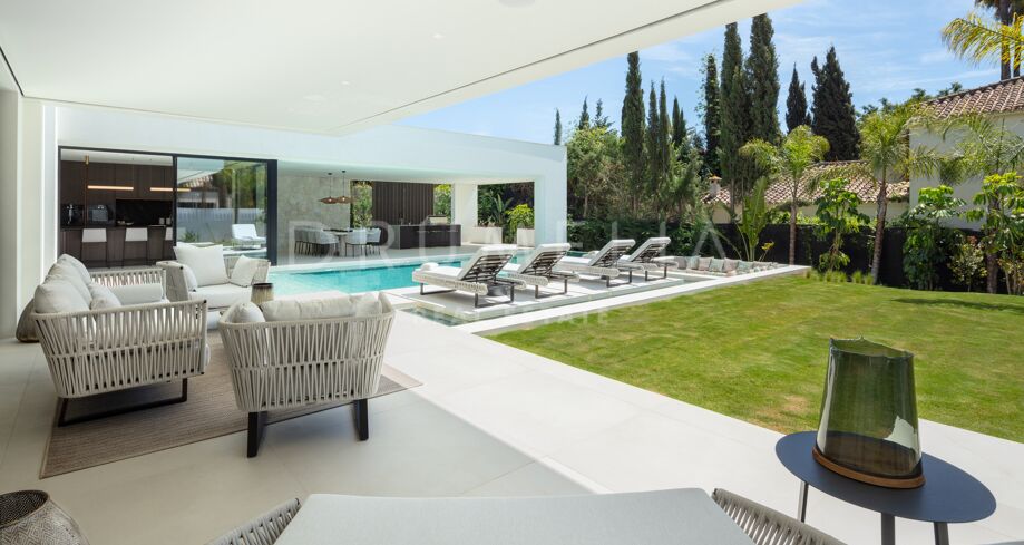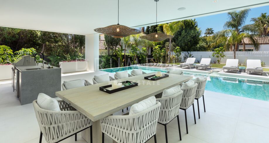 Inbäddad i det prestigefyllda området Las Brisas, Nueva Andalucía, erbjuder denna fantastiska villa en oöverträffad blandning av modern design och lyxig komfort. Fastigheten är omgiven av vackert anlagda trädgårdar, vilket skapar en lugn tillflyktsort med en privat pool, en nedsänkt lounge och olika utomhusunderhållningsutrymmen. Expansiva terrasser inbjuder till uteservering och avkoppling, kompletterat med ett elegant utekök och flera soldränkta sittplatser.