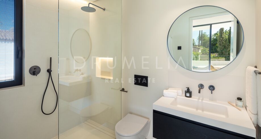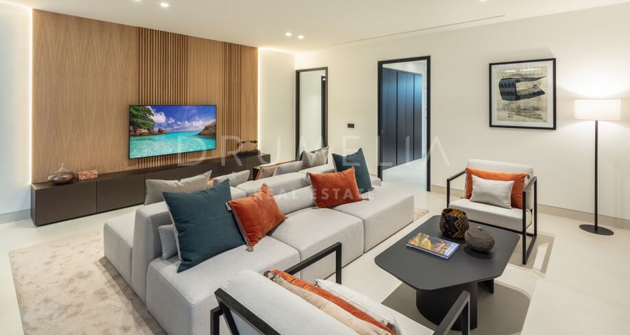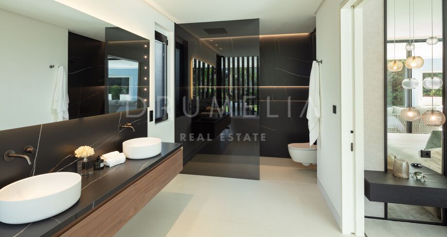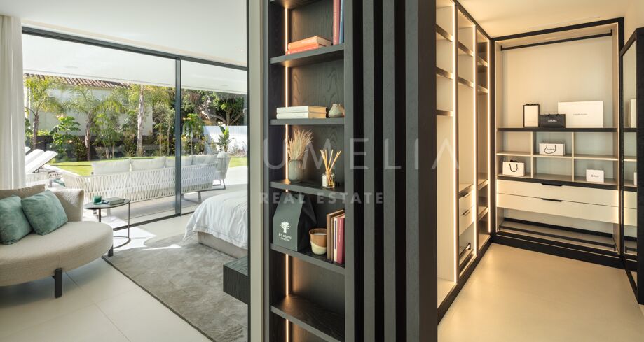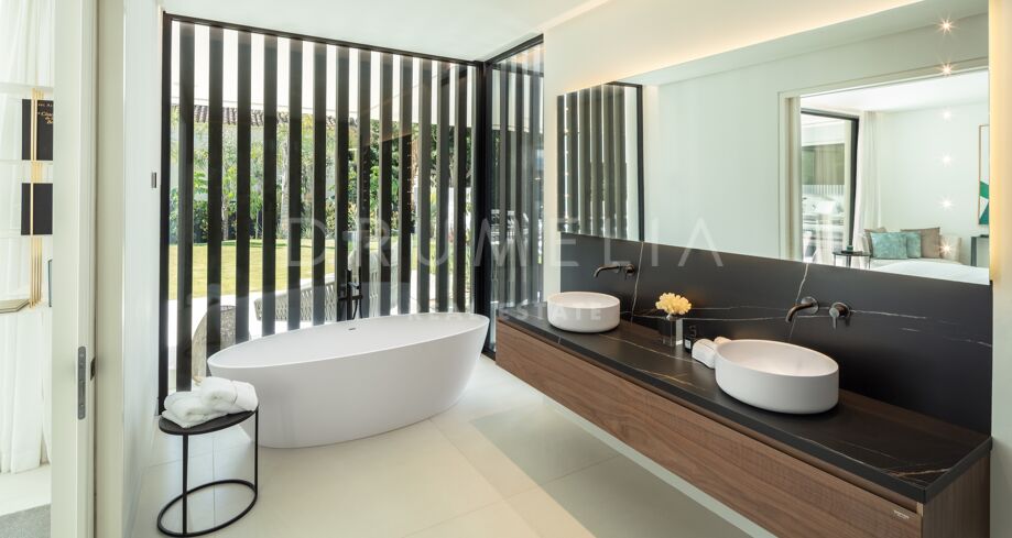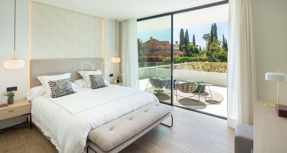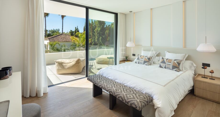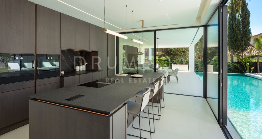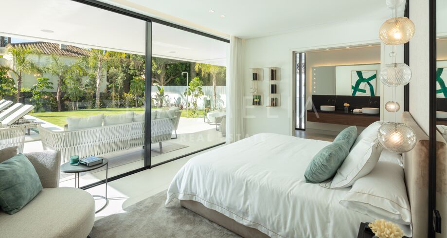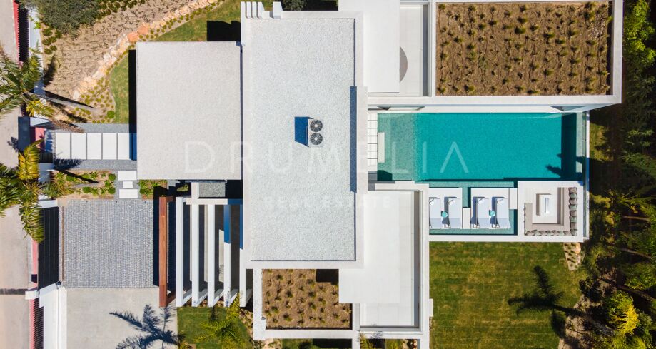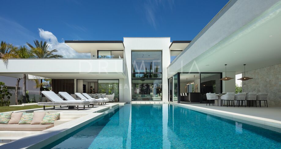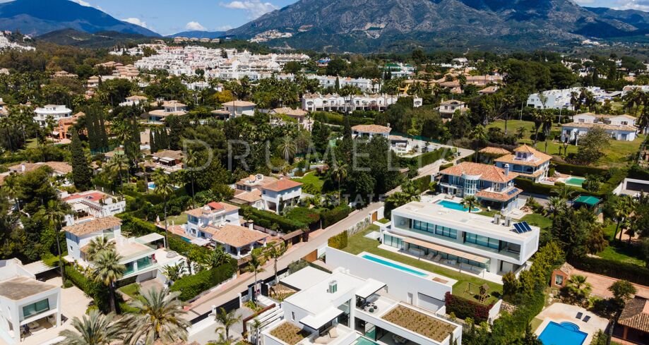 Inbäddad i det prestigefyllda området Las Brisas, Nueva Andalucía, erbjuder denna fantastiska villa en oöverträffad blandning av modern design och lyxig komfort. Fastigheten är omgiven av vackert anlagda trädgårdar, vilket skapar en lugn tillflyktsort med en privat pool, en nedsänkt lounge och olika utomhusunderhållningsutrymmen. Expansiva terrasser inbjuder till uteservering och avkoppling, kompletterat med ett elegant utekök och flera soldränkta sittplatser.