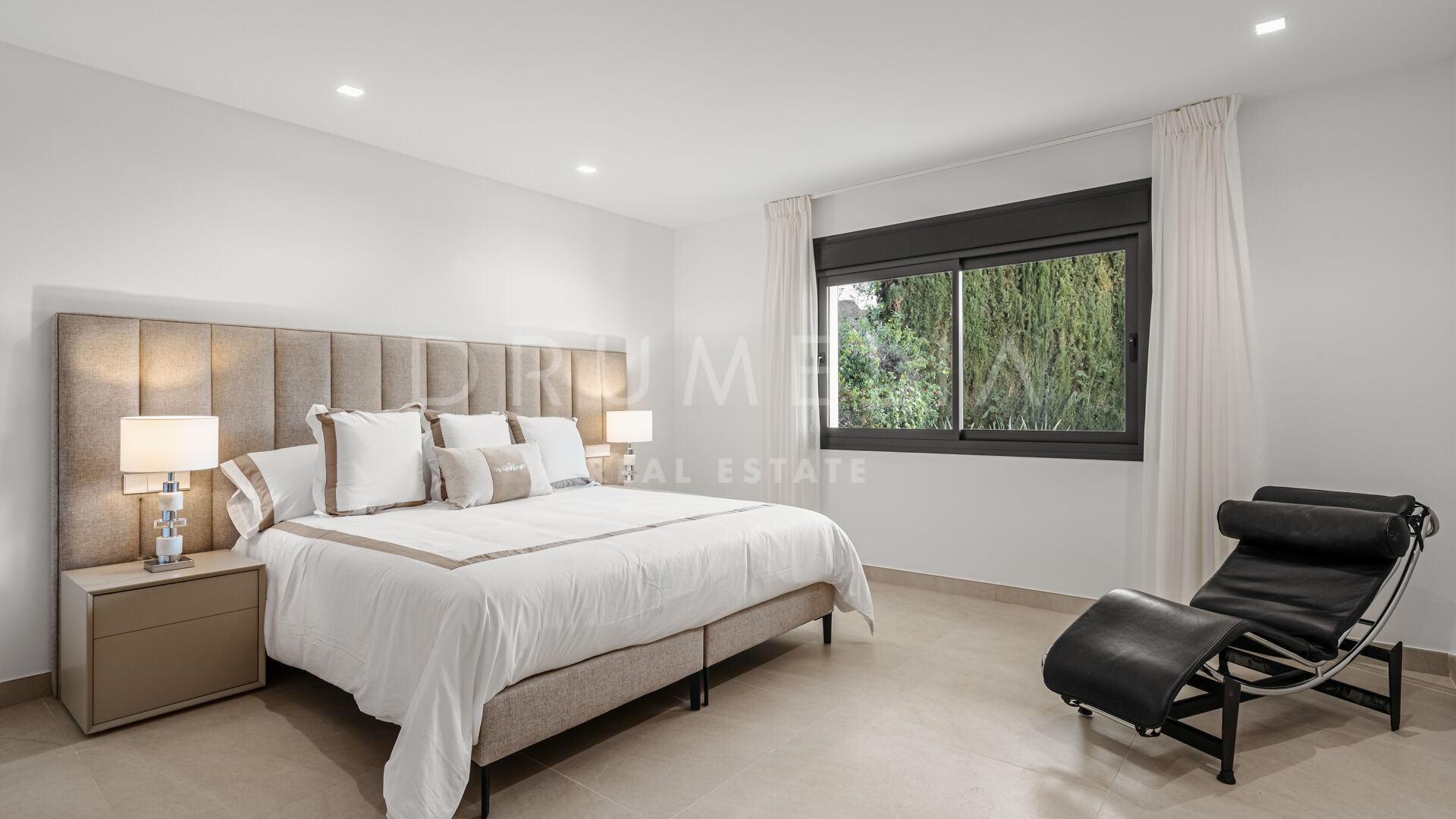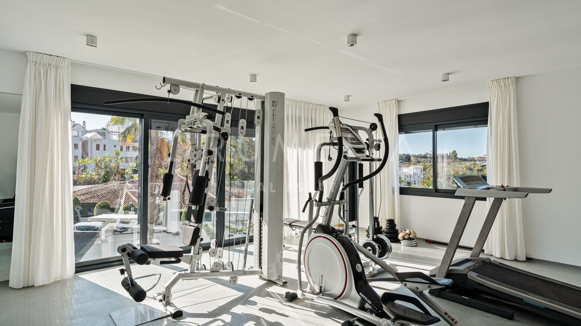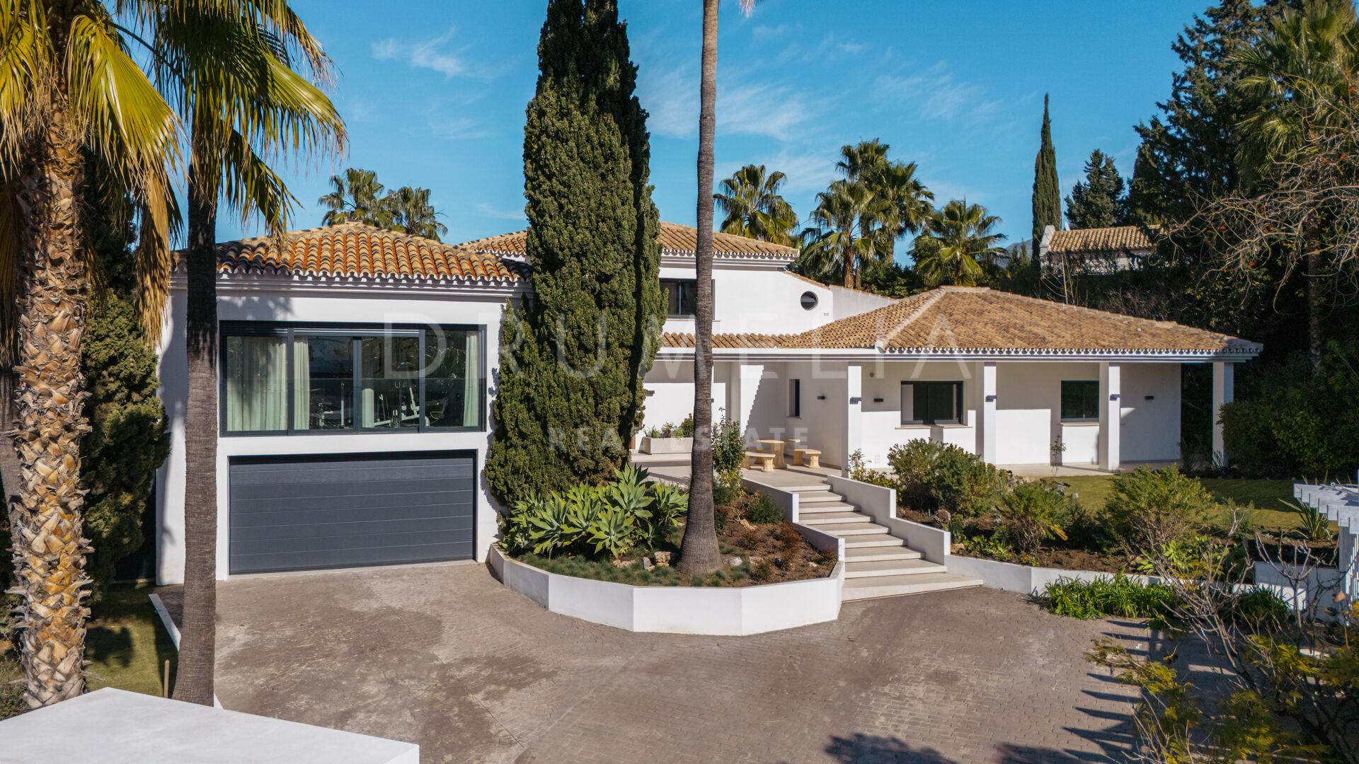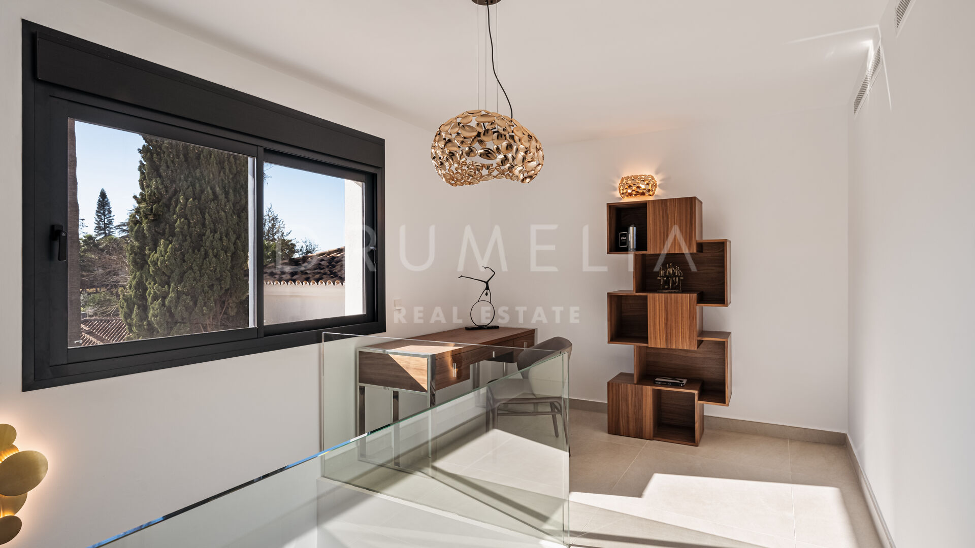 Den 475 m² stora bostaden är omgiven av subtropisk grönska och lyxfastigheter i Nueva Andalucia och har nyligen renoverats med högkvalitativa material och ligger på en av de bästa och största (1.923 m²!) tomterna i Los Naranjos-området, vilket ger ett överflöd av utrymme och exklusivitet. För att säkerställa komfort för alla har den här fastigheten en trevlig enkel layout, när du kommer in hittar du vardagsrummet som vetter mot en av terrasserna, till vänster ett modernt kök med öppen planlösning. detta område leder också till den täckta terrassen med grillplats där du också kan varva ner och ta in golfutsikten. Precis utanför köket har du tillgång till tvättstugan och garaget. Beläget ovanför garaget kan du höja din träningsrutin i gymmet med stora fönster som ger ljus och ventilation. Bredvid detta har du det perfekta sovrummet med ett badrum för personalen. På motsatt sida av villan, fortfarande på bottenvåningen, har du 3 stora sovrum med eget badrum, och sedan på övervåningen ett fantastiskt sovrum med sin klädkammare, eget badrum och fantastisk utsikt över golfbanan. Angränsande till sovrummet finns en studie / kontorsområde och ett extra litet rum för förvaring.