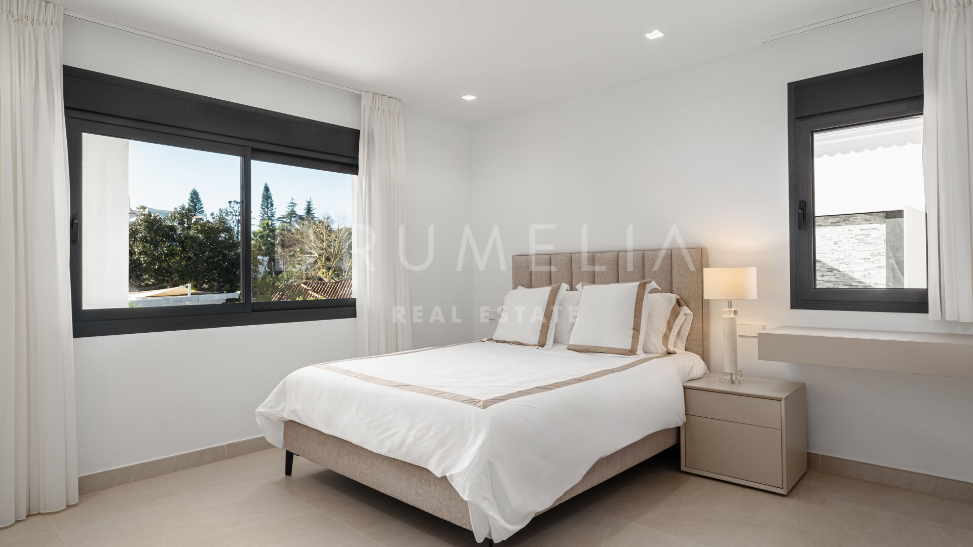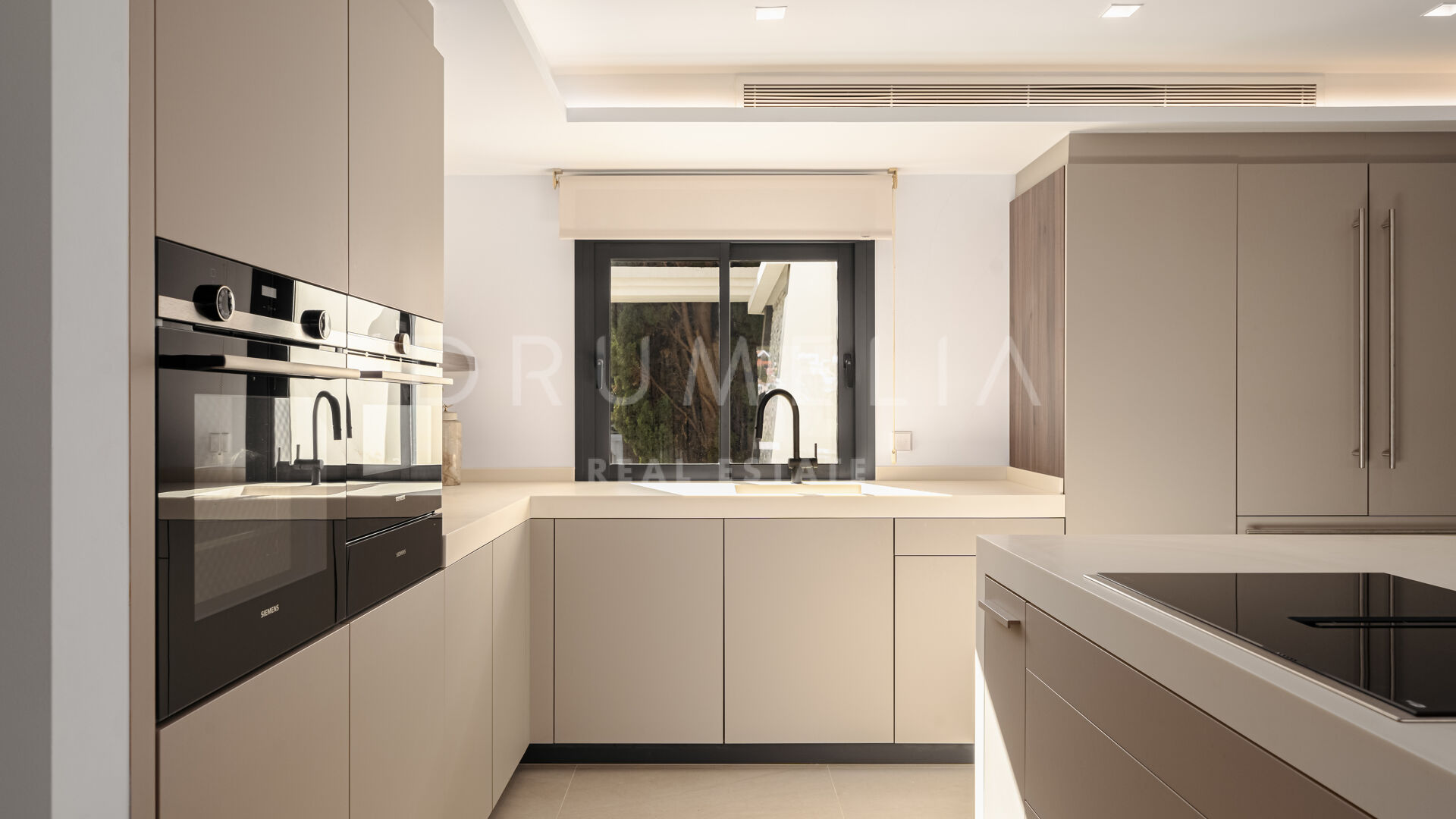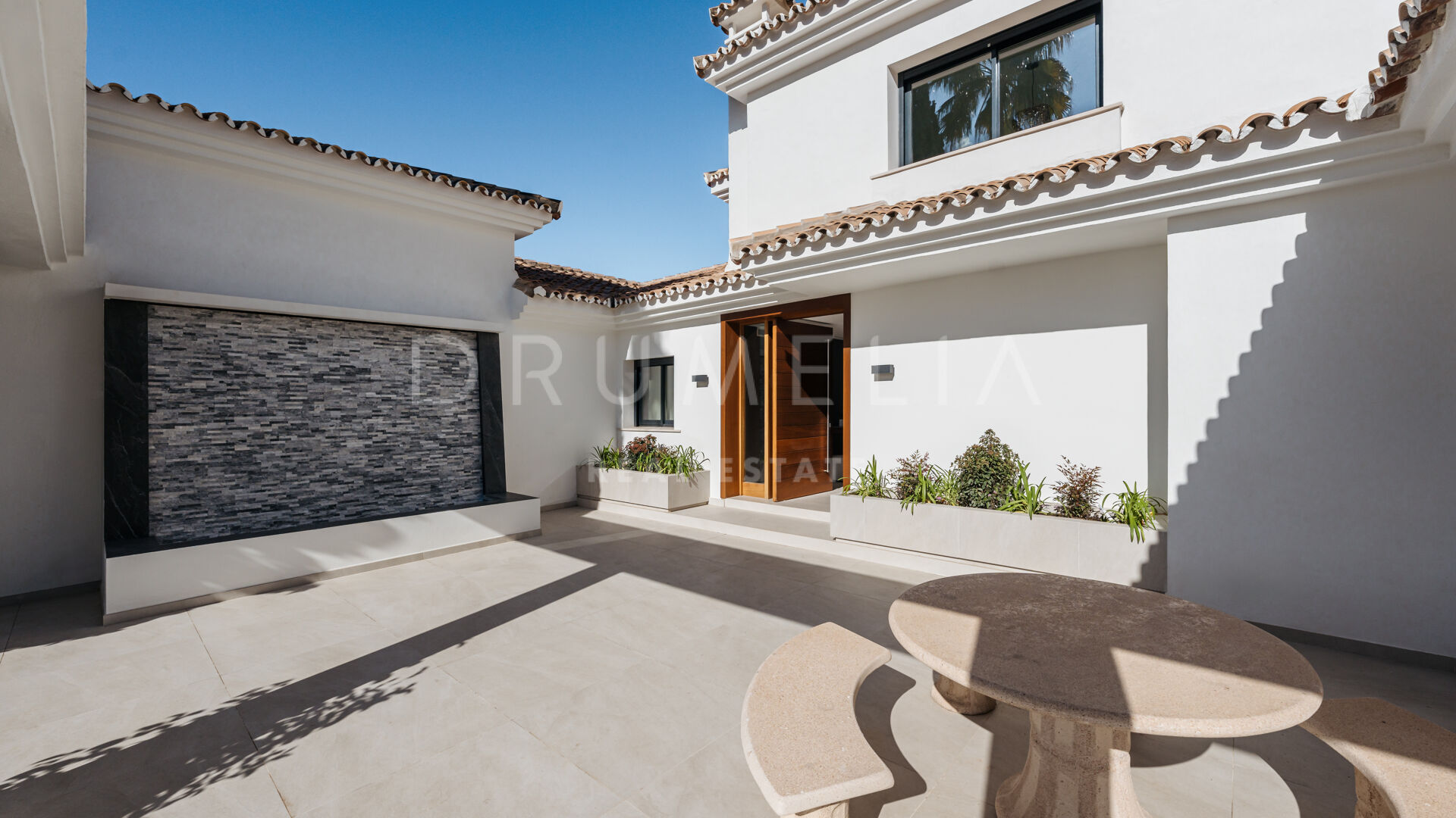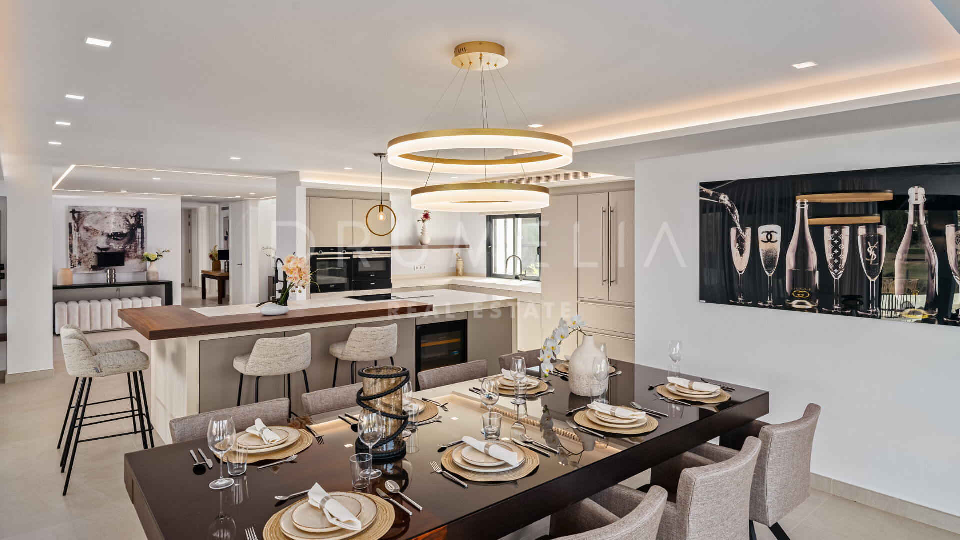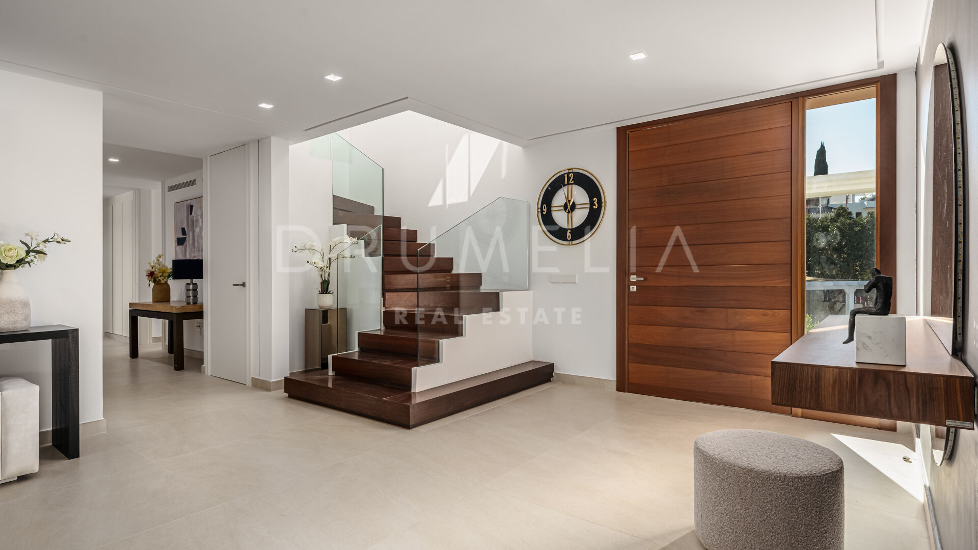 Den 475 m² stora bostaden är omgiven av subtropisk grönska och lyxfastigheter i Nueva Andalucia och har nyligen renoverats med högkvalitativa material och ligger på en av de bästa och största (1.923 m²!) tomterna i Los Naranjos-området, vilket ger ett överflöd av utrymme och exklusivitet. För att säkerställa komfort för alla har den här fastigheten en trevlig enkel layout, när du kommer in hittar du vardagsrummet som vetter mot en av terrasserna, till vänster ett modernt kök med öppen planlösning. detta område leder också till den täckta terrassen med grillplats där du också kan varva ner och ta in golfutsikten. Precis utanför köket har du tillgång till tvättstugan och garaget. Beläget ovanför garaget kan du höja din träningsrutin i gymmet med stora fönster som ger ljus och ventilation. Bredvid detta har du det perfekta sovrummet med ett badrum för personalen. På motsatt sida av villan, fortfarande på bottenvåningen, har du 3 stora sovrum med eget badrum, och sedan på övervåningen ett fantastiskt sovrum med sin klädkammare, eget badrum och fantastisk utsikt över golfbanan. Angränsande till sovrummet finns en studie / kontorsområde och ett extra litet rum för förvaring.