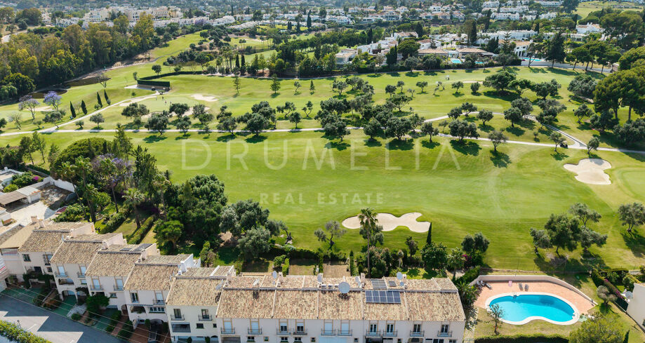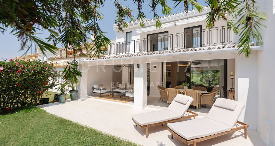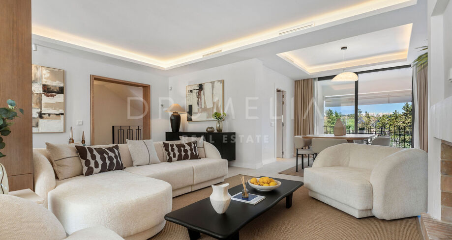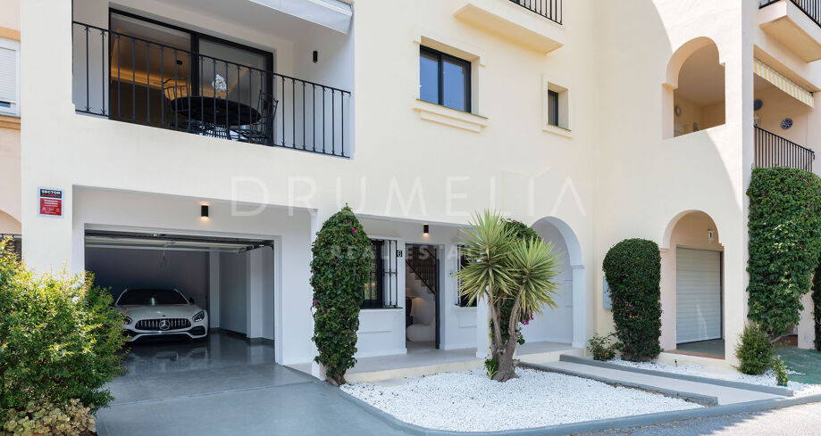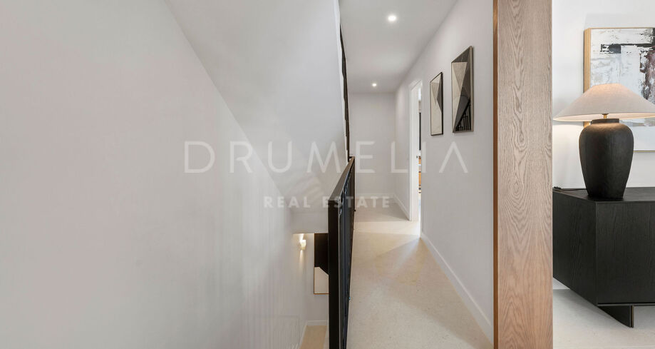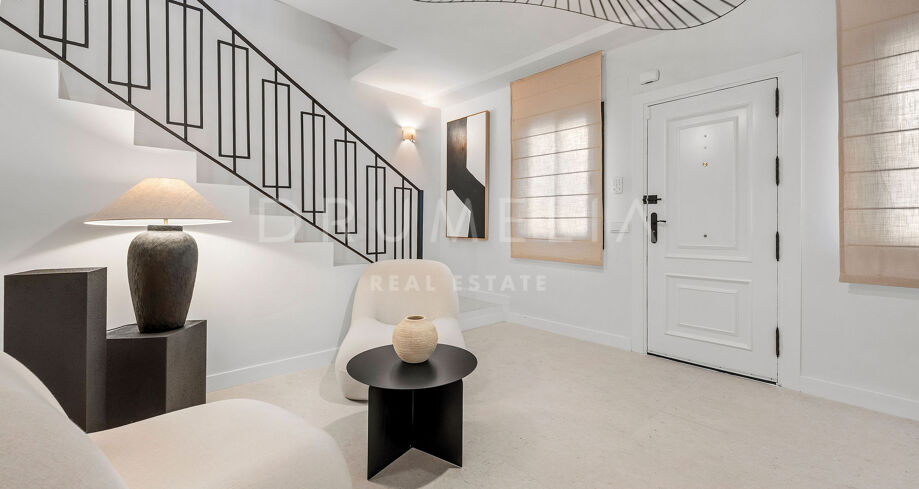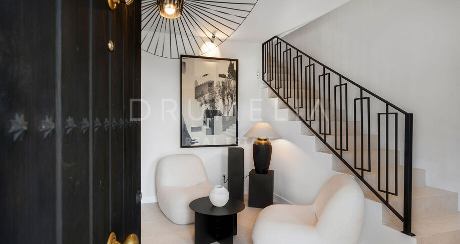 Detta eleganta radhus i tre våningar har nyligen renoverats och ligger mitt i den prestigefyllda Golfdalen i Nueva Andalucía. Det kombinerar medelhavscharm med moderna ytskikt och erbjuder 227 m² välplanerat boende med fyra sovrum och sex badrum.