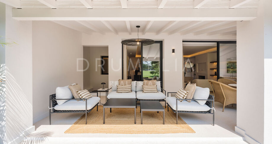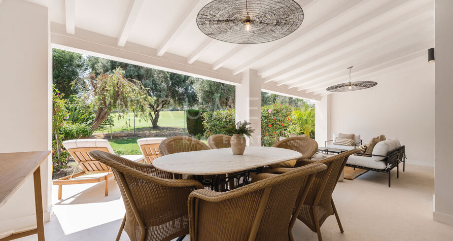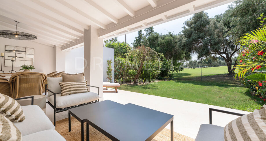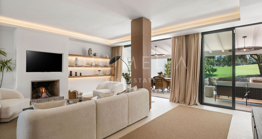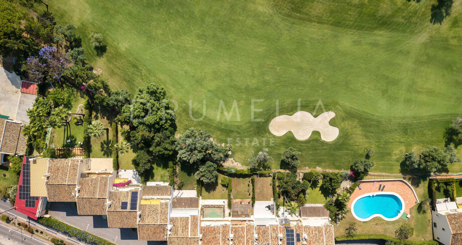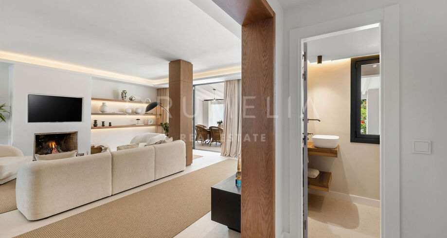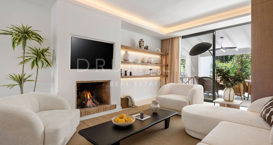 Detta eleganta radhus i tre våningar har nyligen renoverats och ligger mitt i den prestigefyllda Golfdalen i Nueva Andalucía. Det kombinerar medelhavscharm med moderna ytskikt och erbjuder 227 m² välplanerat boende med fyra sovrum och sex badrum.