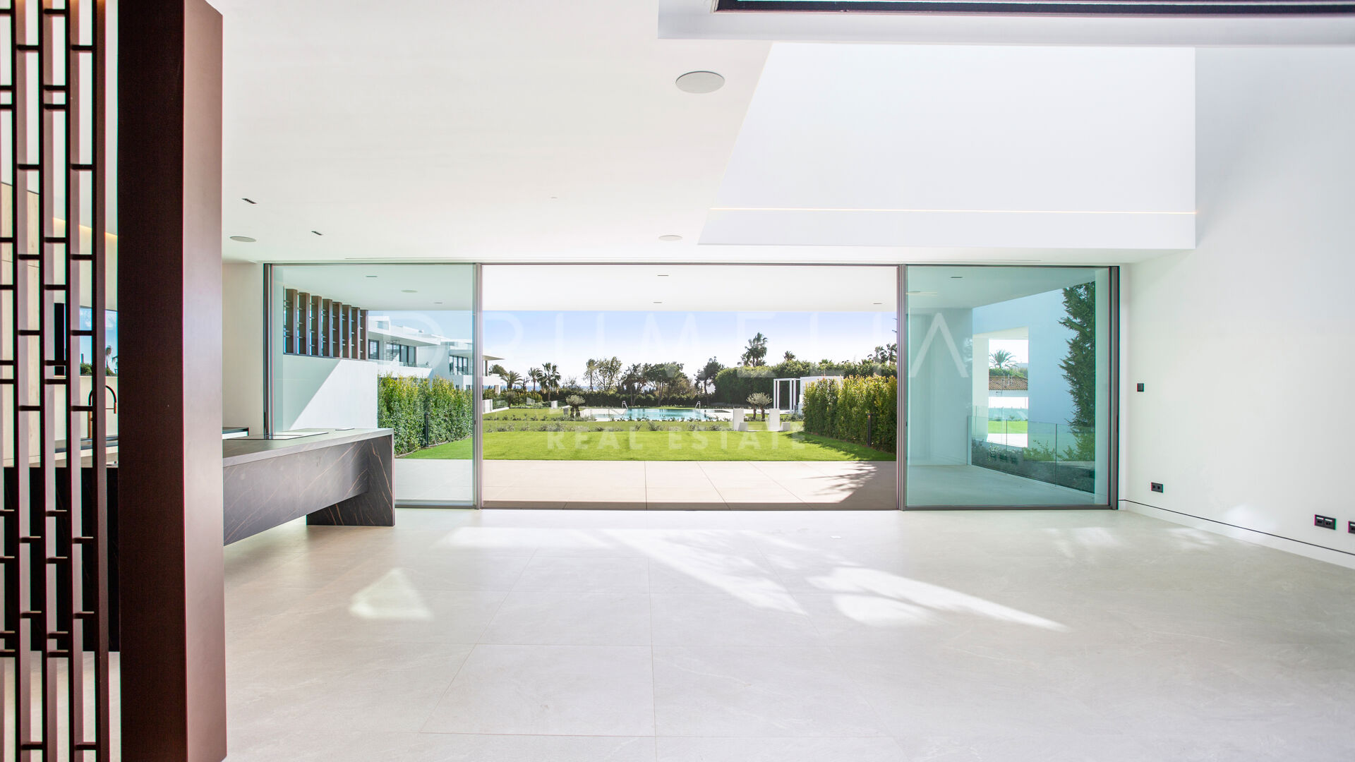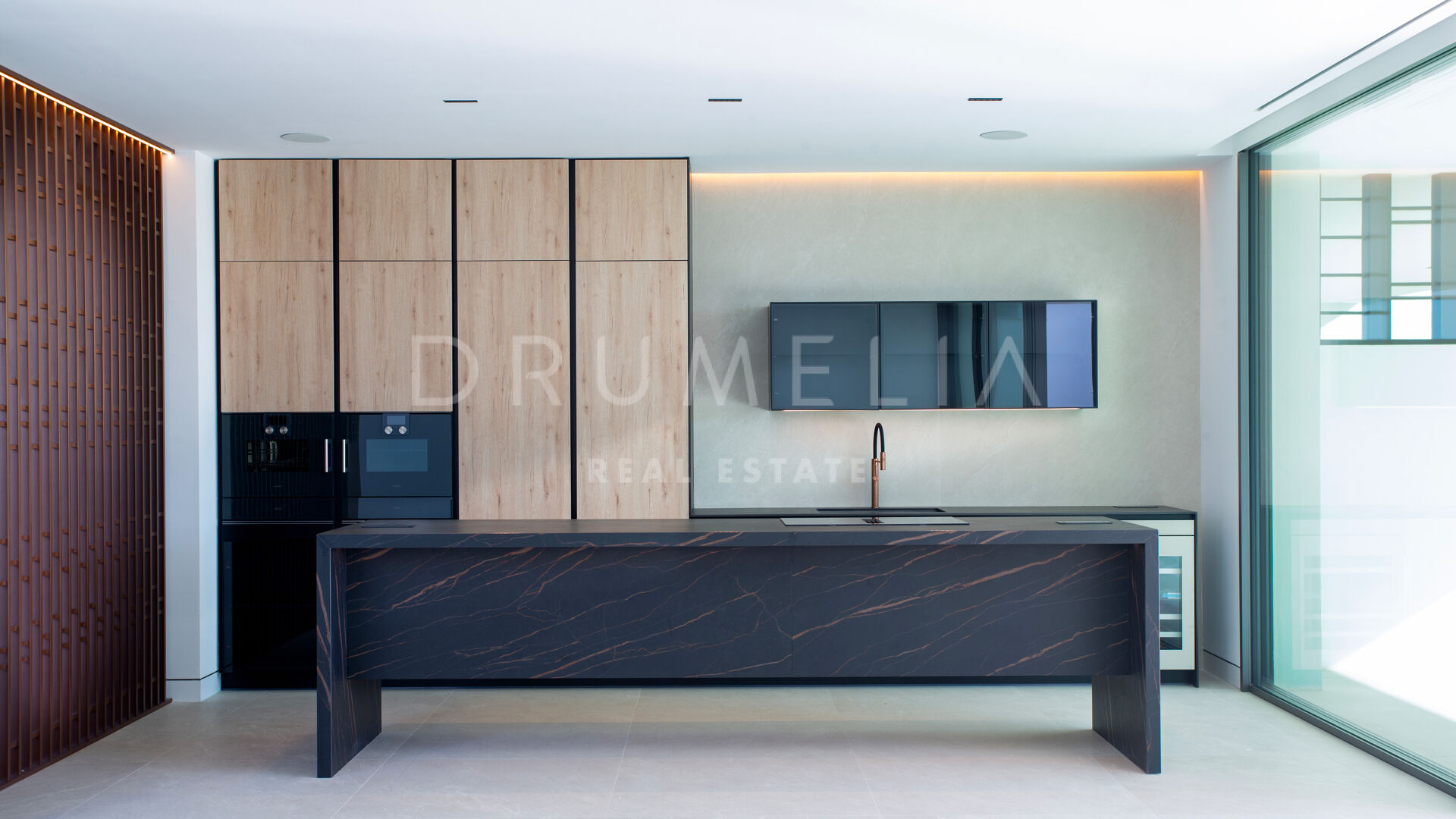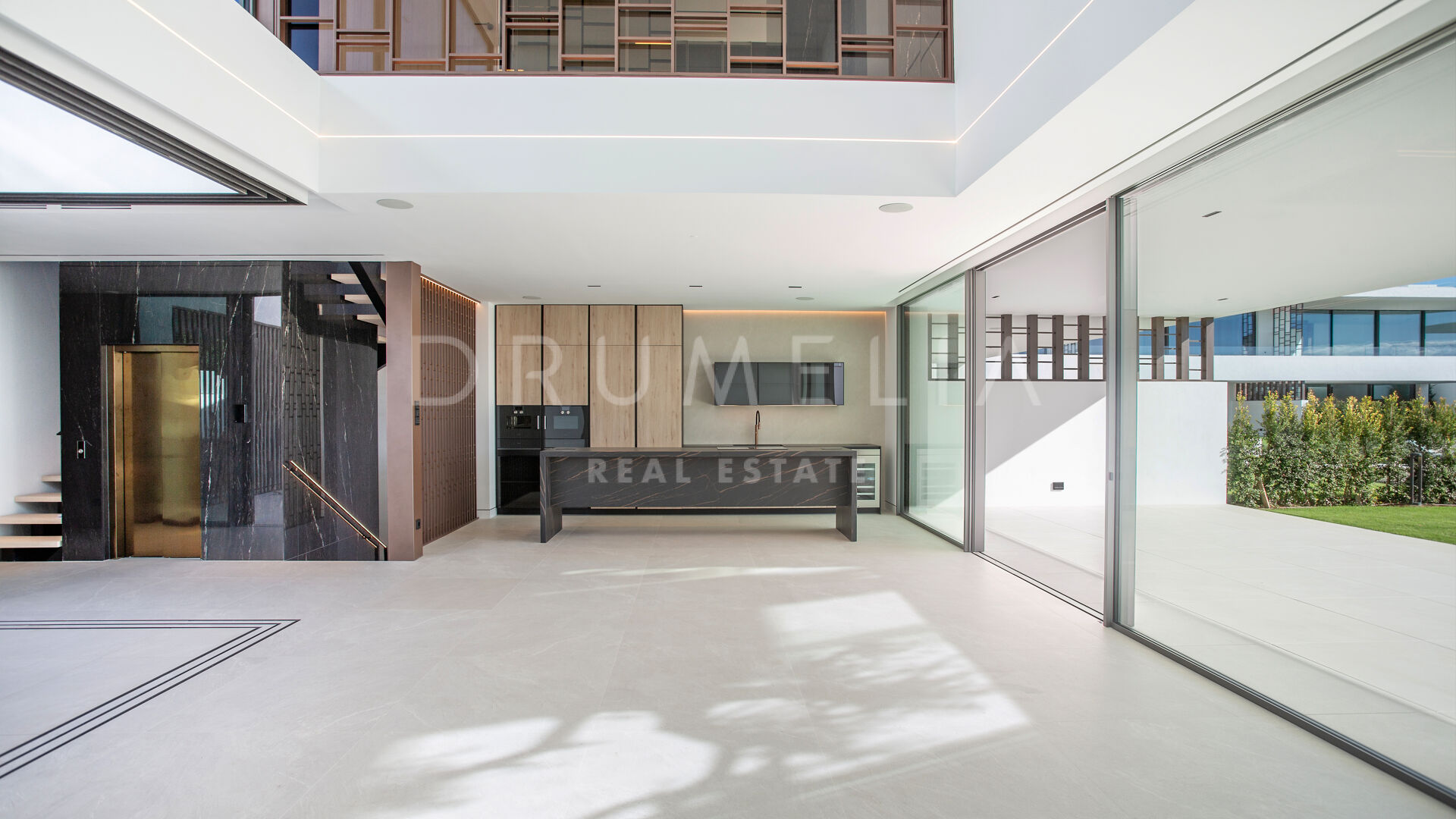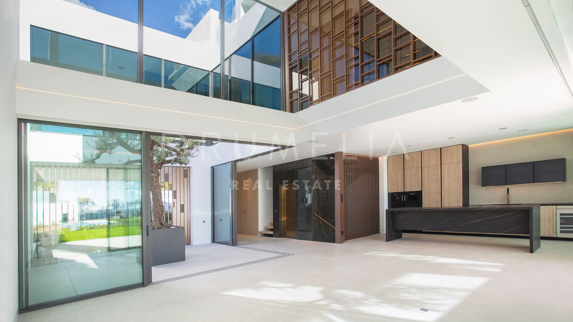 Fastigheten kommer att ha underbara vardagsrum och matsalar i öppen planlösning, ett elegant, minimalistiskt kök i minimalistisk stil med fullt utrustat kök med integrerade Gaggenau-apparater, 4 sovrumssviter, 5 badrum och 1 gästtoalett. Ett stilfullt och ljust vardagsrum med dubbla takhöjder öppnar sig mot den stora terrassen med fantastisk panoramautsikt mot havet och en fantastisk känsla av frihet. Alla sovrumssviter har fönster från golv till tak, ekgolv, Porcelanosa marmor och hårdvara i hela huset, vilket visar upp en elegant och raffinerad modern stil. Den imponerande Master-sviten kommer att imponera med en glasfunktionell vägg som reflekterar havet, ett modernt lyxigt badrum med ett fristående badkar, ett skräddarsytt omklädningsrum och en privat terrass. Ett garage kommer att hysa 4 av dina bilar.