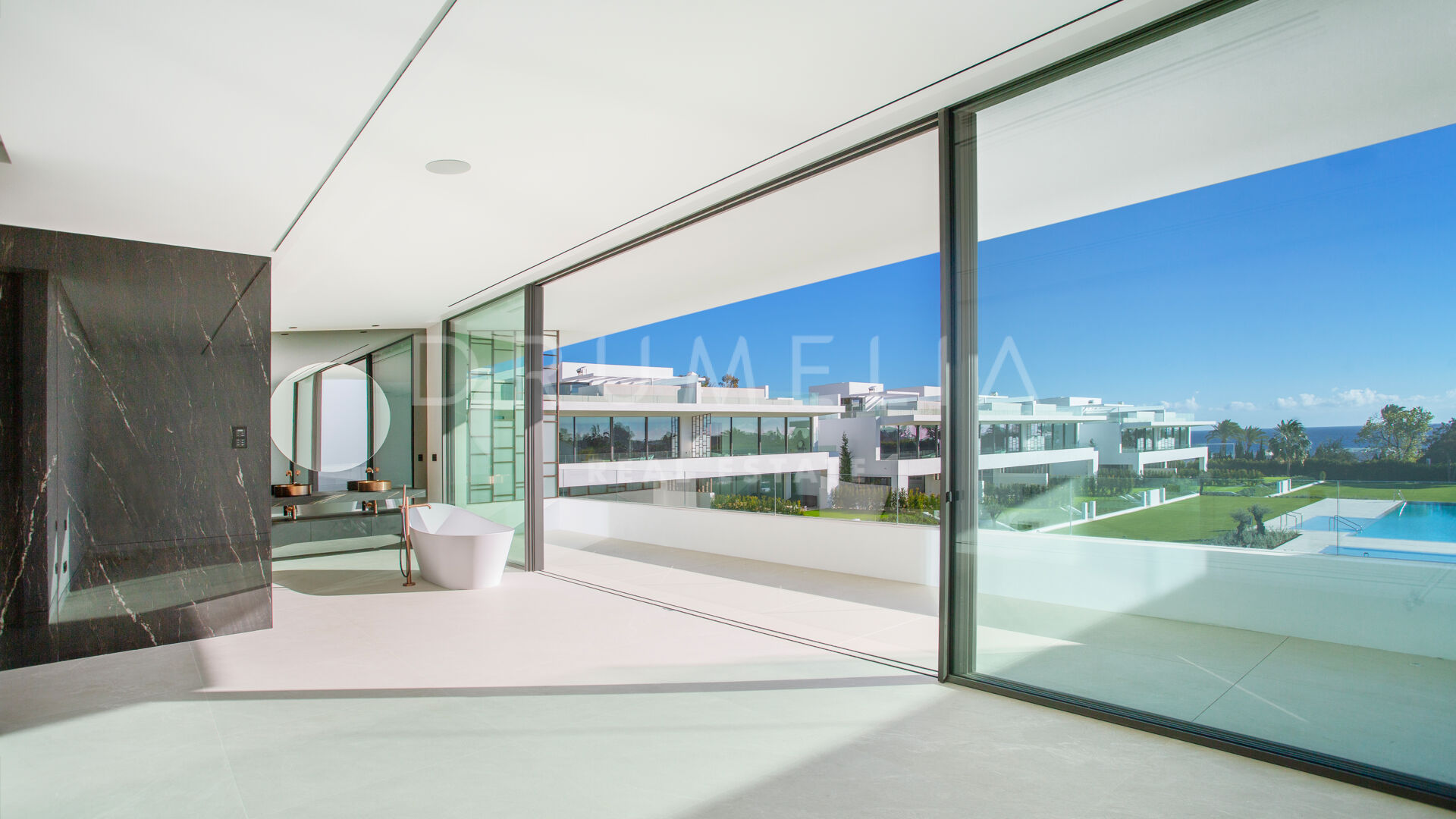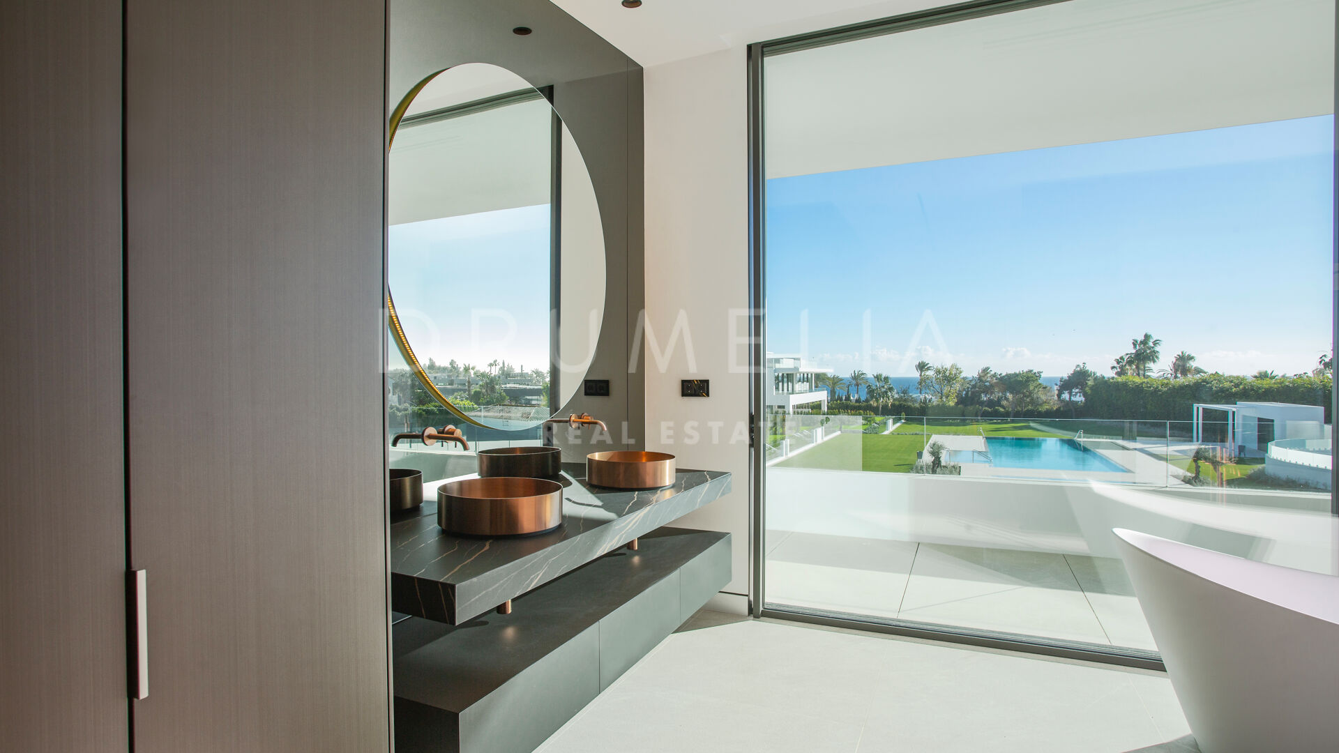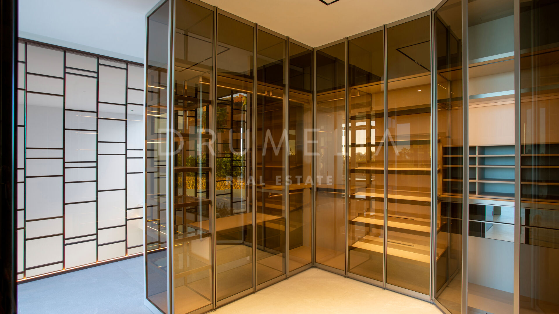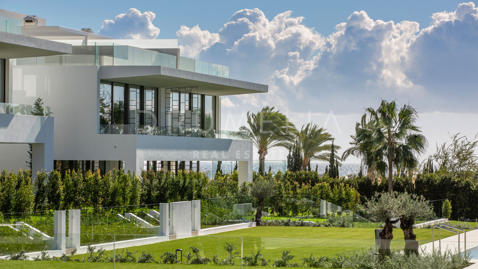 Fastigheten kommer att ha underbara vardagsrum och matsalar i öppen planlösning, ett elegant, minimalistiskt kök i minimalistisk stil med fullt utrustat kök med integrerade Gaggenau-apparater, 4 sovrumssviter, 5 badrum och 1 gästtoalett. Ett stilfullt och ljust vardagsrum med dubbla takhöjder öppnar sig mot den stora terrassen med fantastisk panoramautsikt mot havet och en fantastisk känsla av frihet. Alla sovrumssviter har fönster från golv till tak, ekgolv, Porcelanosa marmor och hårdvara i hela huset, vilket visar upp en elegant och raffinerad modern stil. Den imponerande Master-sviten kommer att imponera med en glasfunktionell vägg som reflekterar havet, ett modernt lyxigt badrum med ett fristående badkar, ett skräddarsytt omklädningsrum och en privat terrass. Ett garage kommer att hysa 4 av dina bilar.