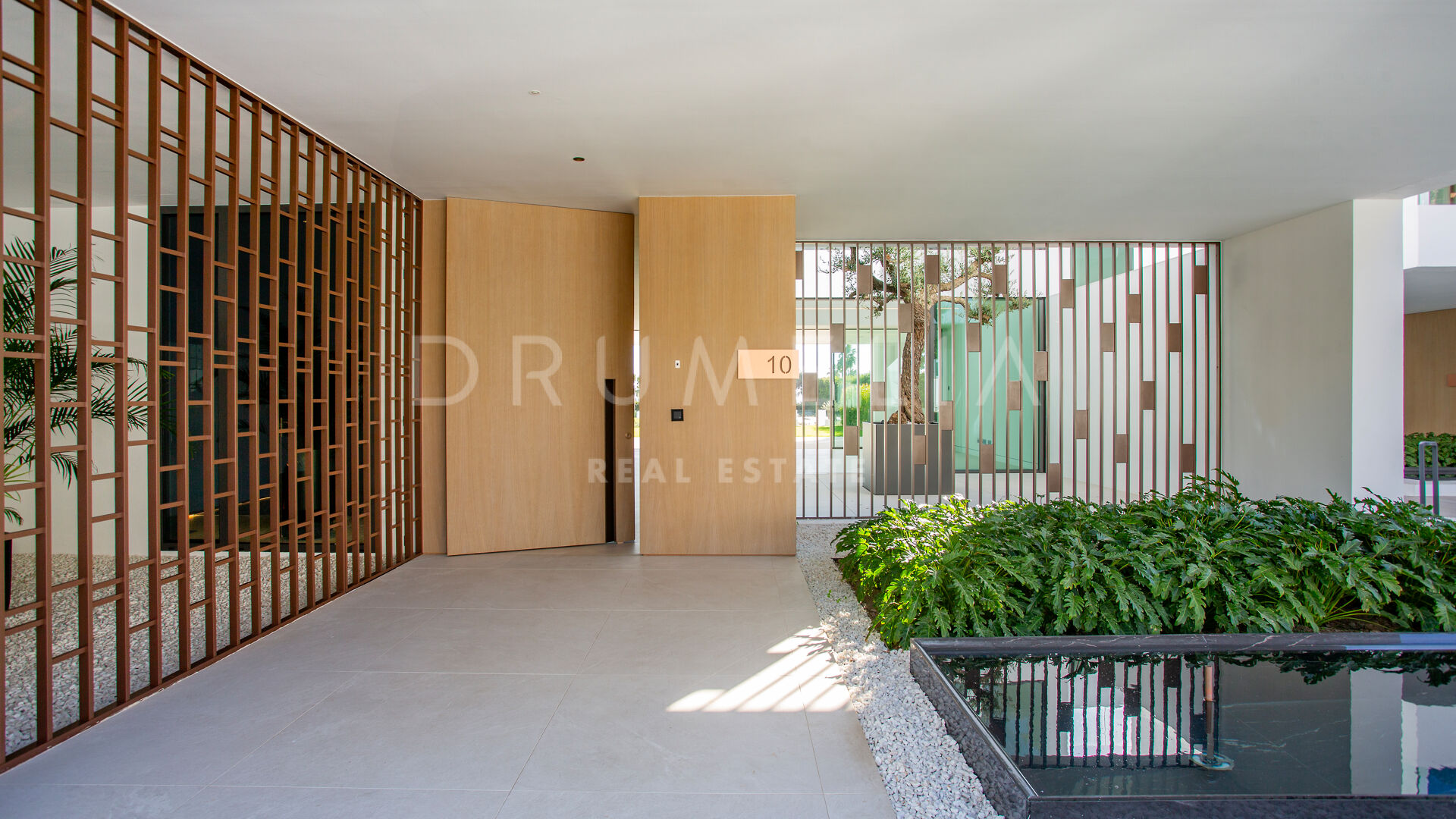Omgiven av liknande high-end fastigheter på Golden Mile, är denna perfekt utförda moderna fastighet bara en kort promenad från sandstranden, bara 250 meter, 5-stjärniga ikoniska hotell Puente Romano och Marbella Club, och alla bekvämligheter, men ändå ger en känsla av lugn att vara inbäddad i en exklusiv gated residens med 24-timmars säkerhetstjänst, förtjusande anlagda trädgårdar och en stor pool. Glamorösa Puerto Banus, yachter, kasino, nattklubbar och andra äventyr finns alla nära till hands, liksom Marbellas gamla centrum och Golf Valley of Nueva Andalucía.