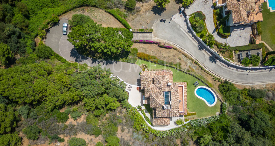 Den stora tomten på 2 765 m² ger en hög grad av integritet. En svepande uppfart leder dig till garaget och ingången till huset på 519 m². Fastigheten hade bara en ägare som ursprungligen byggde familjehemmet 2009. Den spektakulära arkitekturen i medelhavsstil smälter perfekt in i den pittoreska omgivningen. Villan vetter mot syd/öst och har sol, dagsljus, spektakulär utsikt och utsökt lugn. Villan erbjuder lyx och komfort och är fördelad på 3 nivåer. På bottenvåningen finns ett öppet mottagningsrum med en mysig lounge och stor matplats, som leder ut till den omfattande täckta terrassen med magnifik havsutsikt. Ett nyligen utrustat modernt kök, frukostområde och 2 sovrum som delar ett badrum kompletterar denna nivå. Utanför är Medelhavsträdgården vackert anlagd och har en privat pool. På övervåningen finns 2 sovrumssviter. Både en härlig master-svit med ett lugnt sovrum, eget badrum och klädkammare och ett annat sovrum med eget badrum har tillgång till en stor terrass med fantastisk havspanorama. I källaren finns ett multifunktionellt rum på över 80 m² som kan användas för ytterligare sovrum, gym, hemmabio etc. På denna lägre nivå finns också ett maskinrum och tvättstuga.