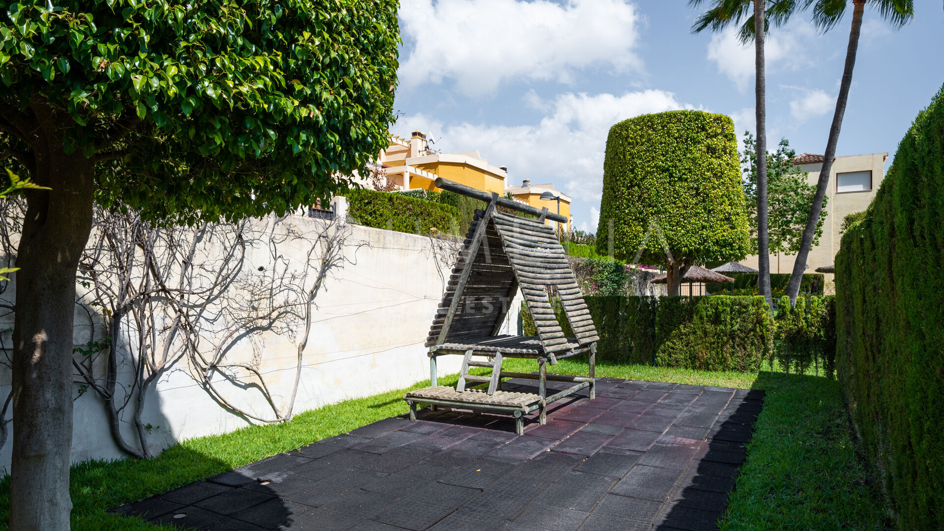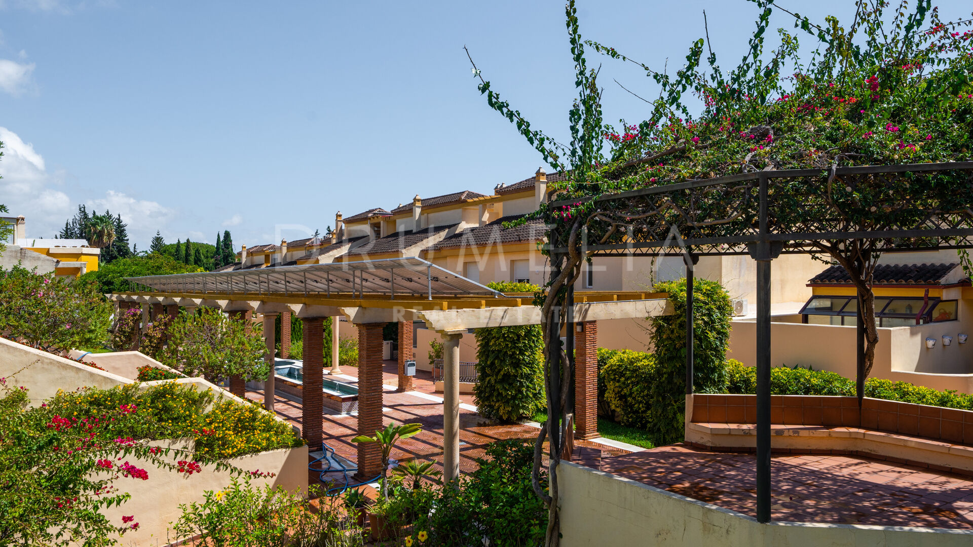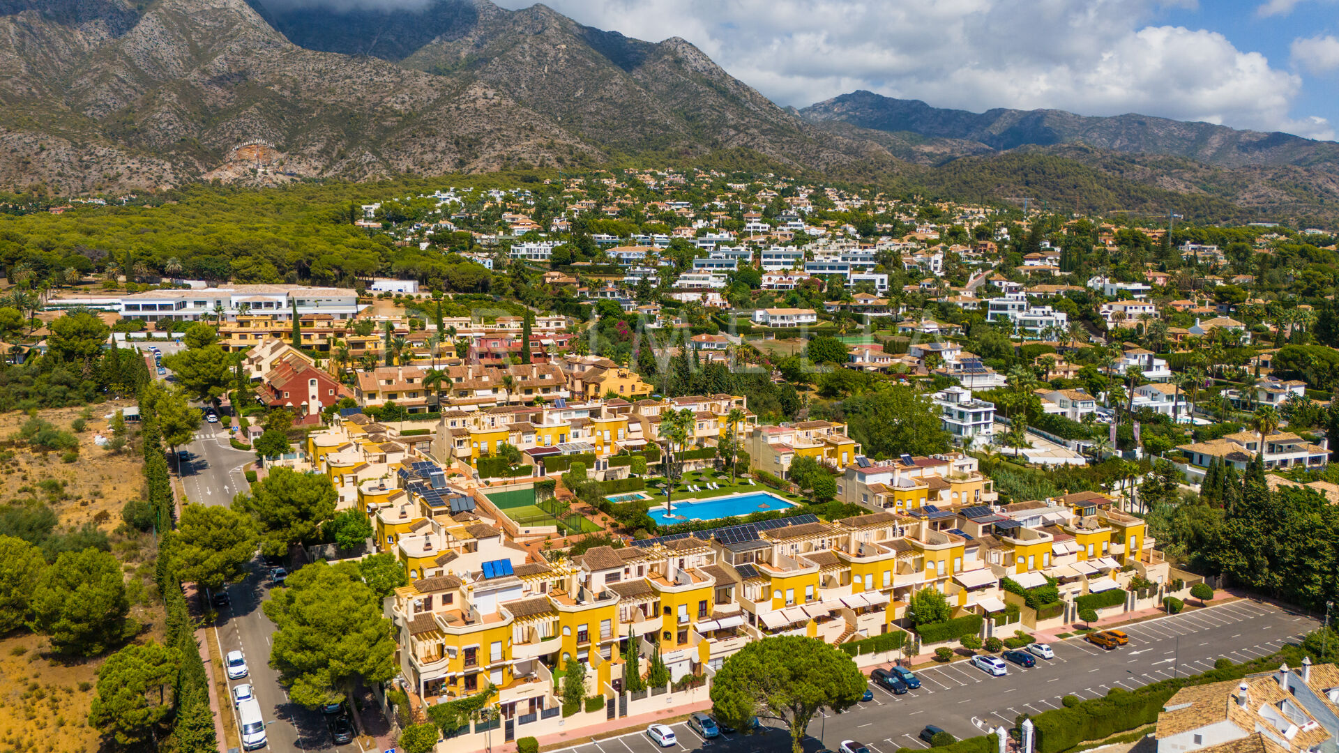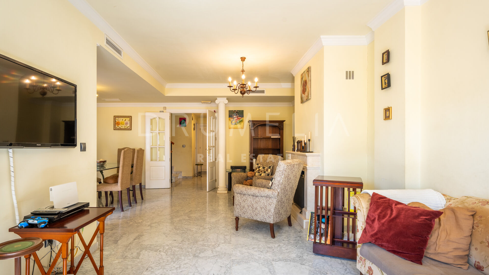 Ett radhus med 4 sovrum och stor potential erbjuds till försäljning i hjärtat av den berömda Golden Mile i Marbella, med det glittrande Medelhavet framför och dramatiska andalusiska berg bakom. Det gröna och lugna samhället Rocío de Nagüeles är ett av Marbellas mest prestigefyllda, eftertraktade och mogna stadsdelar, som grundades på 1970-talet av en affärsman och före detta tjurfäktare Manuel Gonzalez. Omgivet av subtropisk grönska och lyxfastigheter på Golden Mile, är det väl betjänat av alla typer av lokala bekvämligheter, inklusive internationella restauranger, barer och stormarknader. Det är kort avstånd till stränderna och trendiga strandklubbar, restauranger med Michelinstjärnor, designerbutiker, golfbanor, SPA, nattklubbar, flera internationella skolor, medicinska tjänster, affärscentrum etc. Alla lyxiga bekvämligheter på de legendariska hotellen Marbella Club och Puente Romano och marinan i Puerto Banús ligger bokstavligen inom några minuter. Fastigheten ligger på en återvändsgränd och ger en lugn miljö, samtidigt som den har enkel tillgång till motorvägen och ligger inom 5 minuters bilresa till både Marbella centrum och Puerto Banus.