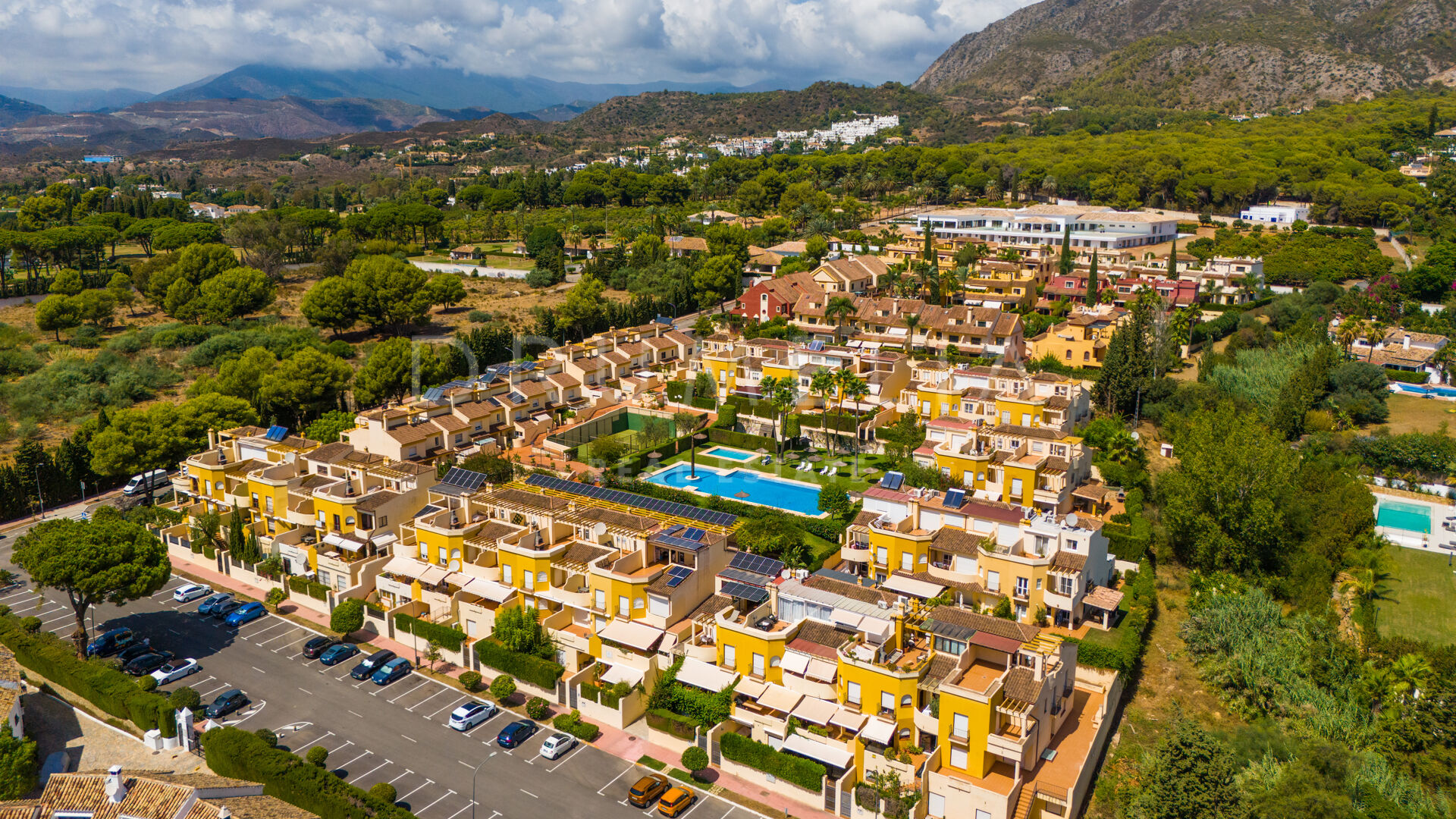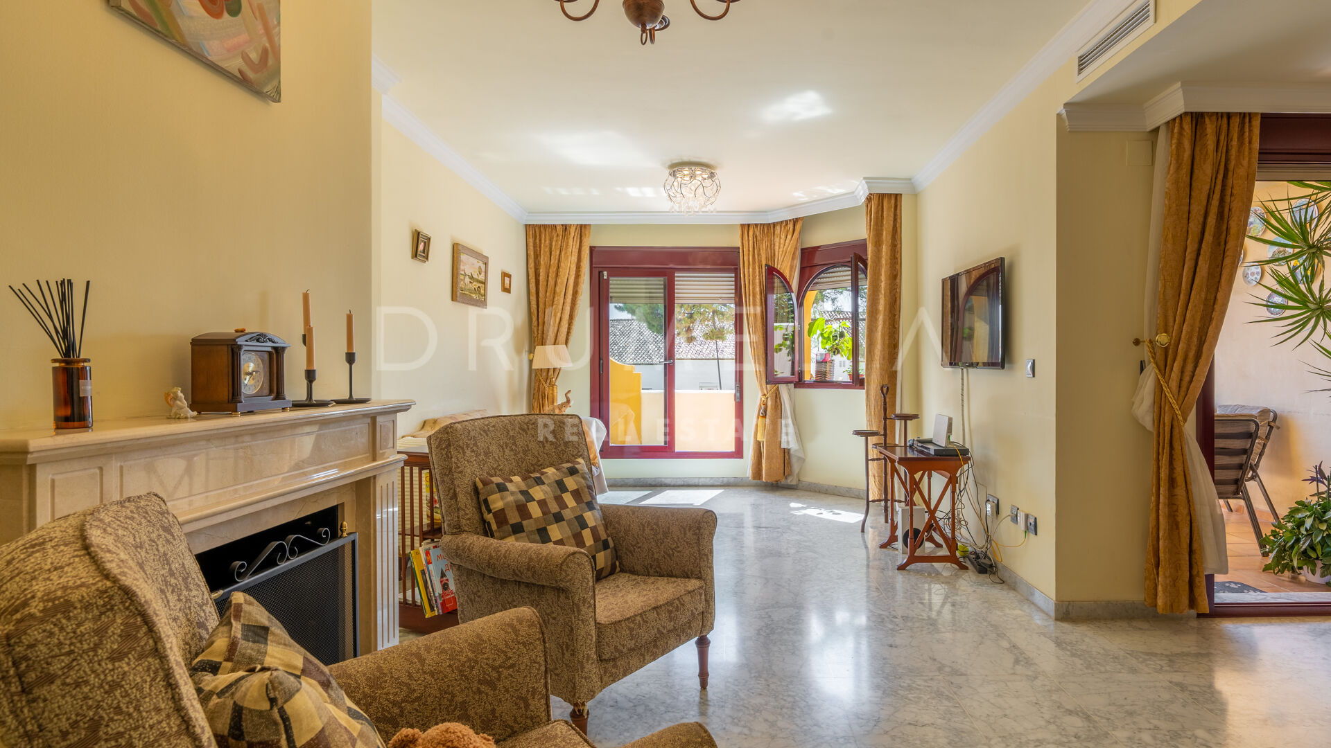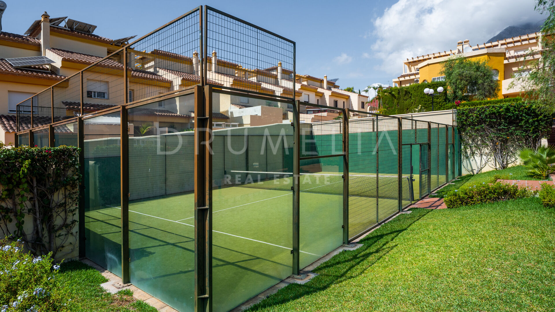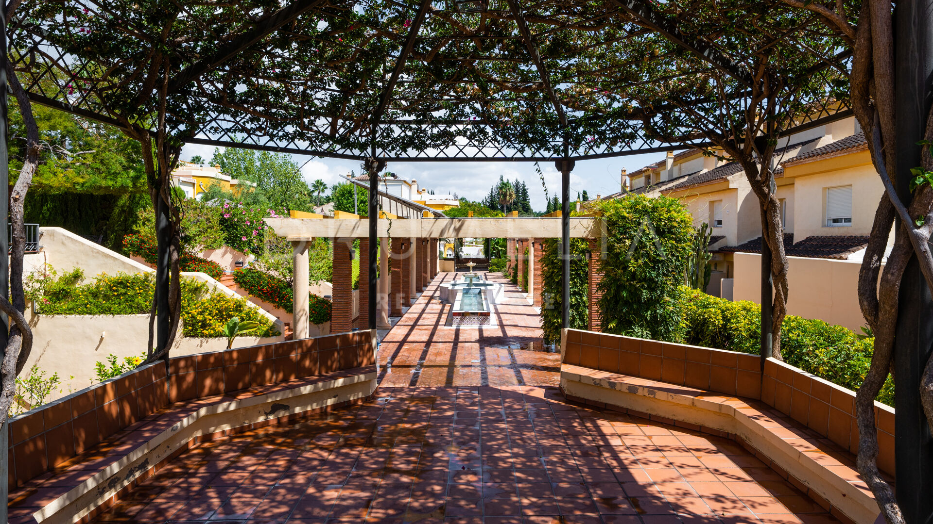 Ett radhus med 4 sovrum och stor potential erbjuds till försäljning i hjärtat av den berömda Golden Mile i Marbella, med det glittrande Medelhavet framför och dramatiska andalusiska berg bakom. Det gröna och lugna samhället Rocío de Nagüeles är ett av Marbellas mest prestigefyllda, eftertraktade och mogna stadsdelar, som grundades på 1970-talet av en affärsman och före detta tjurfäktare Manuel Gonzalez. Omgivet av subtropisk grönska och lyxfastigheter på Golden Mile, är det väl betjänat av alla typer av lokala bekvämligheter, inklusive internationella restauranger, barer och stormarknader. Det är kort avstånd till stränderna och trendiga strandklubbar, restauranger med Michelinstjärnor, designerbutiker, golfbanor, SPA, nattklubbar, flera internationella skolor, medicinska tjänster, affärscentrum etc. Alla lyxiga bekvämligheter på de legendariska hotellen Marbella Club och Puente Romano och marinan i Puerto Banús ligger bokstavligen inom några minuter. Fastigheten ligger på en återvändsgränd och ger en lugn miljö, samtidigt som den har enkel tillgång till motorvägen och ligger inom 5 minuters bilresa till både Marbella centrum och Puerto Banus.