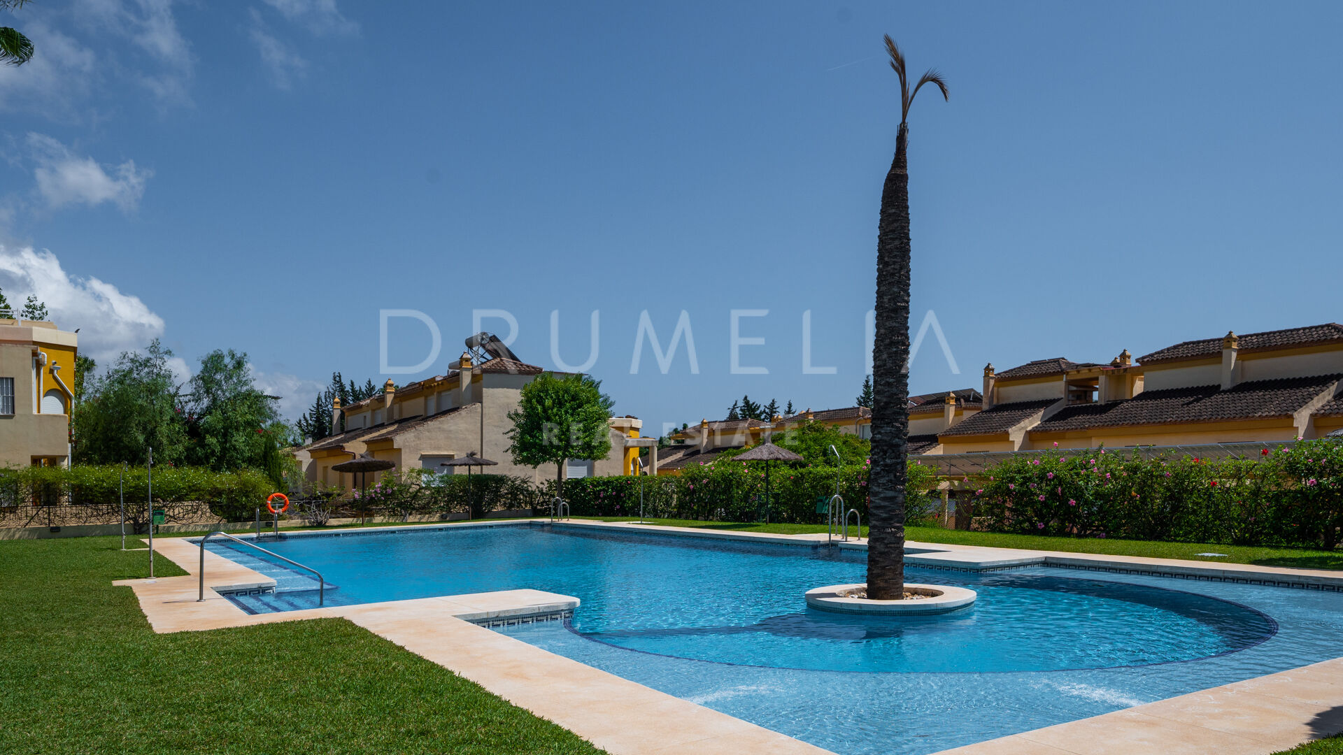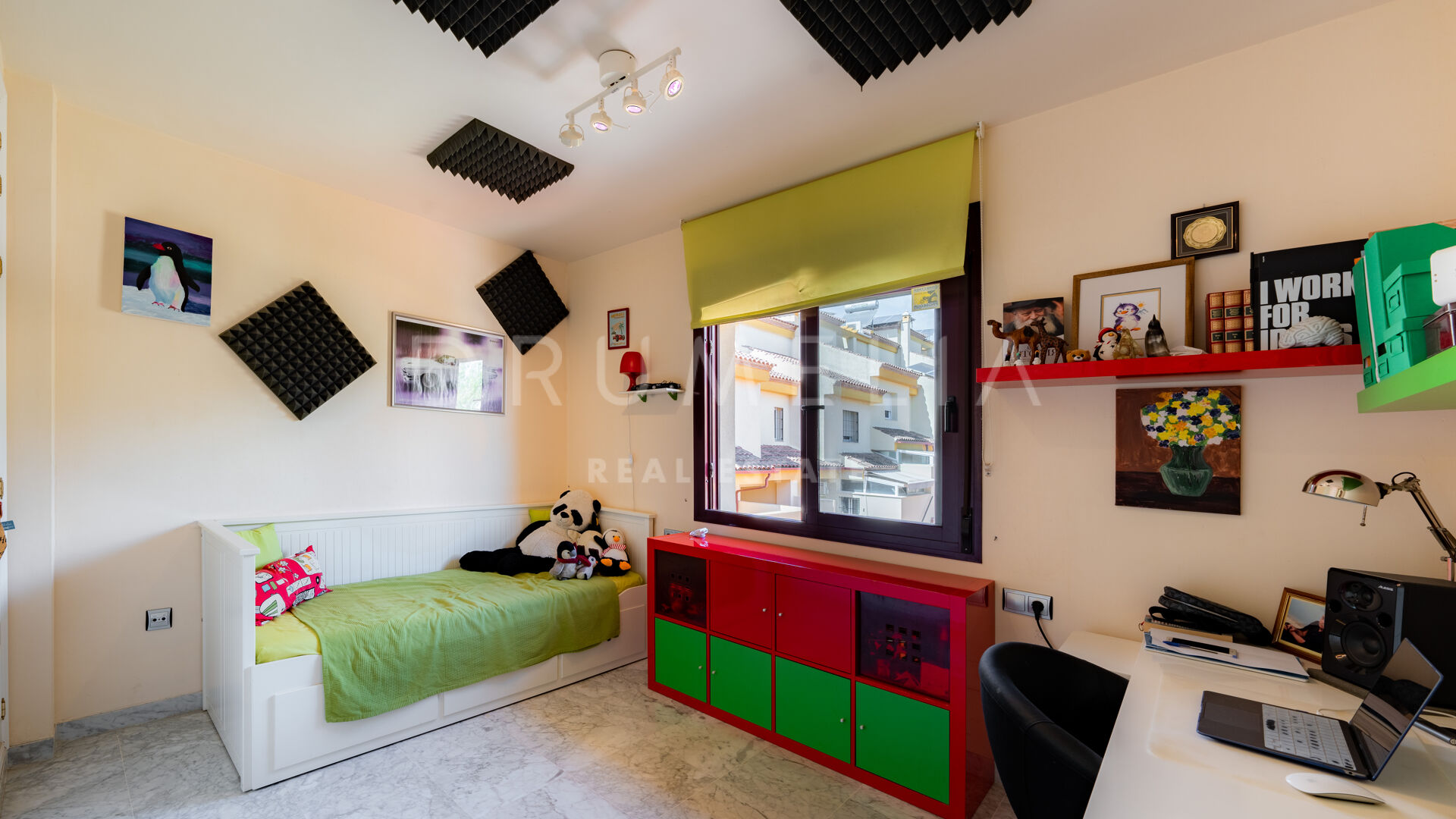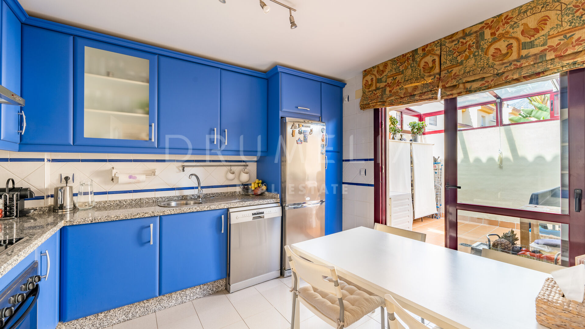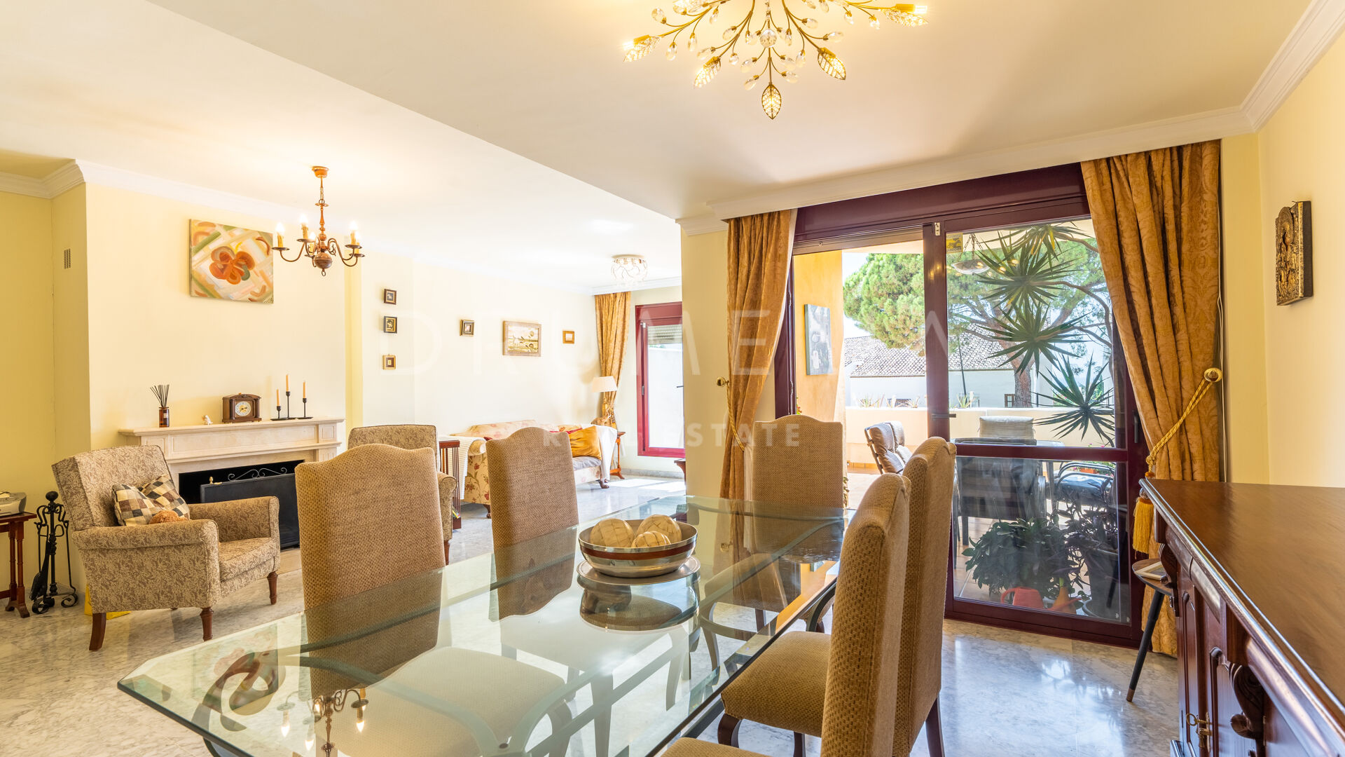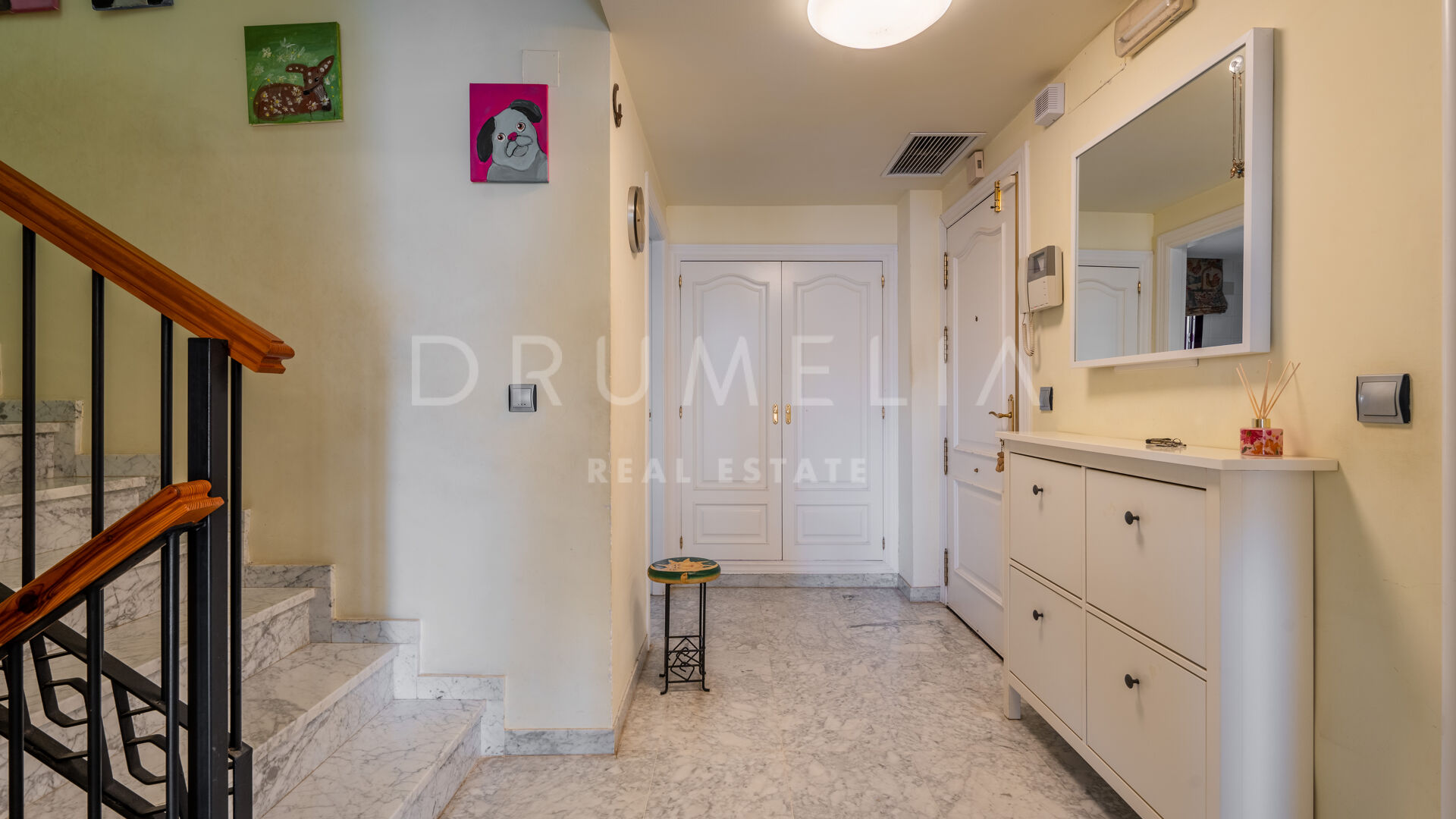 Ett radhus med 4 sovrum och stor potential erbjuds till försäljning i hjärtat av den berömda Golden Mile i Marbella, med det glittrande Medelhavet framför och dramatiska andalusiska berg bakom. Det gröna och lugna samhället Rocío de Nagüeles är ett av Marbellas mest prestigefyllda, eftertraktade och mogna stadsdelar, som grundades på 1970-talet av en affärsman och före detta tjurfäktare Manuel Gonzalez. Omgivet av subtropisk grönska och lyxfastigheter på Golden Mile, är det väl betjänat av alla typer av lokala bekvämligheter, inklusive internationella restauranger, barer och stormarknader. Det är kort avstånd till stränderna och trendiga strandklubbar, restauranger med Michelinstjärnor, designerbutiker, golfbanor, SPA, nattklubbar, flera internationella skolor, medicinska tjänster, affärscentrum etc. Alla lyxiga bekvämligheter på de legendariska hotellen Marbella Club och Puente Romano och marinan i Puerto Banús ligger bokstavligen inom några minuter. Fastigheten ligger på en återvändsgränd och ger en lugn miljö, samtidigt som den har enkel tillgång till motorvägen och ligger inom 5 minuters bilresa till både Marbella centrum och Puerto Banus.
