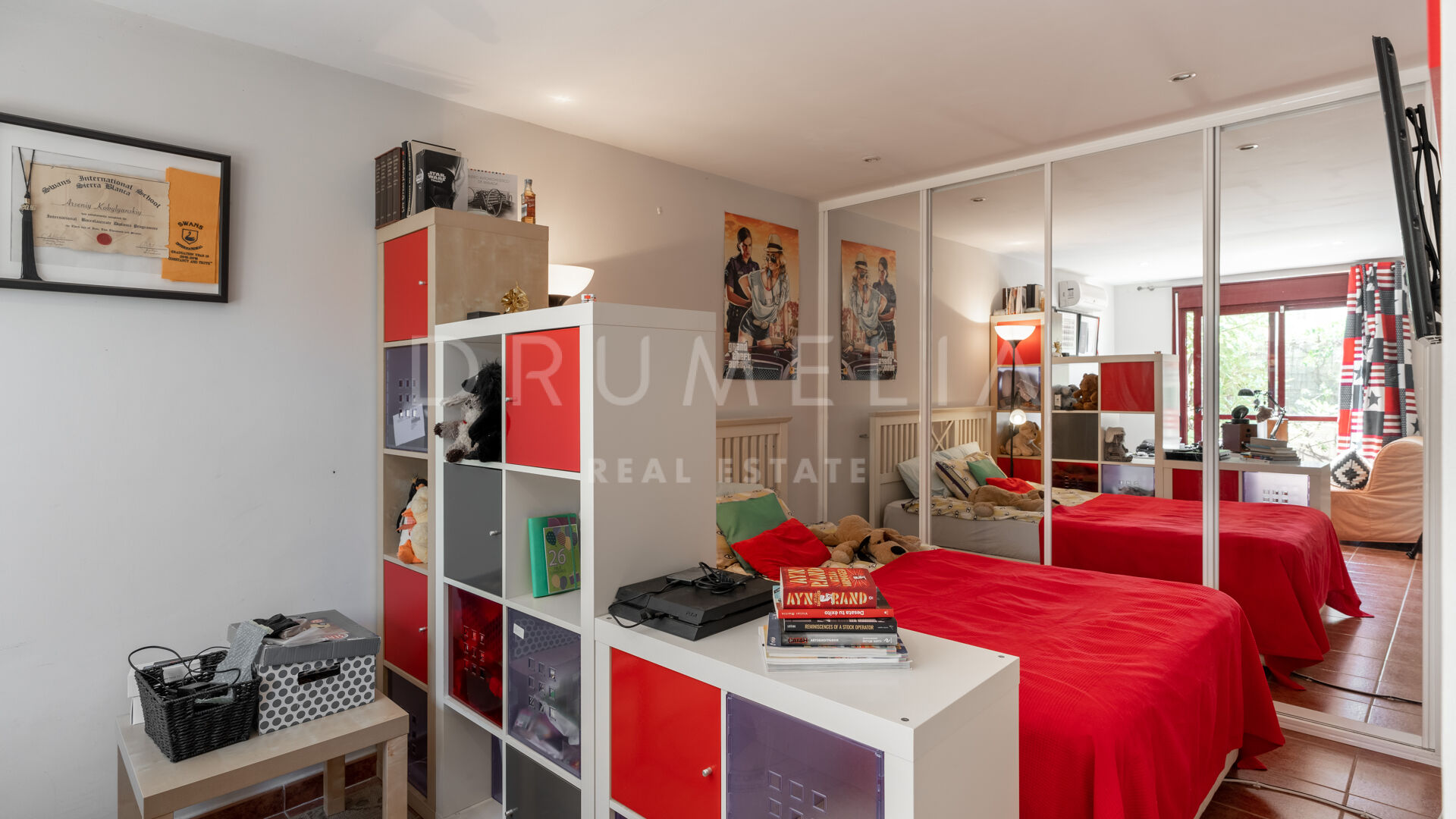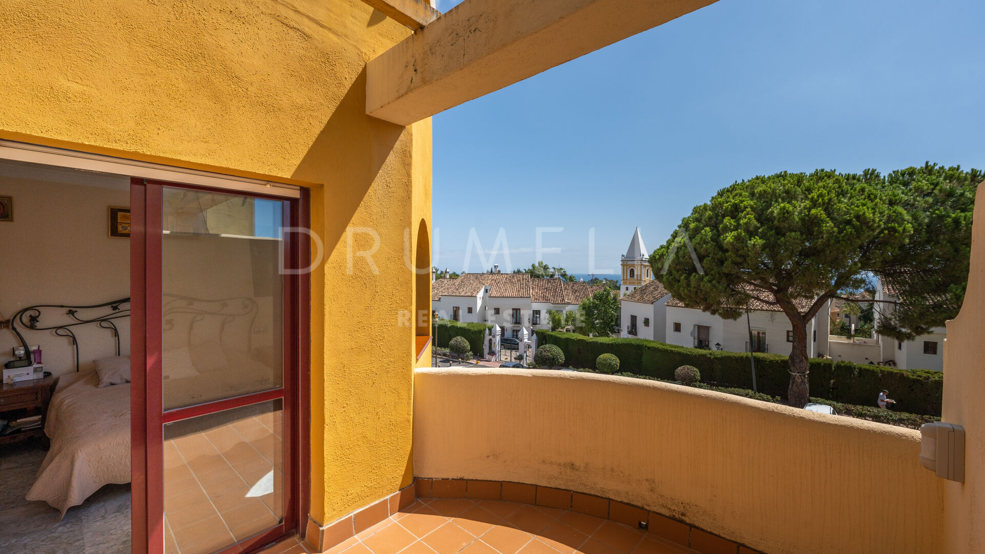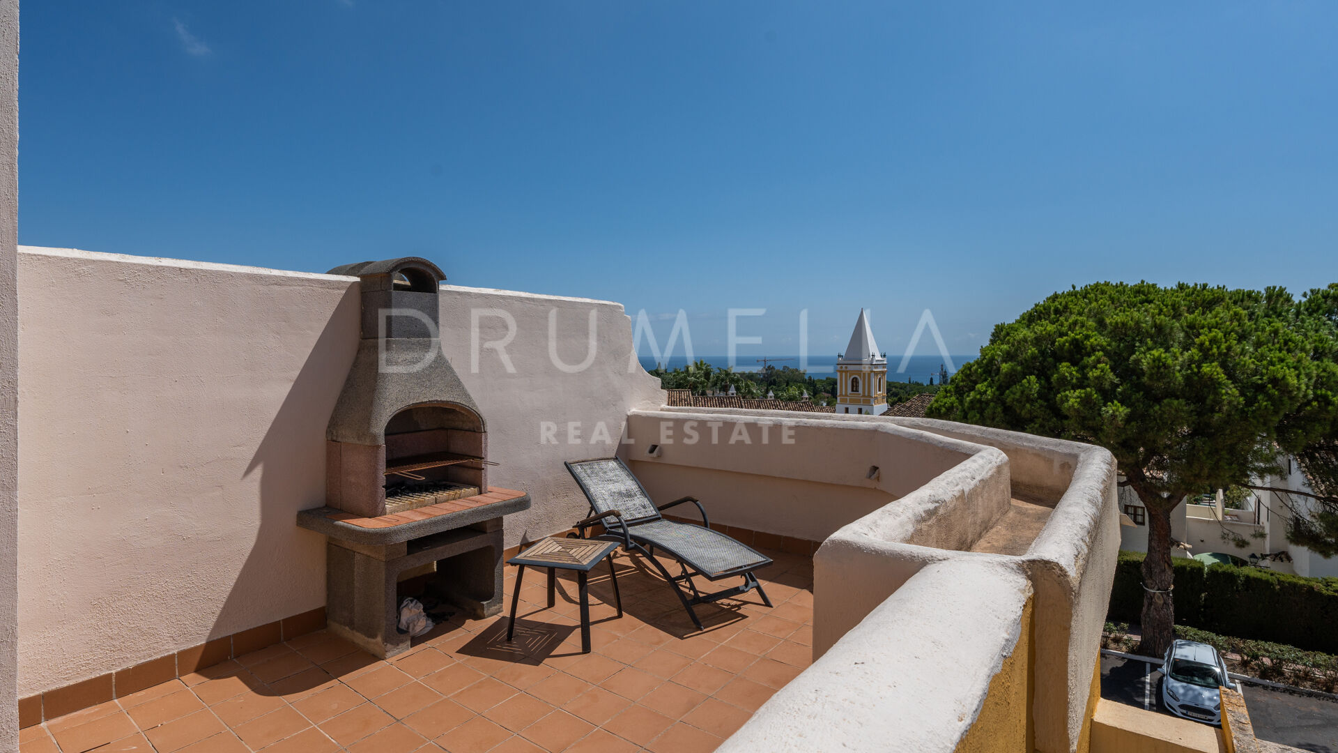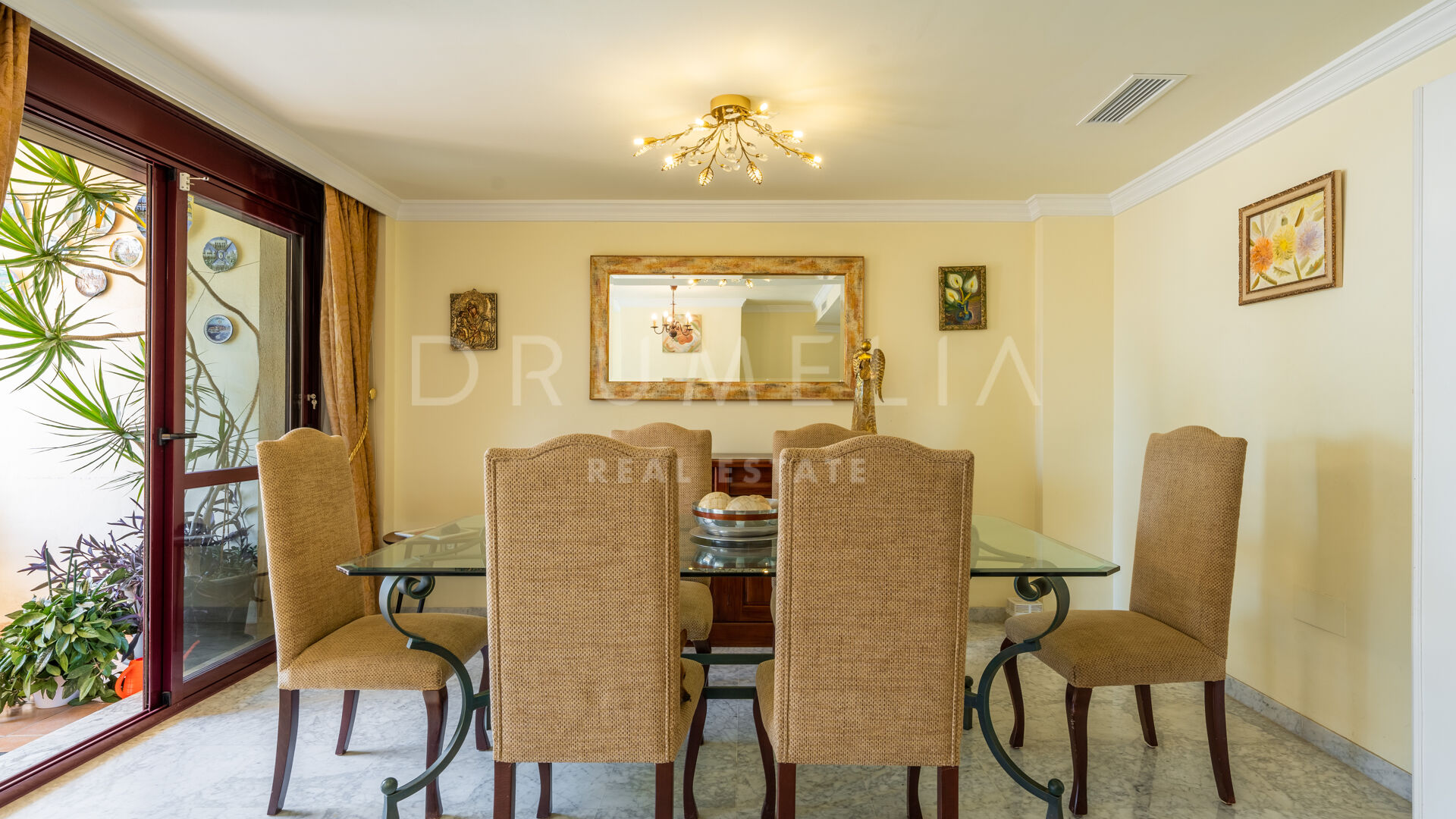 Ett radhus med 4 sovrum och stor potential erbjuds till försäljning i hjärtat av den berömda Golden Mile i Marbella, med det glittrande Medelhavet framför och dramatiska andalusiska berg bakom. Det gröna och lugna samhället Rocío de Nagüeles är ett av Marbellas mest prestigefyllda, eftertraktade och mogna stadsdelar, som grundades på 1970-talet av en affärsman och före detta tjurfäktare Manuel Gonzalez. Omgivet av subtropisk grönska och lyxfastigheter på Golden Mile, är det väl betjänat av alla typer av lokala bekvämligheter, inklusive internationella restauranger, barer och stormarknader. Det är kort avstånd till stränderna och trendiga strandklubbar, restauranger med Michelinstjärnor, designerbutiker, golfbanor, SPA, nattklubbar, flera internationella skolor, medicinska tjänster, affärscentrum etc. Alla lyxiga bekvämligheter på de legendariska hotellen Marbella Club och Puente Romano och marinan i Puerto Banús ligger bokstavligen inom några minuter. Fastigheten ligger på en återvändsgränd och ger en lugn miljö, samtidigt som den har enkel tillgång till motorvägen och ligger inom 5 minuters bilresa till både Marbella centrum och Puerto Banus.