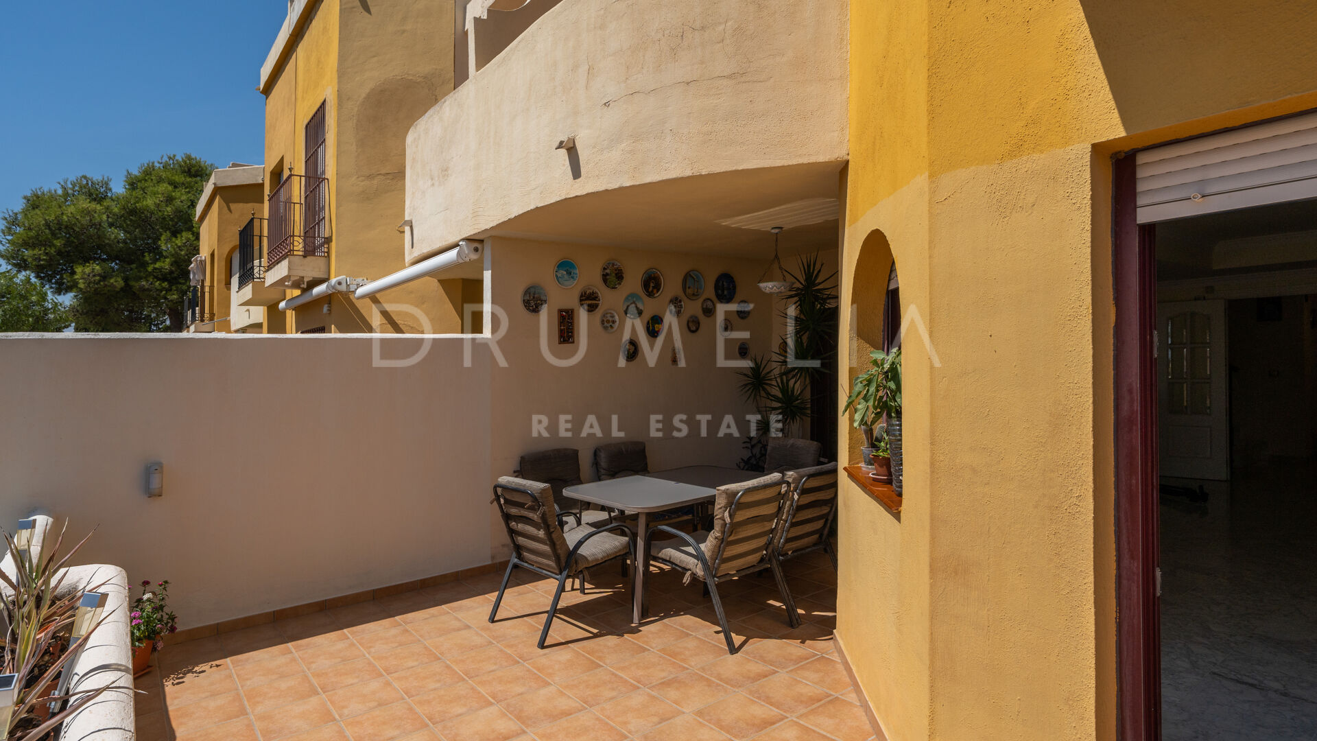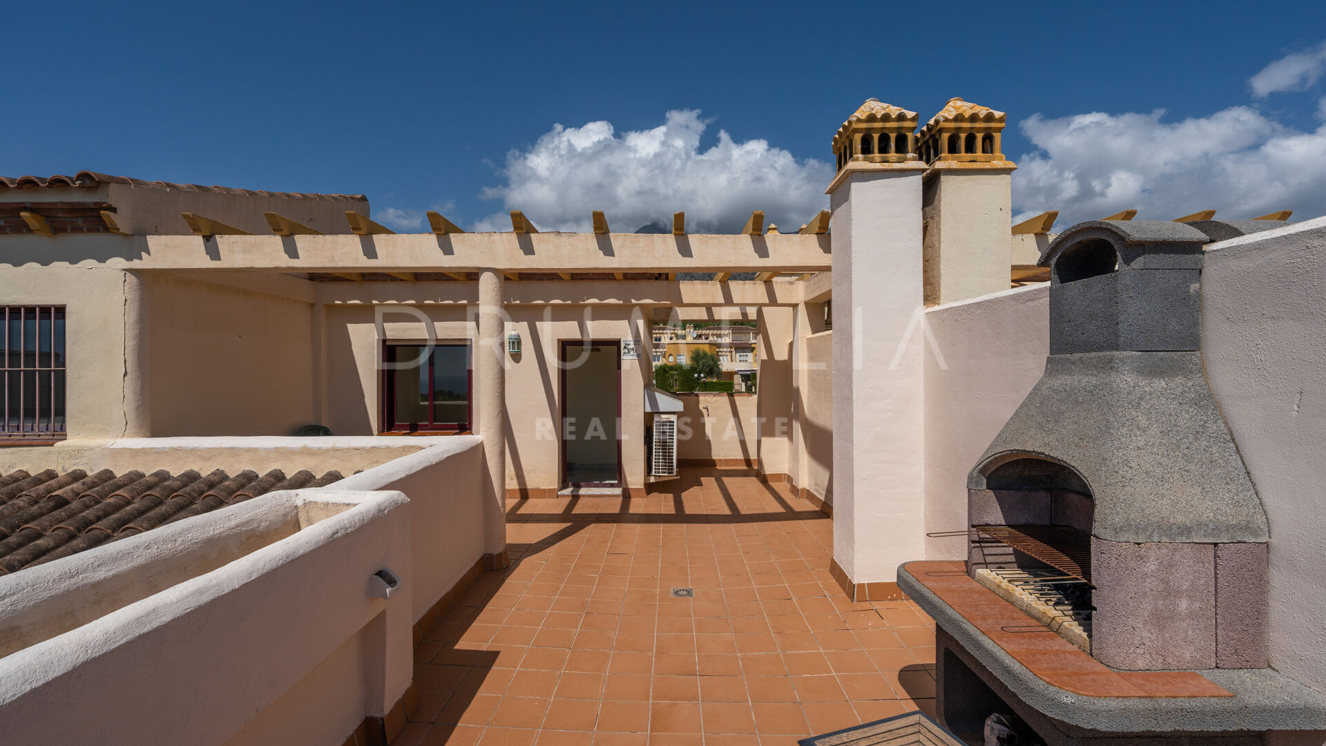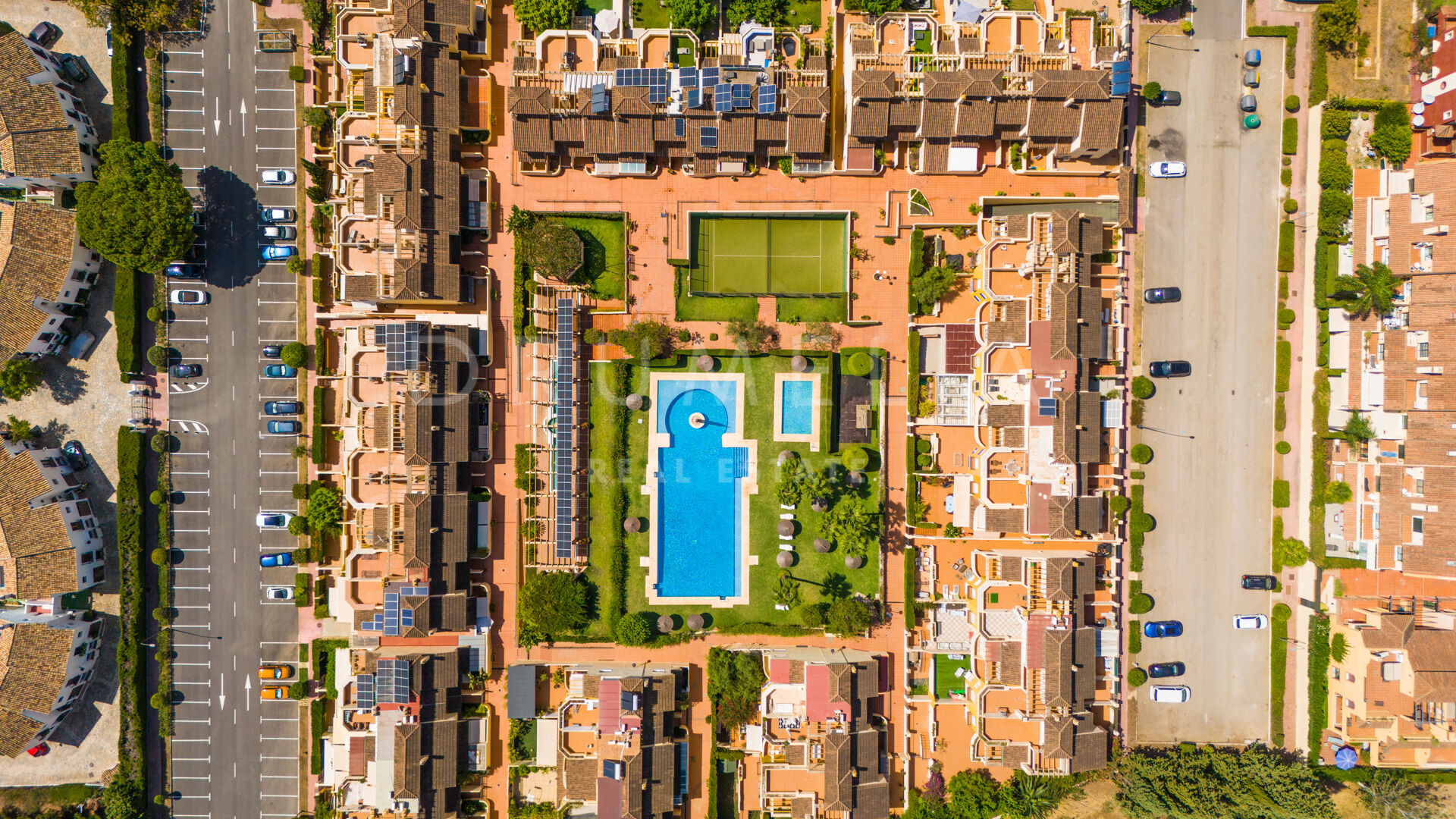 Den attraktiva fastigheten i söderläge har härlig havsutsikt och en lugn miljö i ett gated community med stora gemensamma utrymmen, en pool för vuxna och barn, en paddeltennisbana och en trädgård med vackra fontäner för att ge en touch av elegans och charm till omgivningen. Det 343 m² stora radhuset är fördelat på 4 våningar med 2 ingångar, en genom den främre delen av huset och den andra via de gemensamma utrymmena. På bottenvåningen har du ett rymligt vardagsrum som kan förlängas genom att stänga en del av terrassen, en gästtoalett och ett fullt utrustat kök. Dessutom finns det ett stort tvättstuga som har potential att förenas med köket för att skapa mer köksutrymme, vilket förbättrar funktionaliteten och praktiken. På första våningen finns en master-svit med eget badrum och en privat terrass med härlig havsutsikt. 2 gästrum på denna våning delar ett badrum. Solarium på översta nivån har också ett underbart panorama och har en inbyggd grill. Det kan delvis stängas för att skapa en fantastisk taklounge, extra kontor eller chill-out-utrymme, vilket ger flexibilitet och möjlighet att maximera användningen av fastigheten.