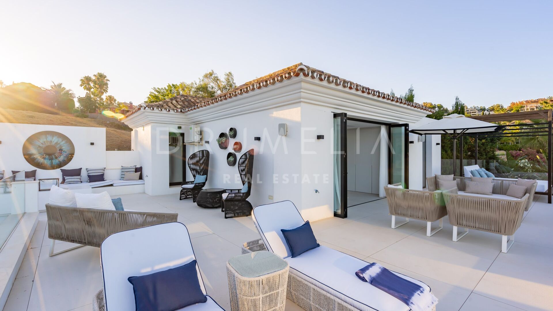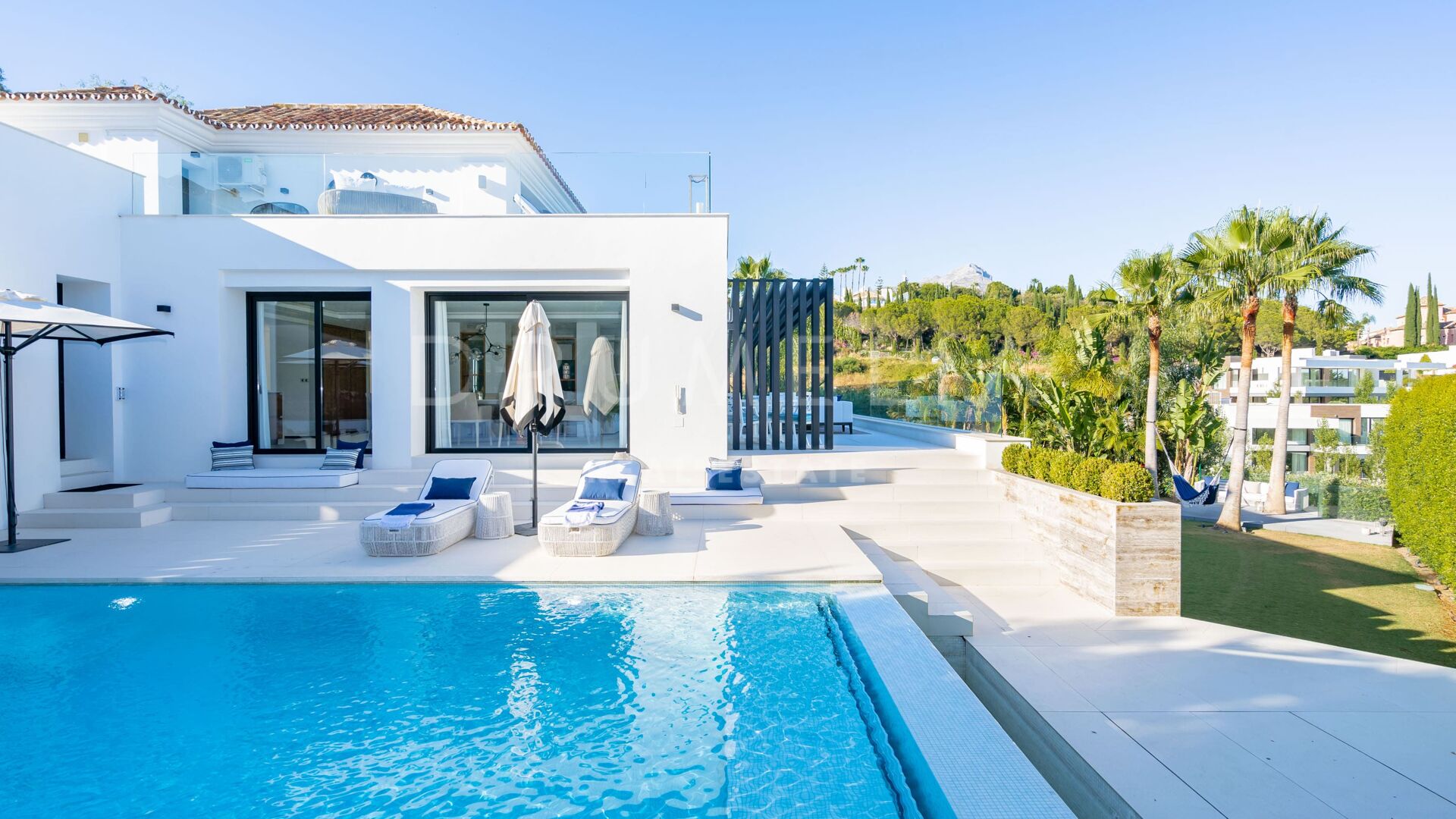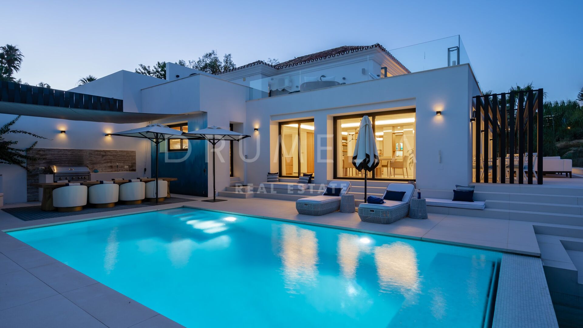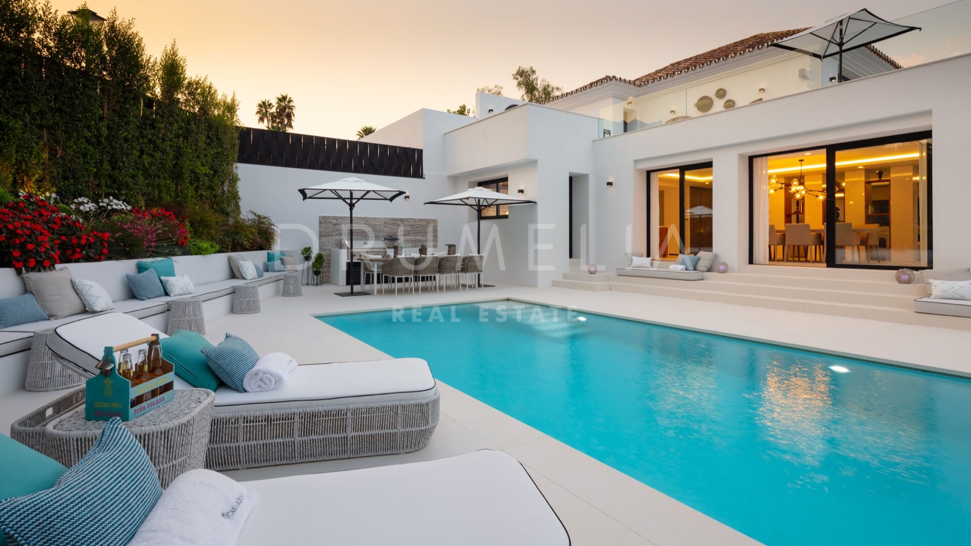 Denna eleganta villa till salu i ett utmärkt läge i Nueva Andalucía, Marbella, är platsen för att omfamna det fantastiska medelhavslivet när det är som bäst.