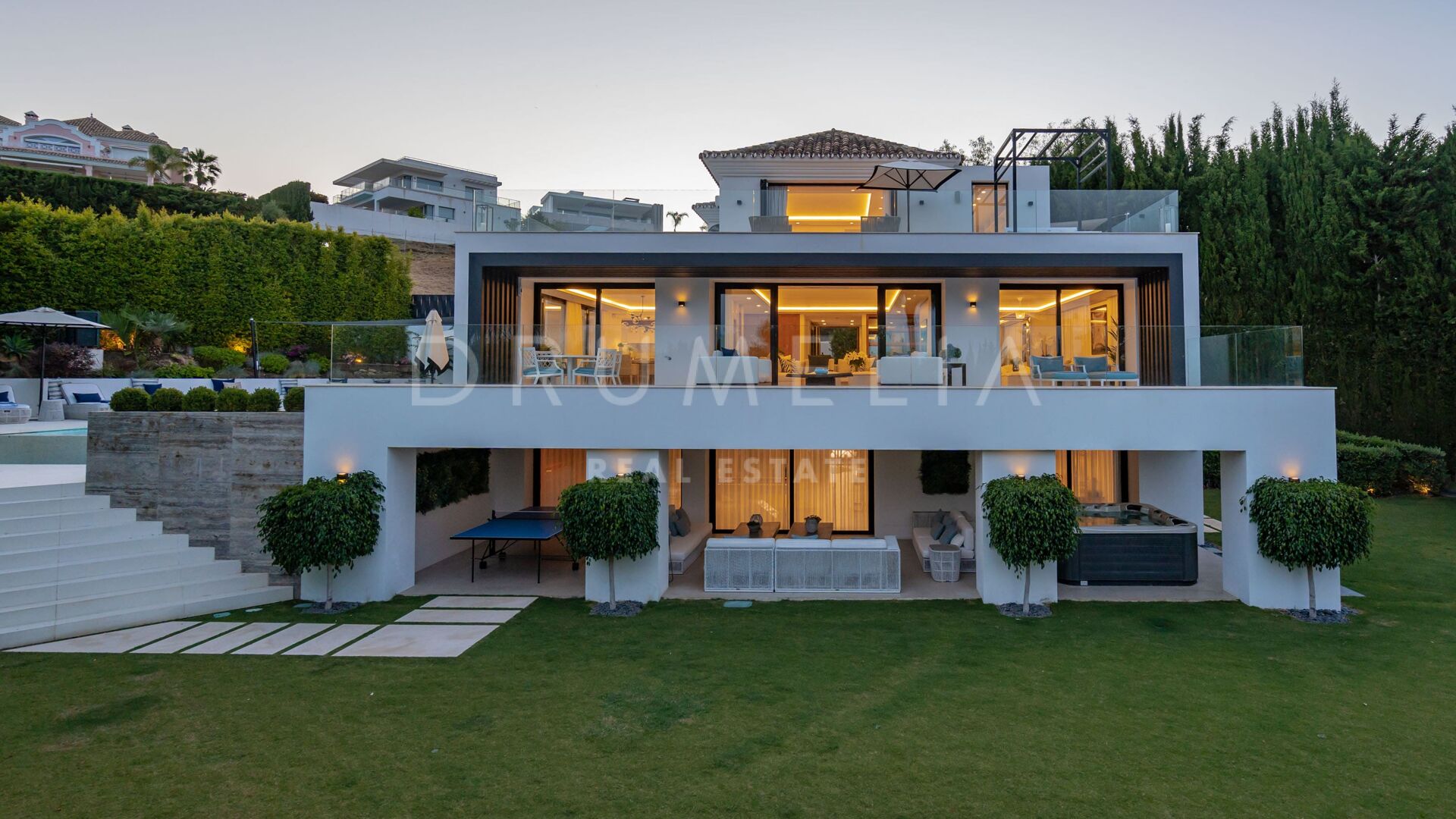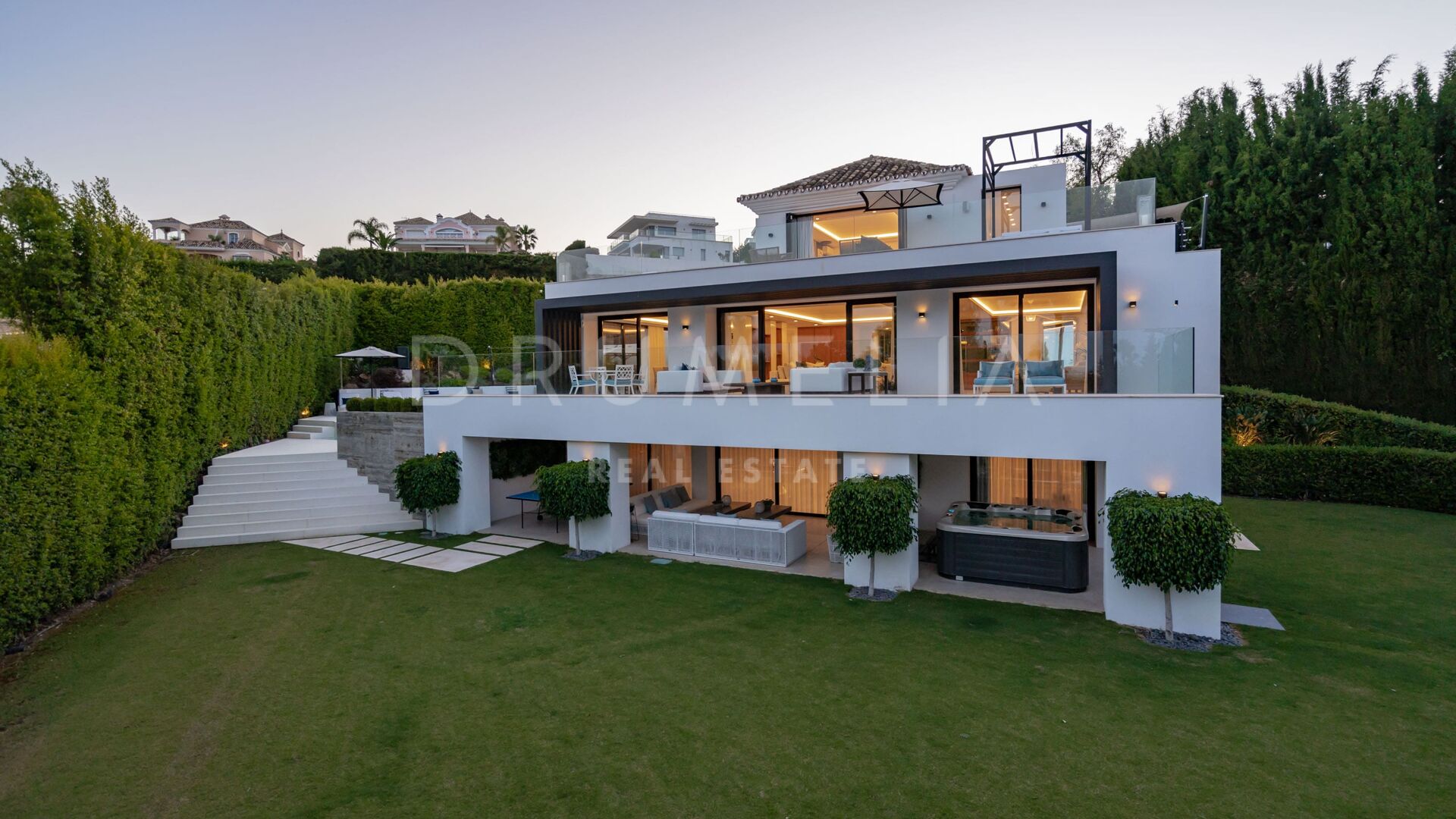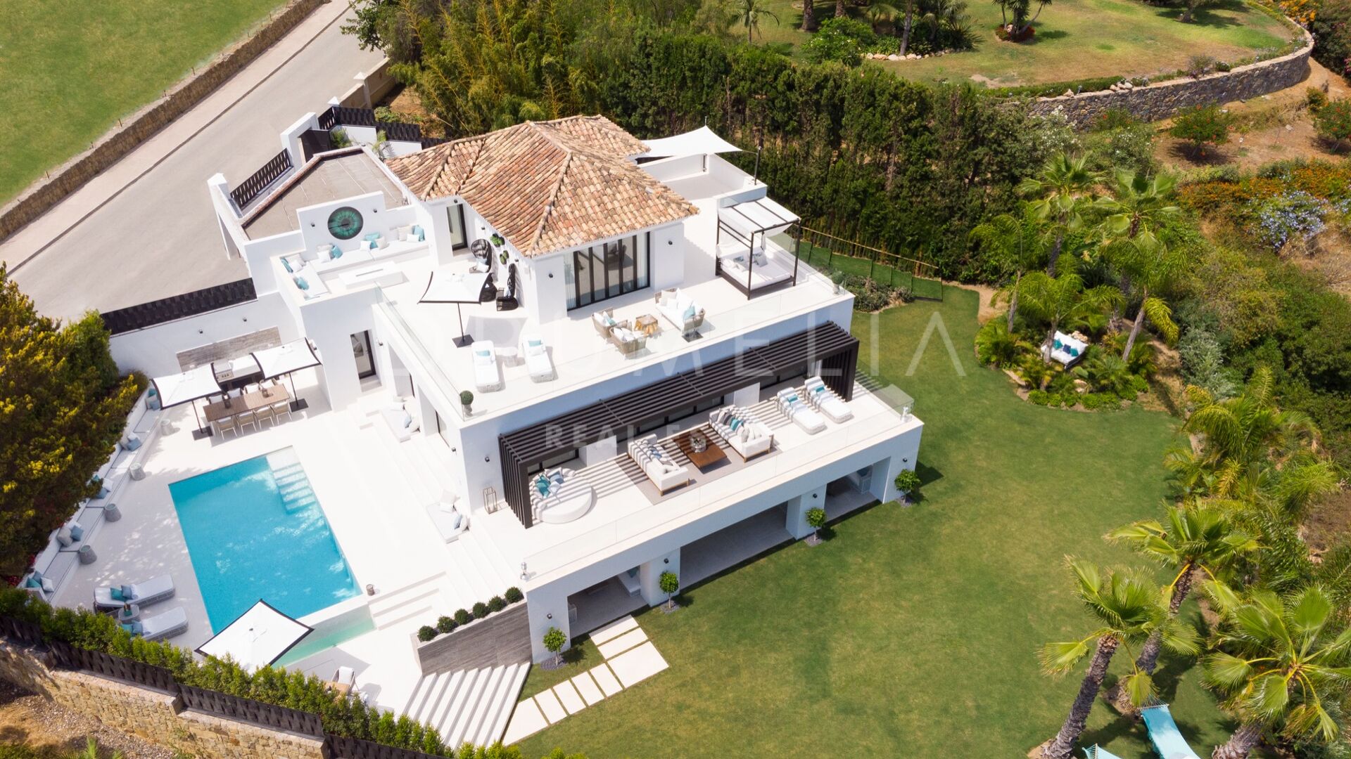 På en pittoresk tomt på 1 258 m² ligger det spektakulära moderna huset på 516 m² som är byggt på 3 våningar. Du kommer att njuta av högsta kvalitetsstandarder, utsökta arkitektoniska element och avskildhet av 5 sovrumsanpassningar med lyxiga badrum, ett stort vardagsrum med en trendig integrerad biokamin, ett öppet state-of-art elegant kök i anslutning till en matplats. Området för underhållning och nöjen är fantastiskt och omfattar ett spelrum, vinkällare, bar och tv-salong. Glasdörrarna öppnar upp vardagsrummen till de soliga och täckta stora terrasserna, privata balkonger solarium och utomhuslounger. Härifrån kan du beundra naturens lugna majestät och den härliga utsikten över de idylliska omgivningarna, en golfbana, bergen och havet. Huset har en underbar anlagd trädgård, tillsammans med en stor pool med soldäck och solbadplatser, och chill-out, grill och al fresco-matplatser.