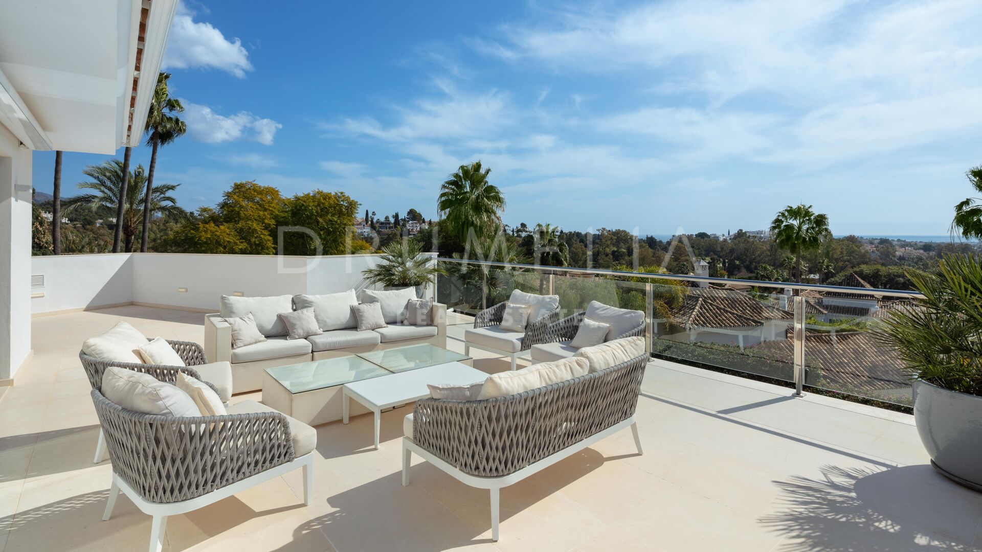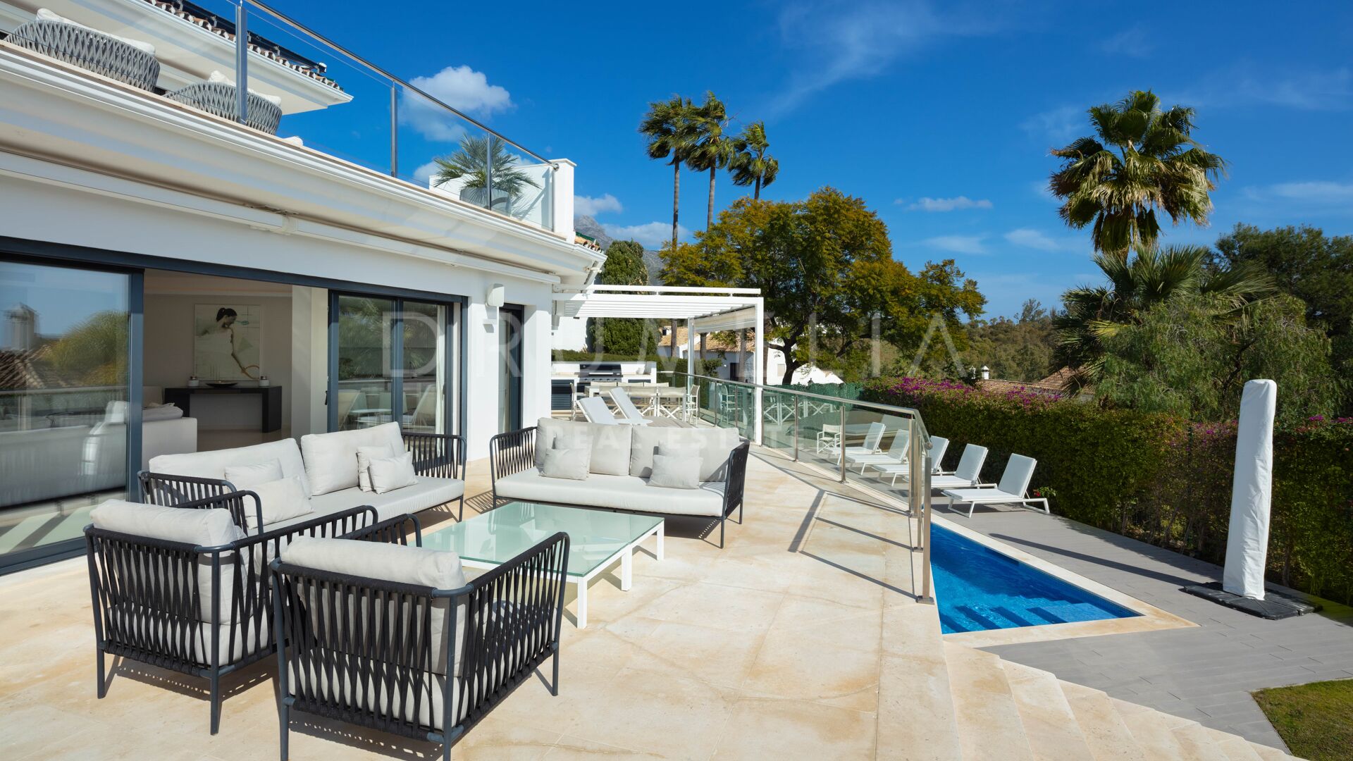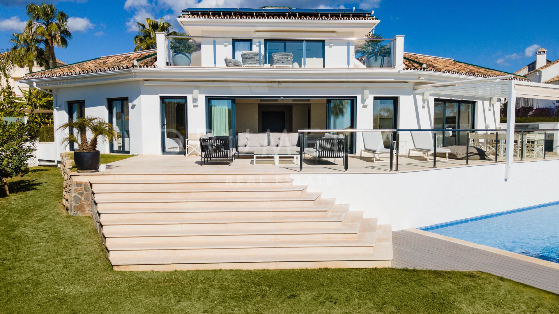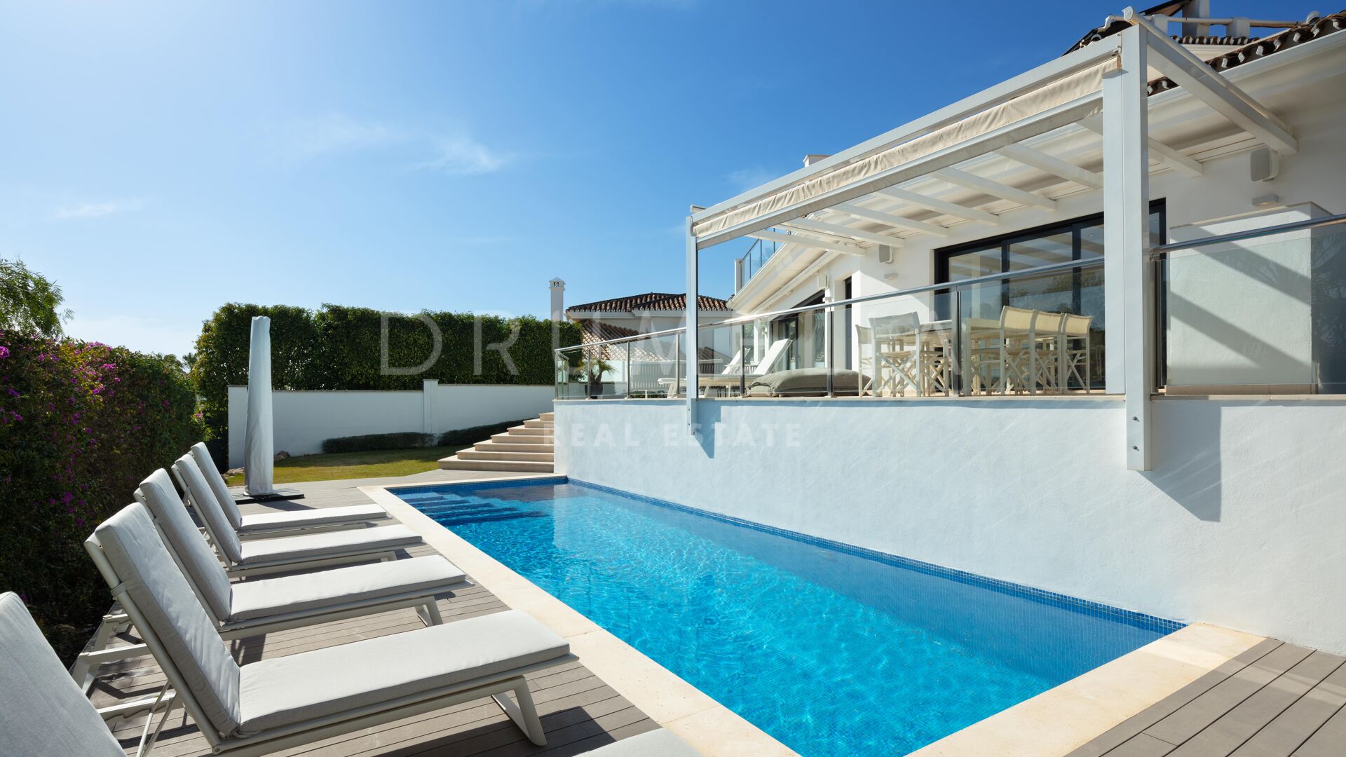 Denna helt nyrenoverade familjevilla till salu ligger i hjärtat av golfdalen i Nueva Andalucia, Marbella. Det gör det möjligt att njuta av modern atmosfär och alla bekvämligheter i det eleganta hemmet och dess bekväma läge bara några minuter från fantastiska golfbanor och alla bekvämligheter, inklusive internationella skolor, barer och restauranger, ekologiska kaféer, gatumarknad, tennisklubbar och gym, affärer och stormarknader, samt kasino, stränder med blå flagg, nattklubbar och strandklubbar i den världsberömda hamnen Banus.