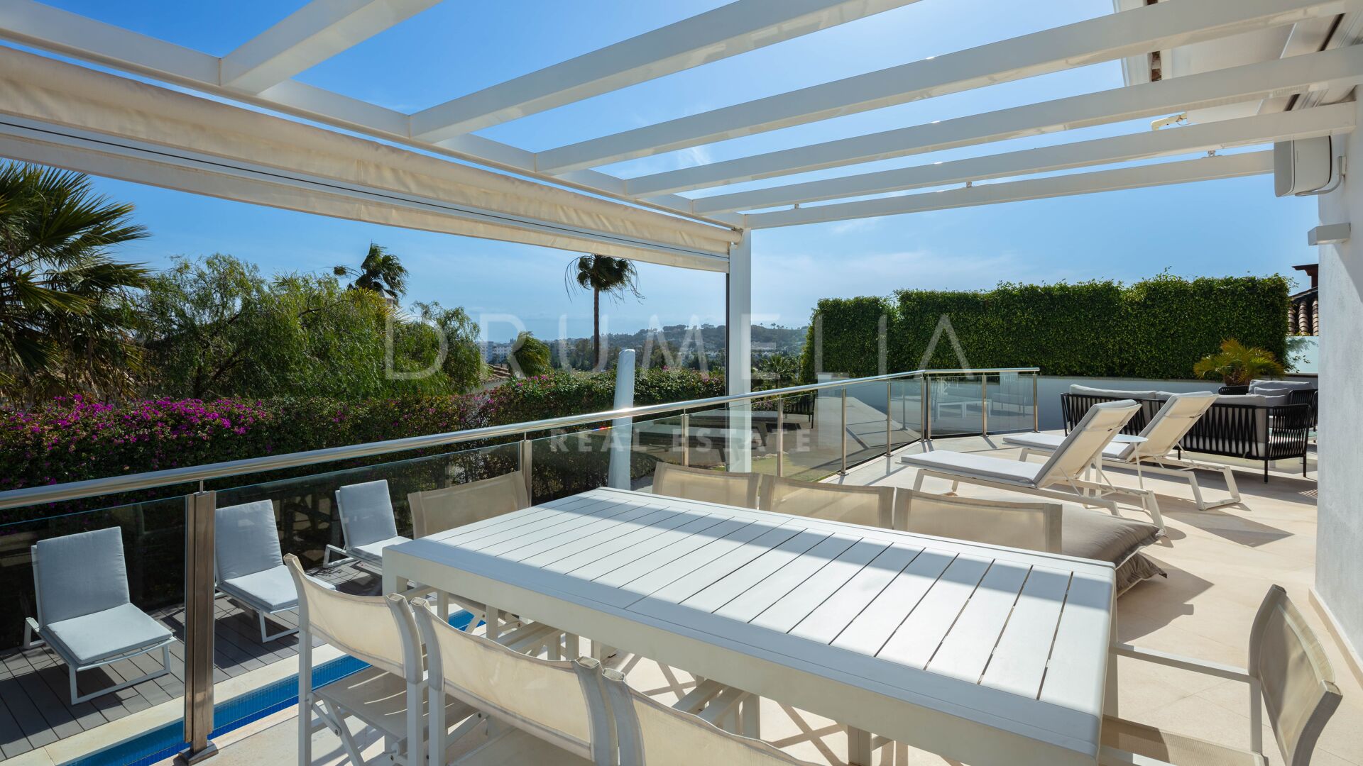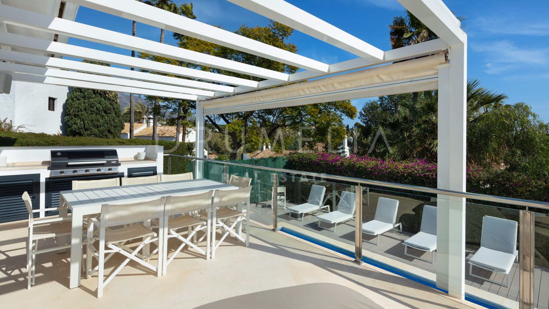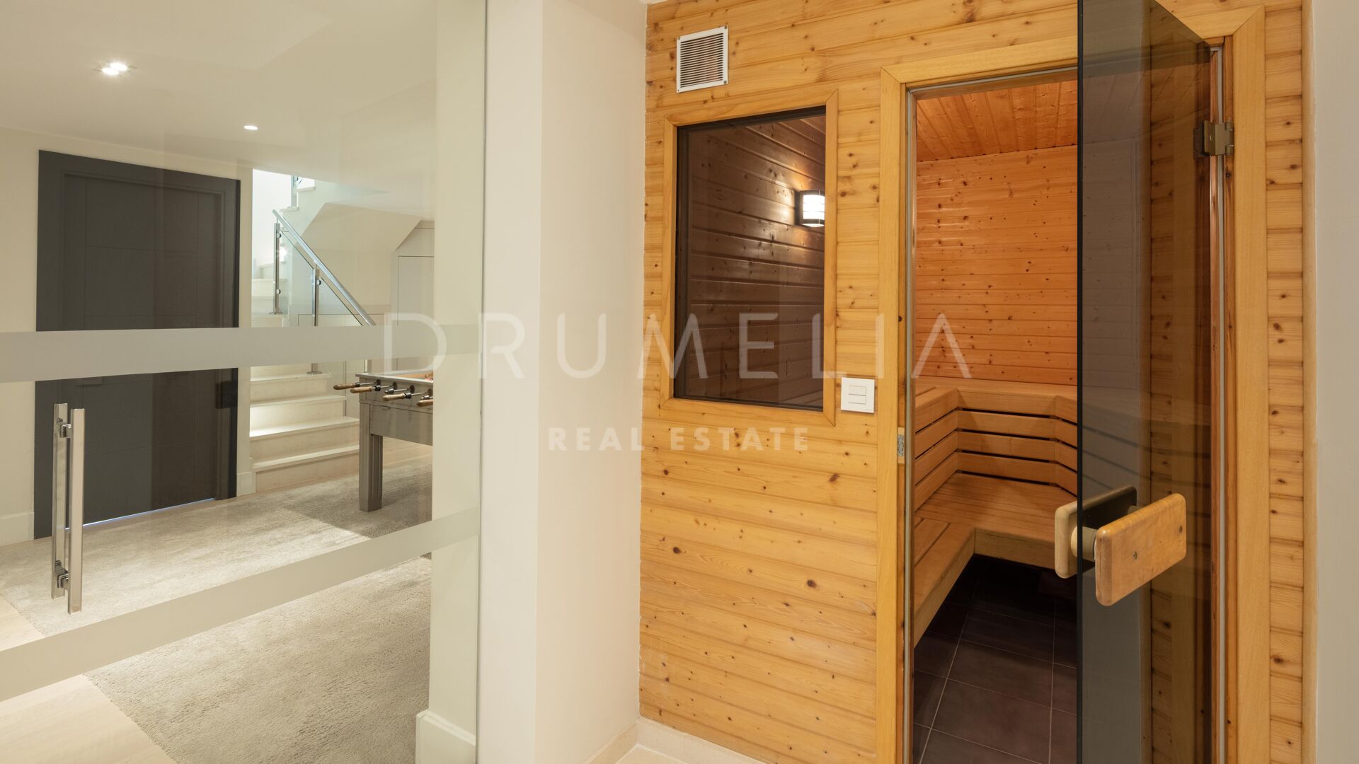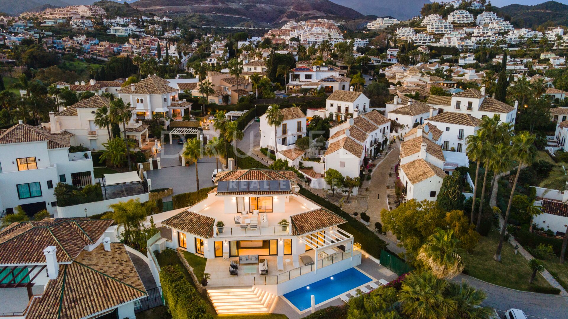 Omgiven av lyxiga fastigheter i Nueva Andalucia ligger det sydvända huset på 397 m² med 42 m² täckta och soliga terrasser på en pittoresk tomt på 931 m². Det kombinerar den spektakulära medelhavsarkitekturen och modern stilinteriör, vilket ger en trevlig atmosfär. Den högklassiga fastigheten är fördelad på 3 våningar och erbjuder öppen rymdplanering med mycket naturligt ljus. På entréplanet finns ett vardagsrum i öppen planlösning med matplats och elegant kök i minimalistisk stil, 3 dubbelrum, 2 badrum och en gästtoalett. På översta våningen finns 2 sovrum: huvudsviten och ett gästrum samt ett badrum. Fastigheten har gott om rekreationsutrymmen: en källare med tv-rum, gym, bastu och spelområde, samt fina utomhusfaciliteter: saltvattenpool med tillgång från vardagsrummet, olika chill-out-områden, grill och al fresco-matplats. Allt för den härliga medelhavslivsstilen! Den anmärkningsvärda solariumterrassen på 90 m² har fantastisk utsikt över det legendariska berget La Concha i öster, över den smaragdgröna golfbanan, havet och Puerto Banus mot söder och kvällssolen på västsidan.