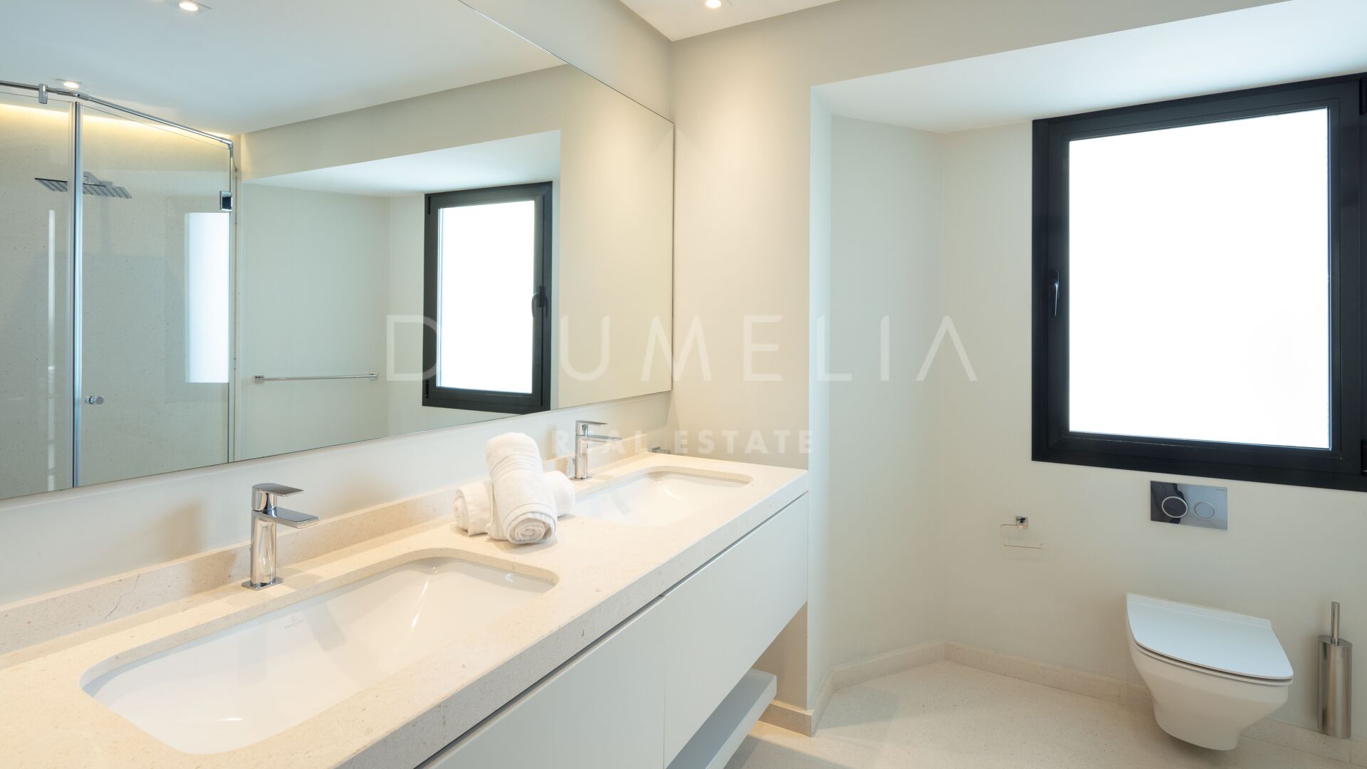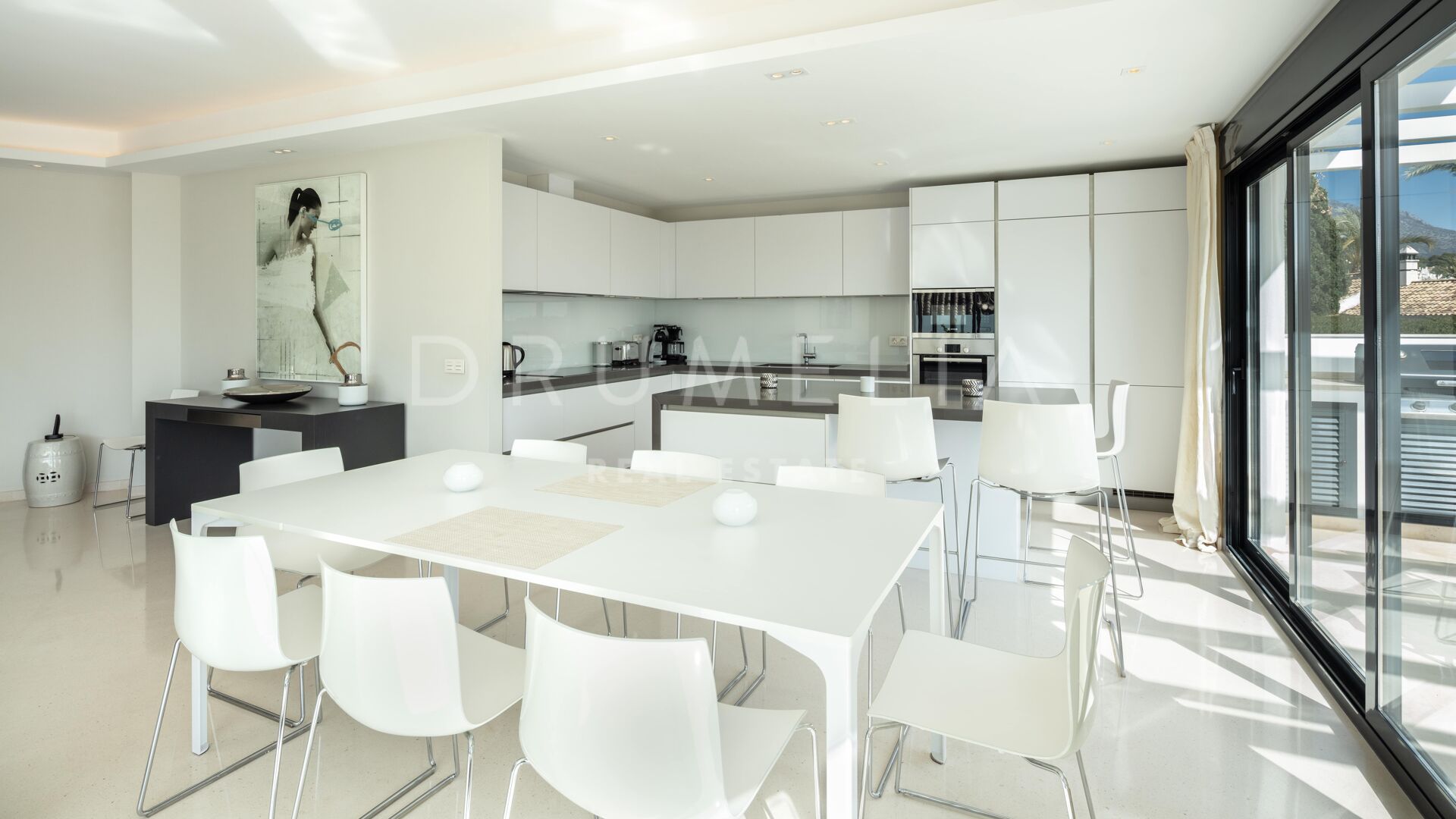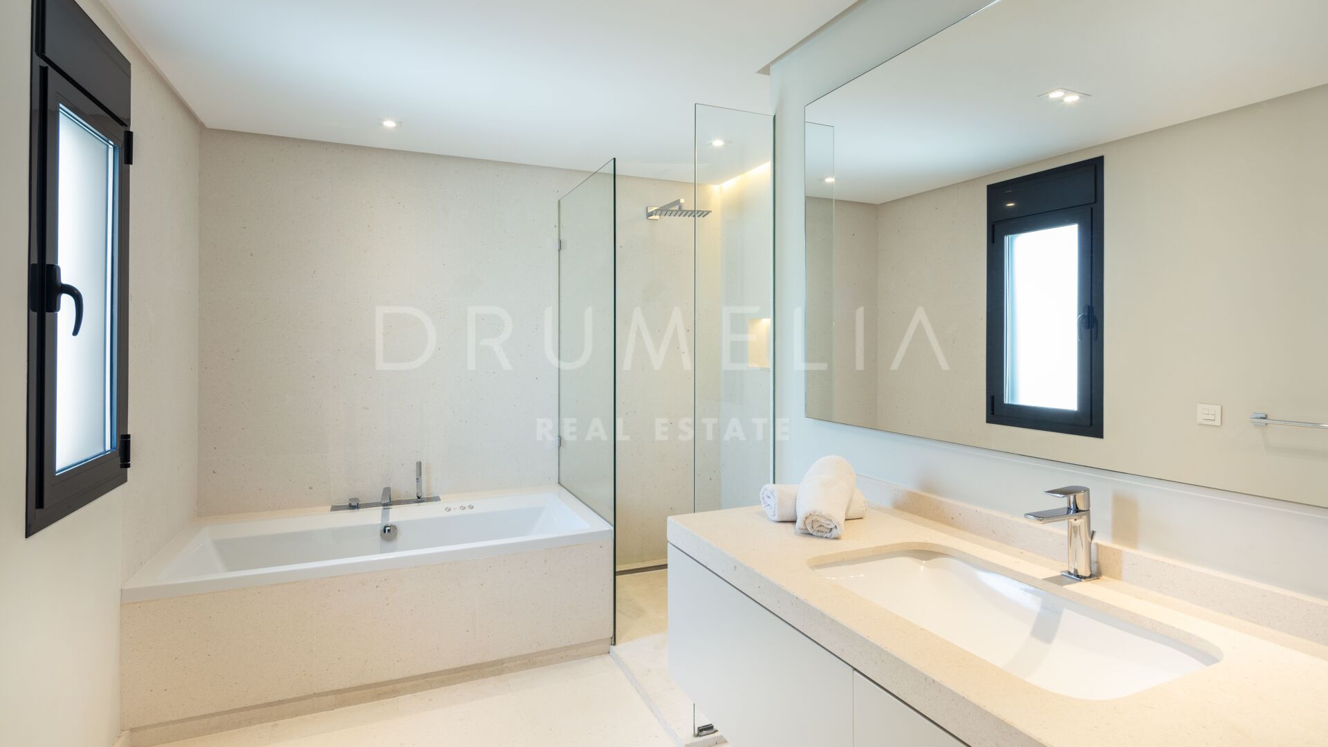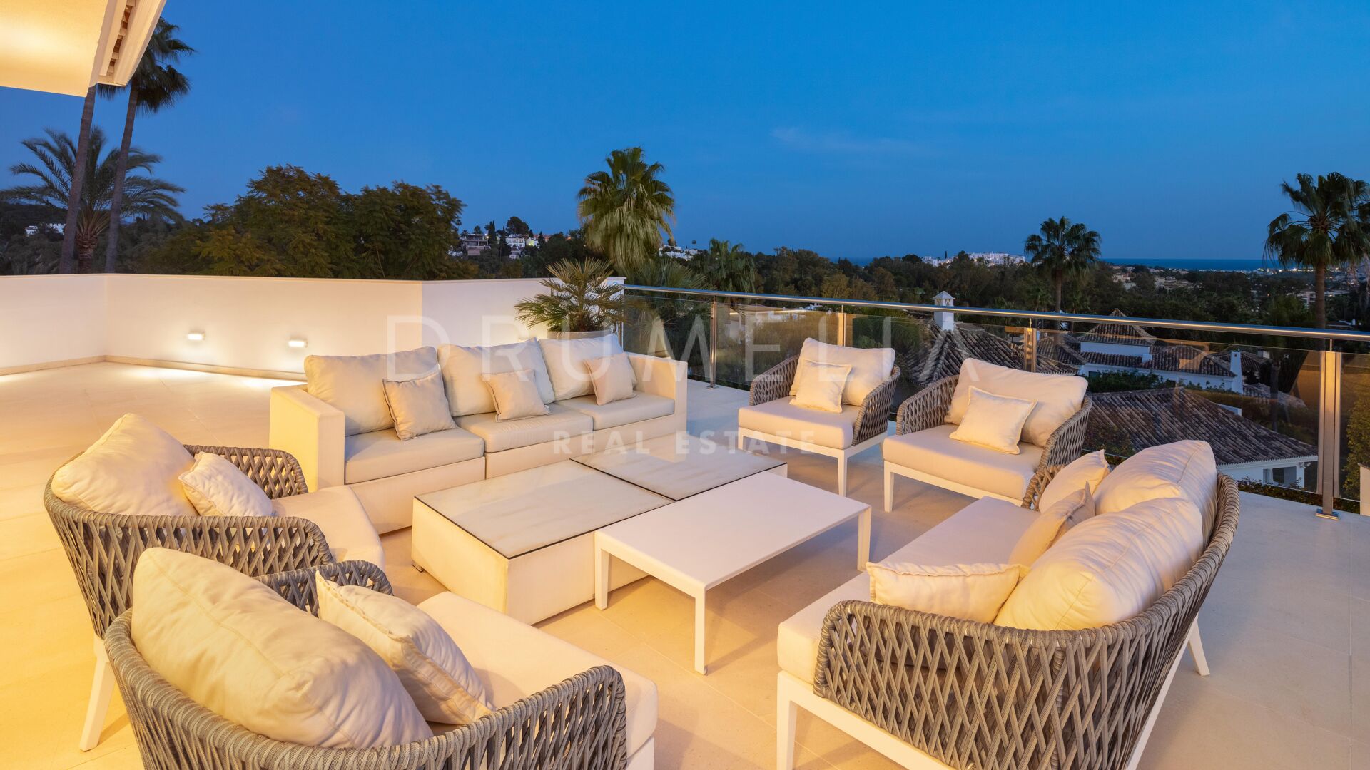 Omgiven av lyxiga fastigheter i Nueva Andalucia ligger det sydvända huset på 397 m² med 42 m² täckta och soliga terrasser på en pittoresk tomt på 931 m². Det kombinerar den spektakulära medelhavsarkitekturen och modern stilinteriör, vilket ger en trevlig atmosfär. Den högklassiga fastigheten är fördelad på 3 våningar och erbjuder öppen rymdplanering med mycket naturligt ljus. På entréplanet finns ett vardagsrum i öppen planlösning med matplats och elegant kök i minimalistisk stil, 3 dubbelrum, 2 badrum och en gästtoalett. På översta våningen finns 2 sovrum: huvudsviten och ett gästrum samt ett badrum. Fastigheten har gott om rekreationsutrymmen: en källare med tv-rum, gym, bastu och spelområde, samt fina utomhusfaciliteter: saltvattenpool med tillgång från vardagsrummet, olika chill-out-områden, grill och al fresco-matplats. Allt för den härliga medelhavslivsstilen! Den anmärkningsvärda solariumterrassen på 90 m² har fantastisk utsikt över det legendariska berget La Concha i öster, över den smaragdgröna golfbanan, havet och Puerto Banus mot söder och kvällssolen på västsidan.
