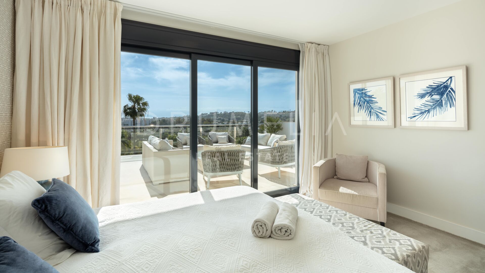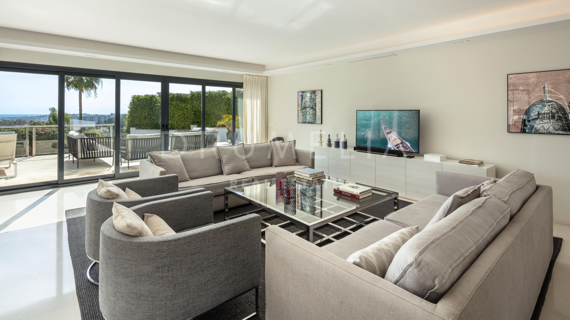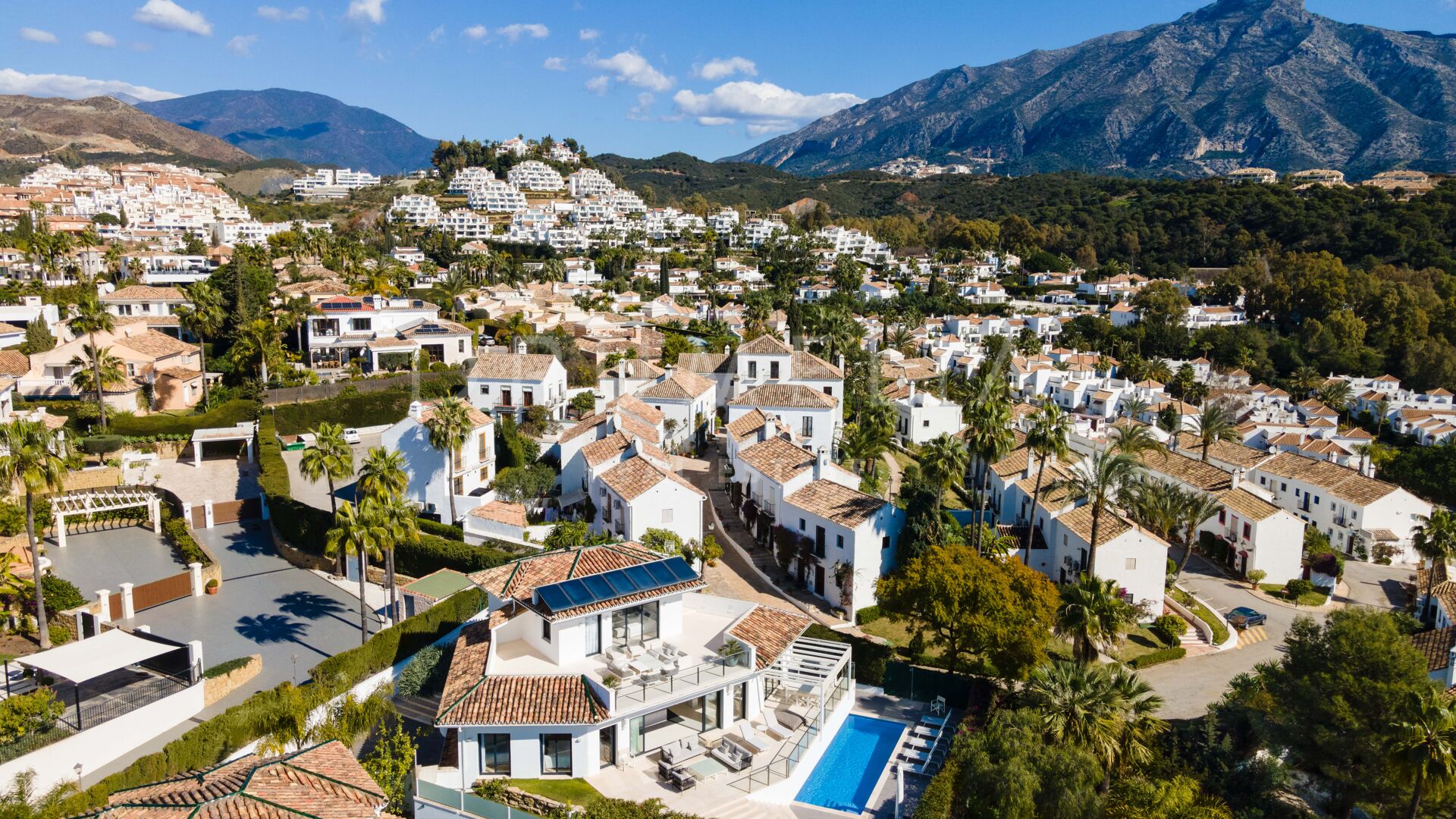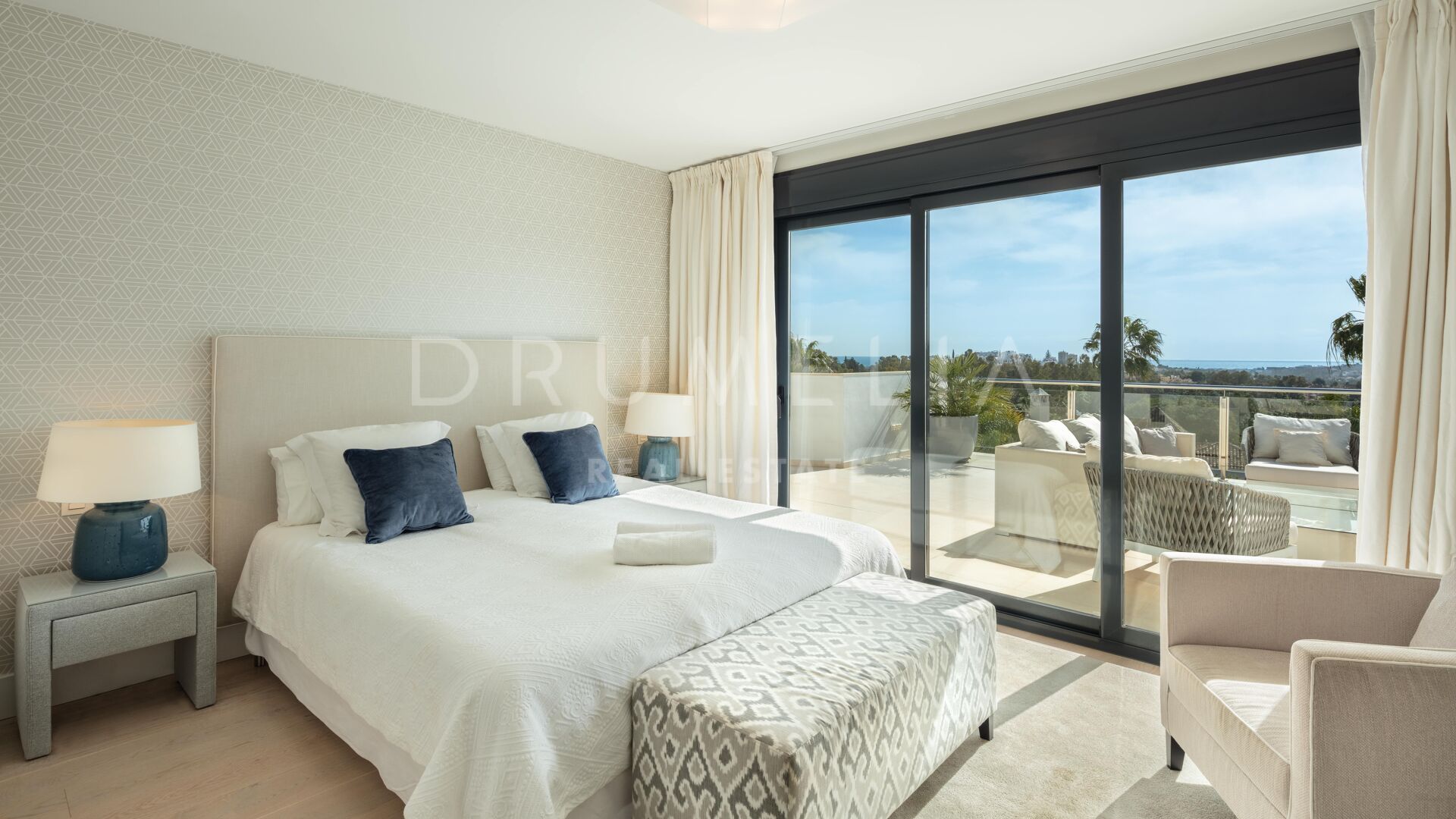 Omgiven av lyxiga fastigheter i Nueva Andalucia ligger det sydvända huset på 397 m² med 42 m² täckta och soliga terrasser på en pittoresk tomt på 931 m². Det kombinerar den spektakulära medelhavsarkitekturen och modern stilinteriör, vilket ger en trevlig atmosfär. Den högklassiga fastigheten är fördelad på 3 våningar och erbjuder öppen rymdplanering med mycket naturligt ljus. På entréplanet finns ett vardagsrum i öppen planlösning med matplats och elegant kök i minimalistisk stil, 3 dubbelrum, 2 badrum och en gästtoalett. På översta våningen finns 2 sovrum: huvudsviten och ett gästrum samt ett badrum. Fastigheten har gott om rekreationsutrymmen: en källare med tv-rum, gym, bastu och spelområde, samt fina utomhusfaciliteter: saltvattenpool med tillgång från vardagsrummet, olika chill-out-områden, grill och al fresco-matplats. Allt för den härliga medelhavslivsstilen! Den anmärkningsvärda solariumterrassen på 90 m² har fantastisk utsikt över det legendariska berget La Concha i öster, över den smaragdgröna golfbanan, havet och Puerto Banus mot söder och kvällssolen på västsidan.
