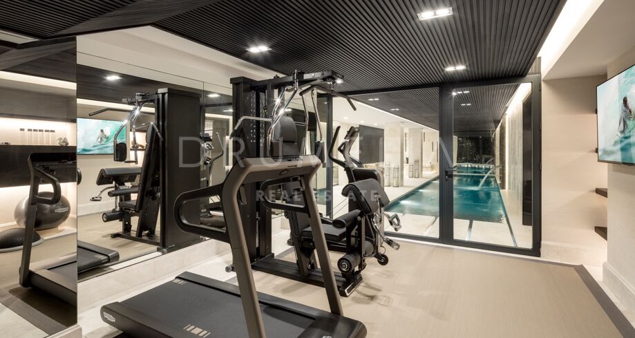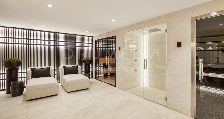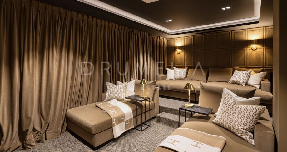 På nedre plan finns en privat spaavdelning med inomhuspool, bastu och turkiskt bad, samt biograf och underhållningsrum – allt för välbefinnande och njutning i hemmet. Villan har dessutom en privat infart och ett garage med plats för upp till tre bilar.