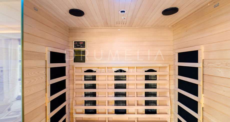 Fastigheten har sex rymliga sovrum och sju elegant designade badrum, alla färdigställda med material av högsta kvalitet. De öppna planlösningarna flyter naturligt ut mot stora terrasser, vilket skapar en harmonisk balans mellan inne och ute. Det ljusa, fullt utrustade köket fungerar som hemmets hjärta – perfekt för både vardagsliv och sociala tillställningar. Interiören kombinerar naturliga material, neutrala färger och skräddarsydda detaljer för en varm och sofistikerad känsla.