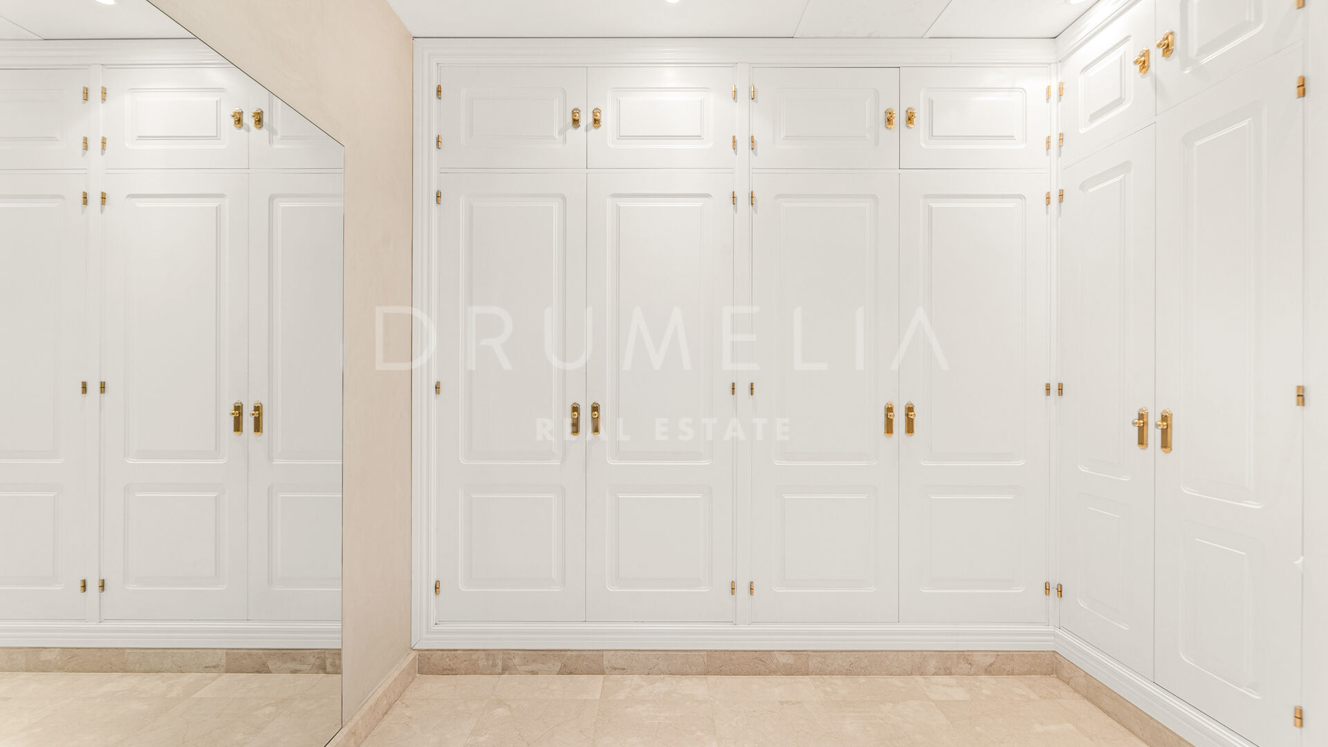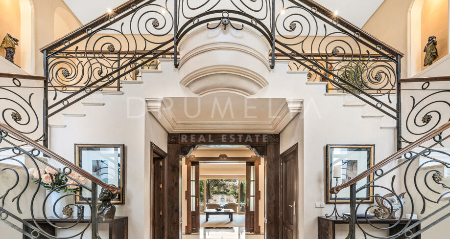Interiören öppnar med en marmorklädd entréhall som leder till en dubbellöpande kejserlig trappa med handgjort smidesjärnsräcke. Detta arkitektoniska inslag utgör ett centralt fokus i bostaden.