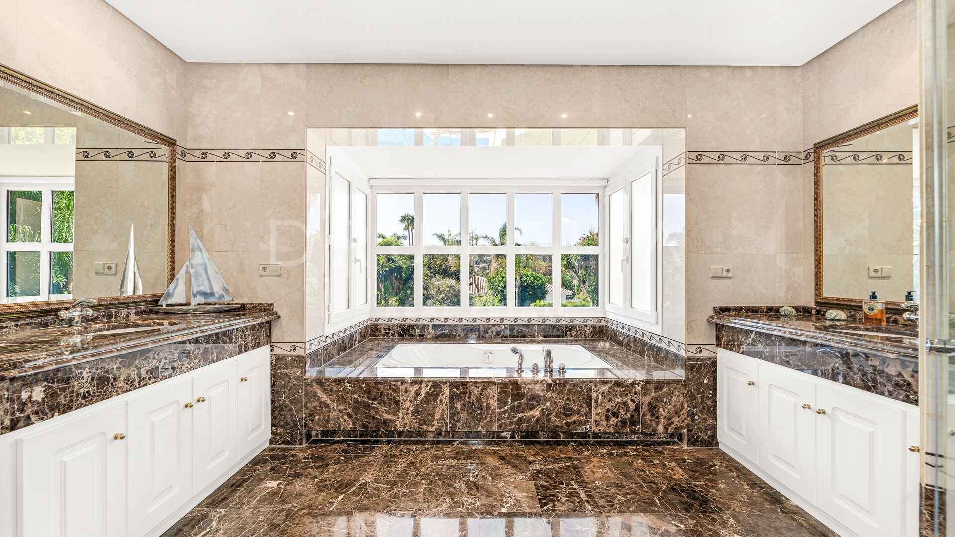 Den övre våningen är centrerad kring mastersviten med klädkammare och badrum i marmor, tillsammans med två ytterligare sovrum som delar ett badrum.