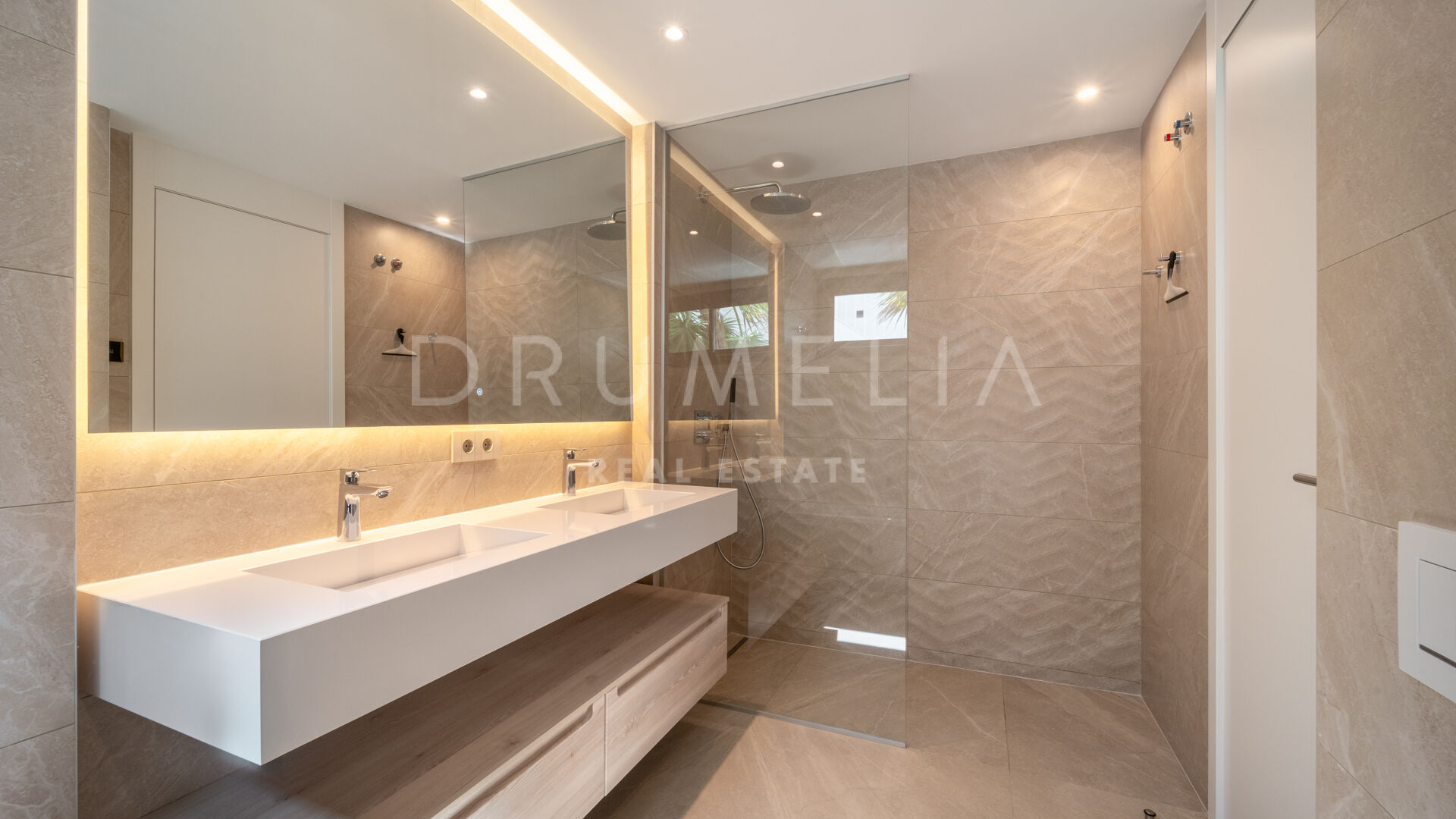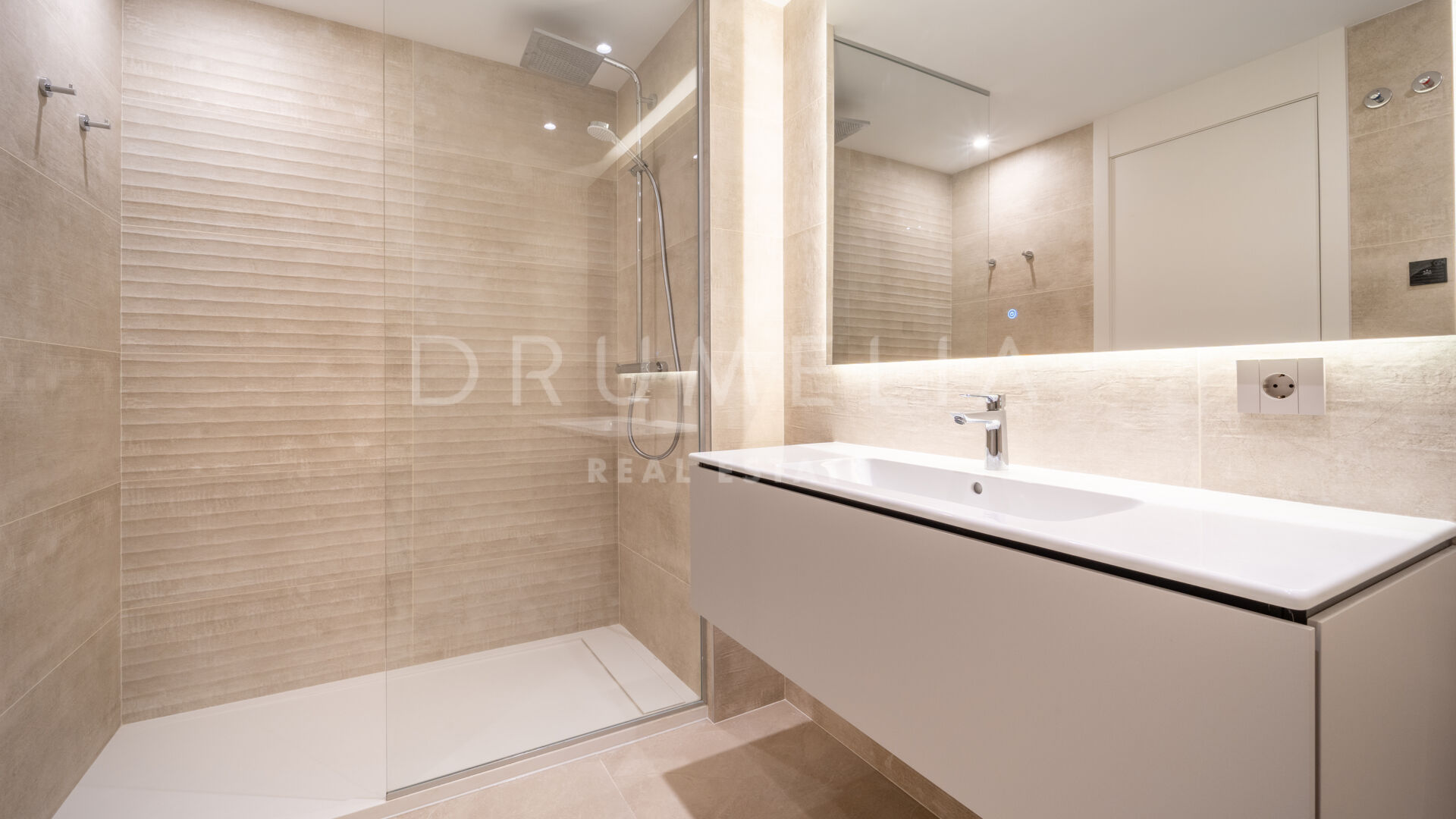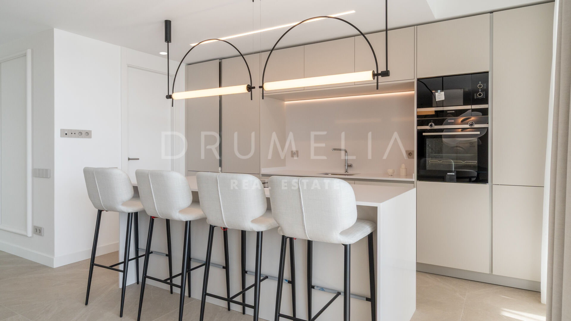 Med cirka 130 m² boyta och 124 m² utomhusytor är lägenheten utformad för att maximera naturligt ljus och skapa en sömlös övergång mellan inne och ute. Huvudterrassen ansluter direkt till det öppna vardagsrummet och matsalen genom stora skjutdörrar i glas, vilket skapar en ljus och flytande dagmiljö, idealisk för både vardagsliv och sociala tillställningar. Det fullt utrustade köket har bänkskivor i kvarts, integrerade vitvaror och ett separat tvättrum, medan golv i storformatsporslin, vitlackerad snickeri och rena arkitektoniska linjer ger hemmet en sofistikerad, modern karaktär.