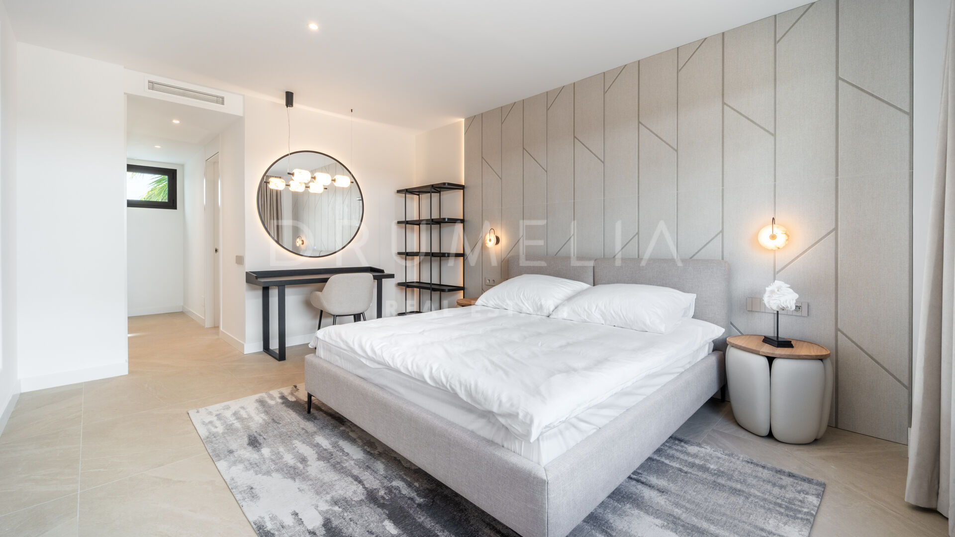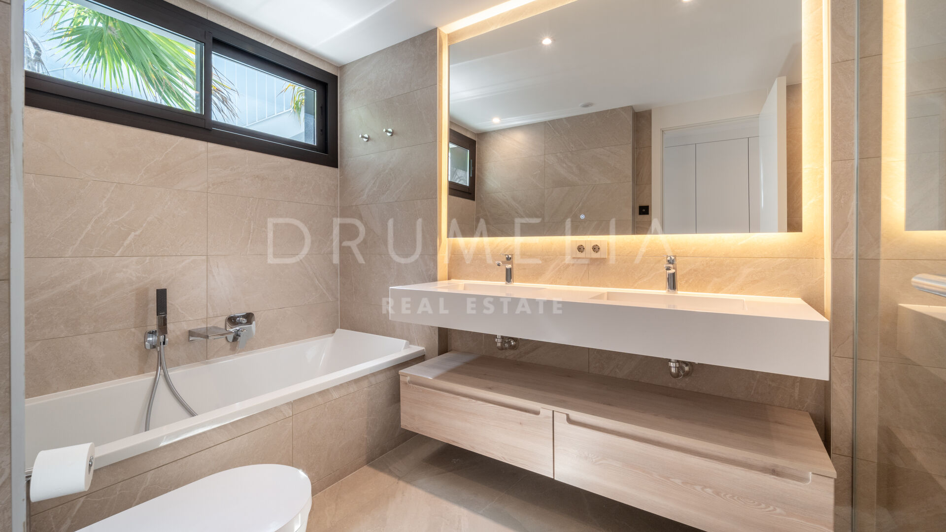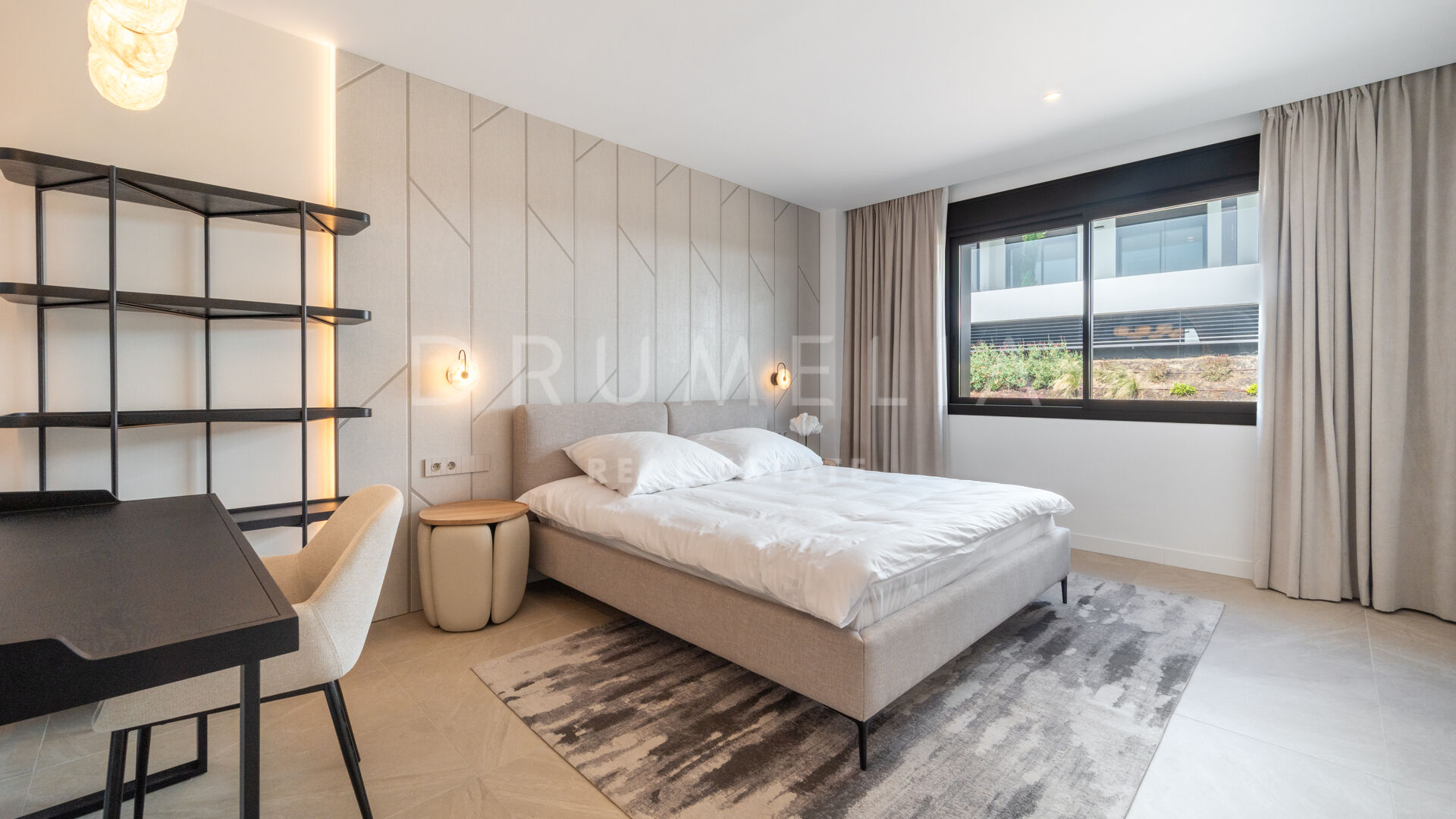 Med cirka 130 m² boyta och 124 m² utomhusytor är lägenheten utformad för att maximera naturligt ljus och skapa en sömlös övergång mellan inne och ute. Huvudterrassen ansluter direkt till det öppna vardagsrummet och matsalen genom stora skjutdörrar i glas, vilket skapar en ljus och flytande dagmiljö, idealisk för både vardagsliv och sociala tillställningar. Det fullt utrustade köket har bänkskivor i kvarts, integrerade vitvaror och ett separat tvättrum, medan golv i storformatsporslin, vitlackerad snickeri och rena arkitektoniska linjer ger hemmet en sofistikerad, modern karaktär.