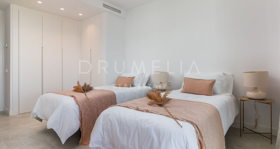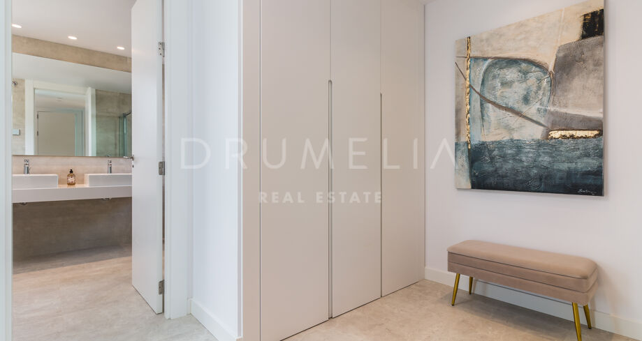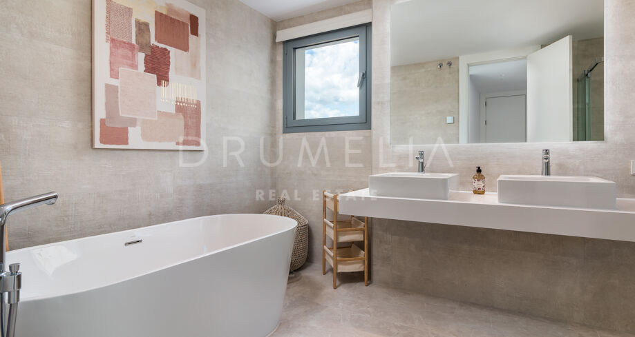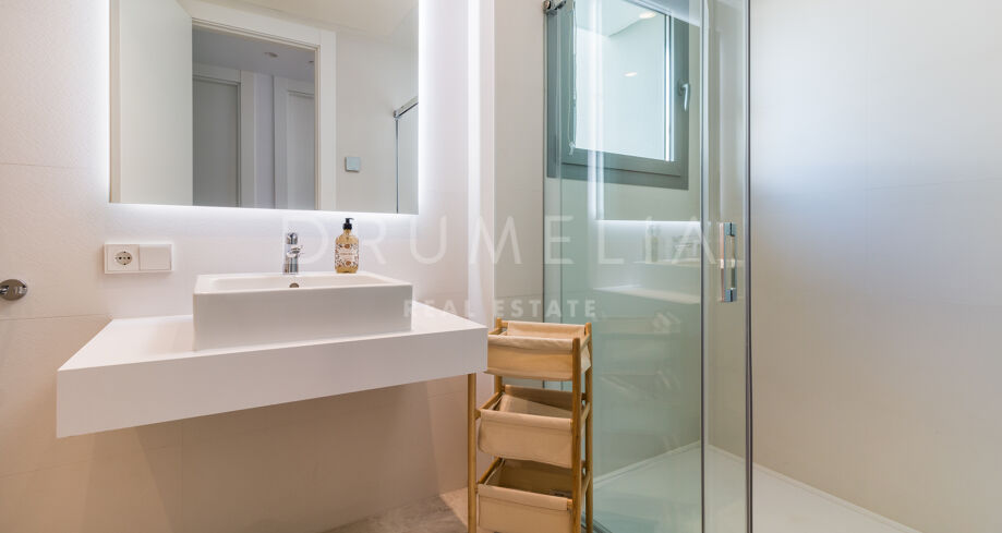 Det inhägnade området erbjuder fyra utomhuspooler, ett fullt utrustat gym, spa-område, coworking-yta, snackbar, klubbhus och concierge-service dygnet runt, omgivet av anlagda medelhavsträdgårdar. Bostaden inkluderar två underjordiska parkeringsplatser och ett förråd och ligger nära stränder, golfbanor, internationella skolor, restauranger och Marbellas centrum.