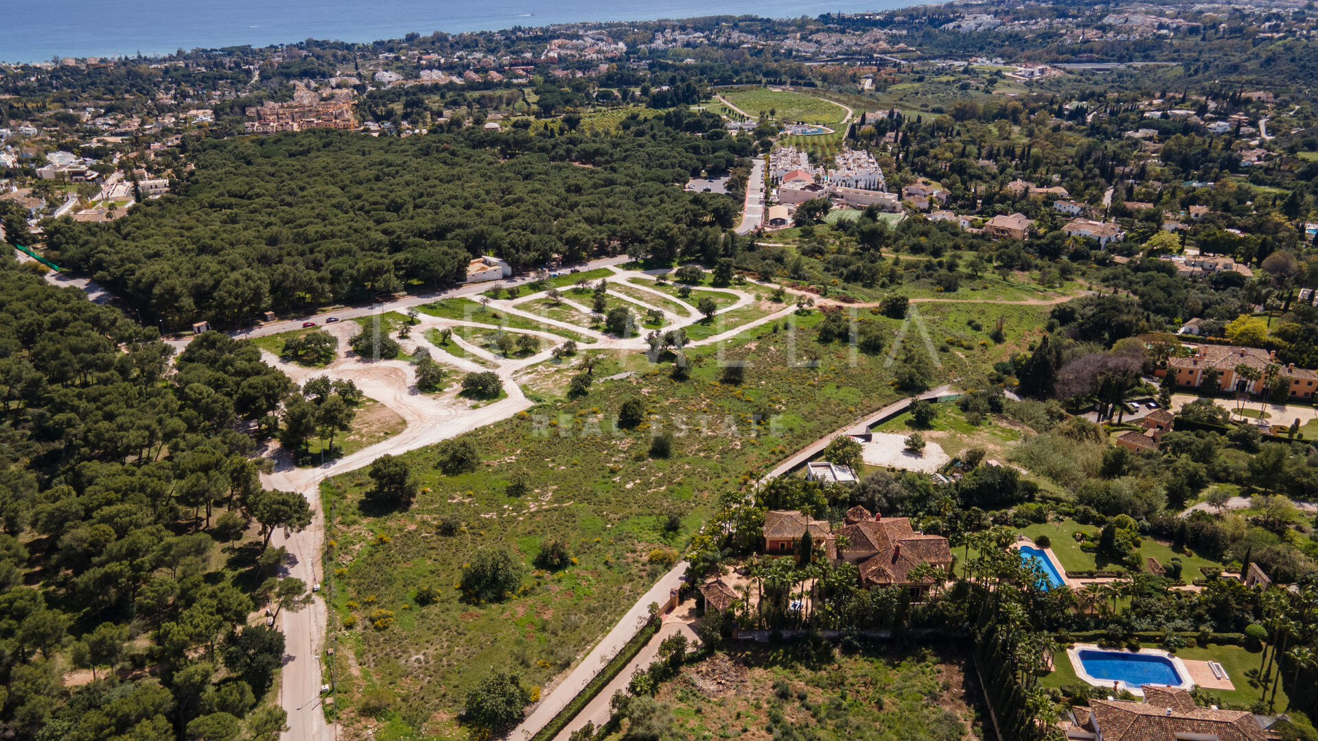 Omgiven av en skyddad naturpark och de magnifika herrgårdarna och eleganta villorna i det prestigefyllda området ligger den på sluttningen av den övre delen av den berömda Golden Mile, ett etablerat och mycket exklusivt område i Marbella, nära alla bekvämligheter och allt som en krävande person kan behöva för den mest sofistikerade livsstilen. Tomten har fantastisk panoramautsikt mot Medelhavet, bergen och pittoreska omgivningar med gamla olivträd och medelhavstallar.