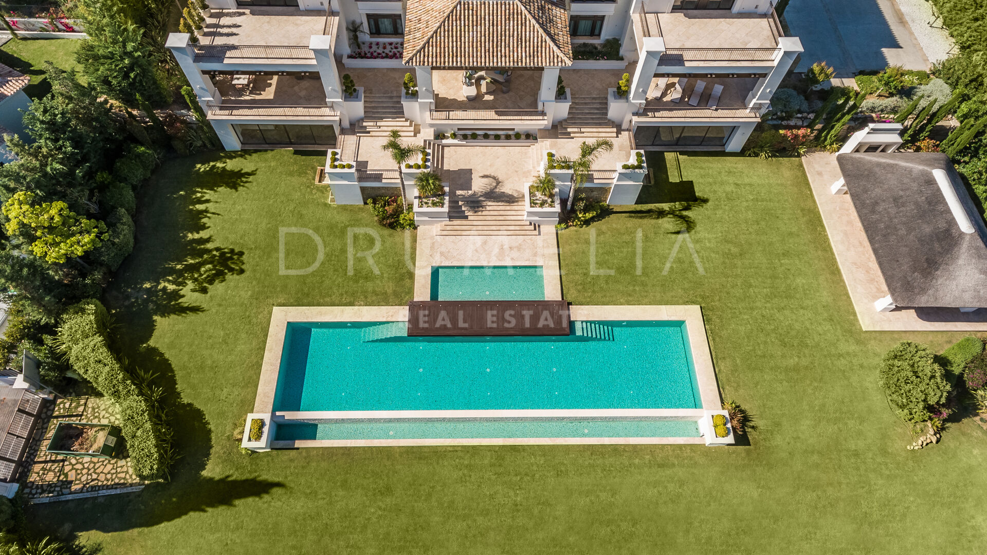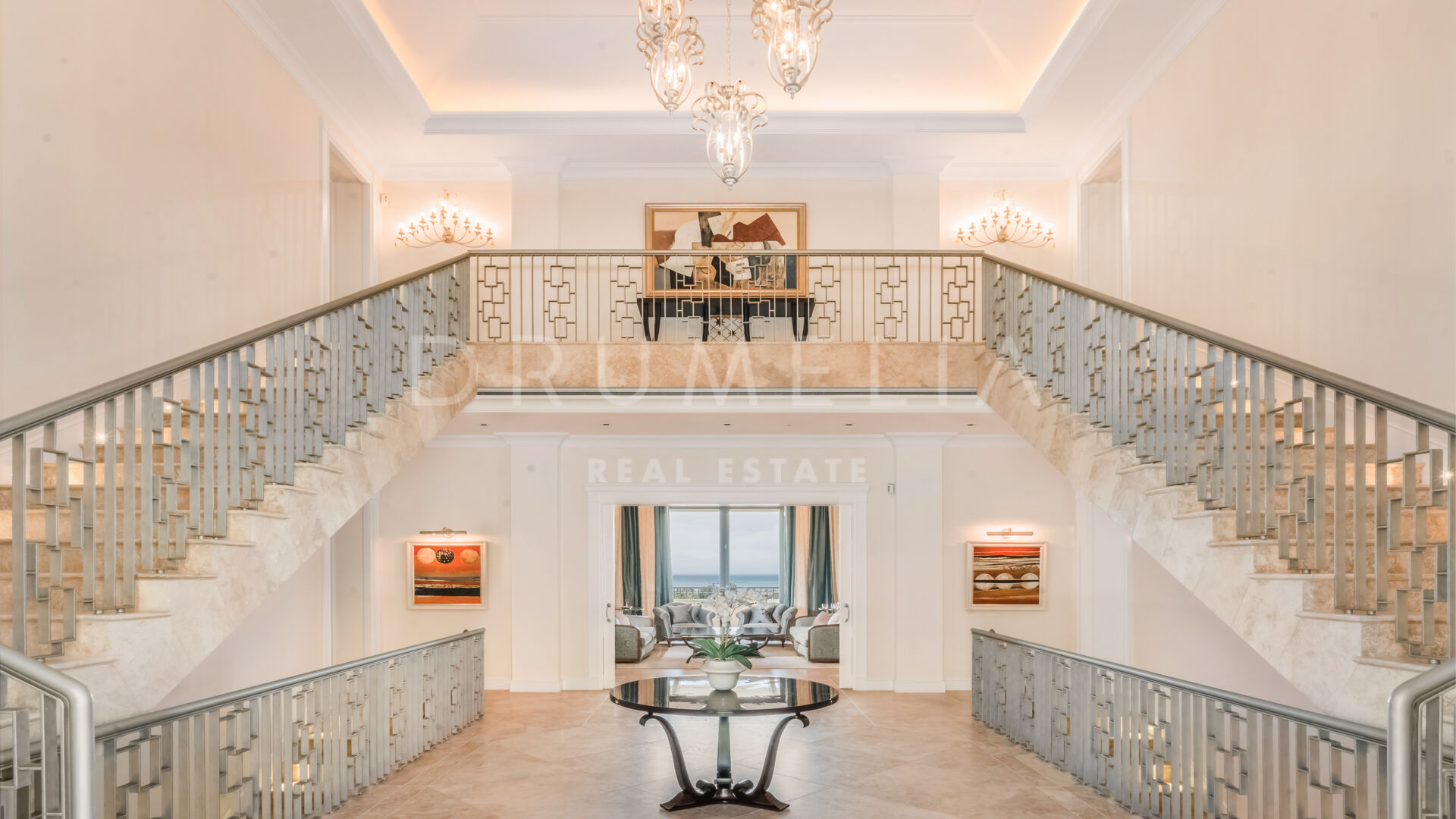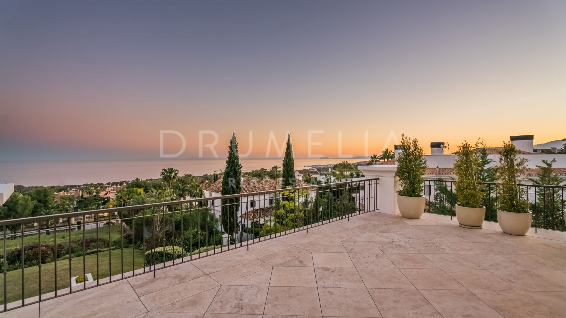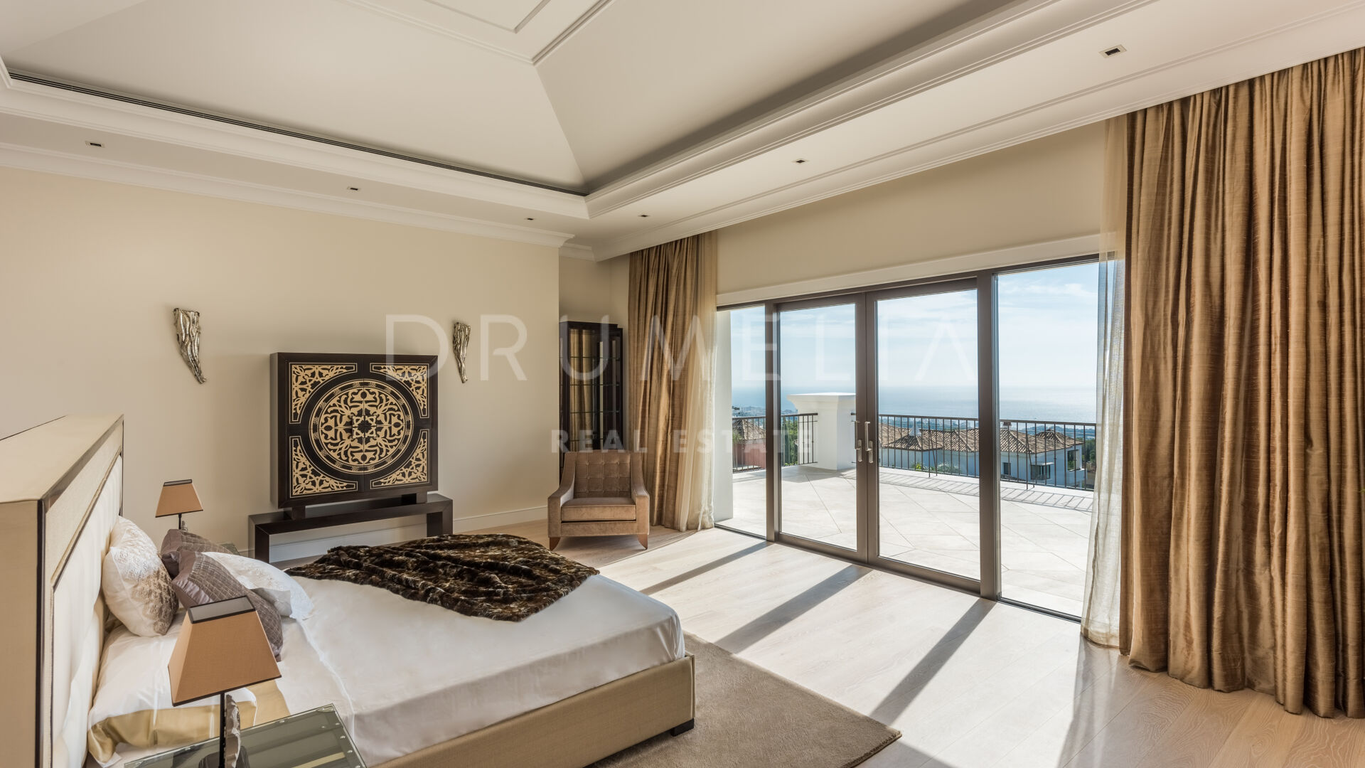 Endast det bästa kan förväntas. Fastigheten har en ädel, iögonfallande naturlig färgpalett, utmärkta marmorgolv, panoramaglasdörrar och glasvinskällare, inbyggda garderober i snickeri av hög kvalitet, expansivt och praktiskt omklädningsrum av exceptionell smak och kvalitet, stort garage, täckta och soliga terrasser, solarium och privata balkonger som är perfekta för att njuta av sensationella medelhavssolnedgångar, ett glas vin eller en ikonisk kopp kaffe på morgonen. Föreställ dig bara: 873 m² terrasser omsluter din villa på 2 720 m²!