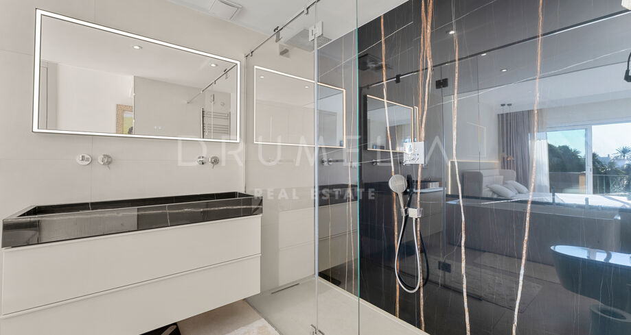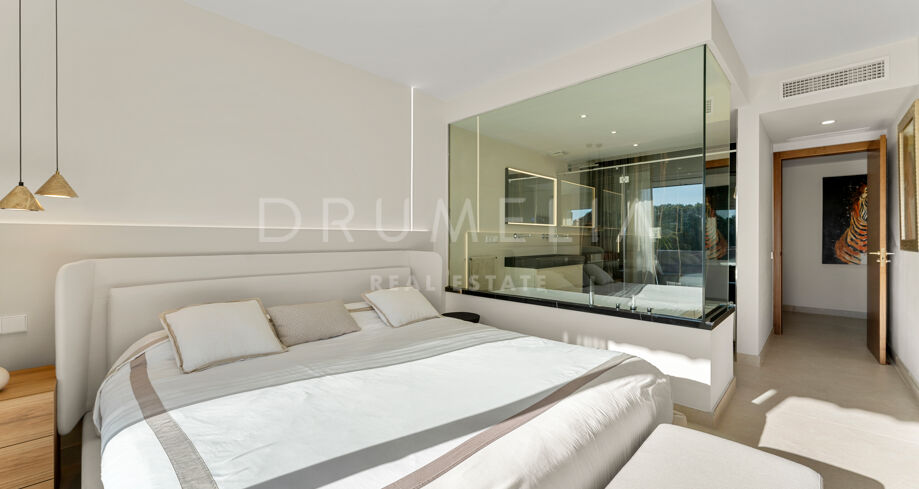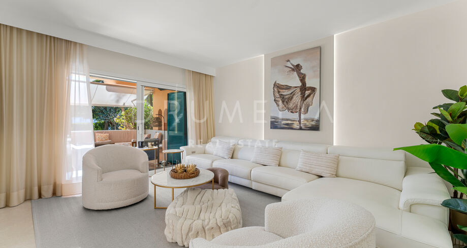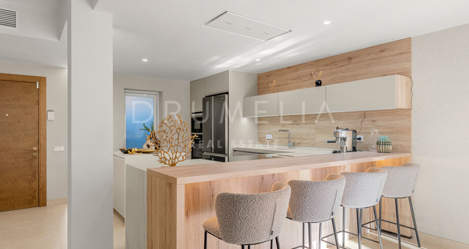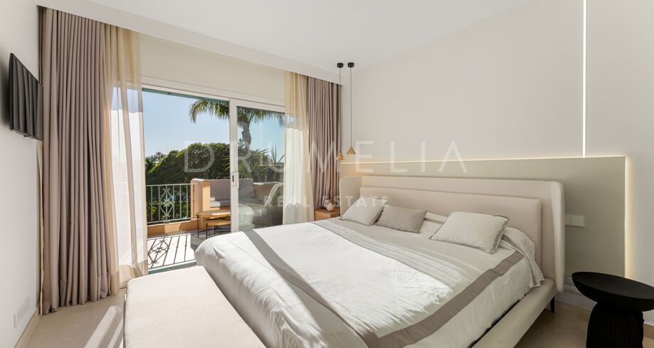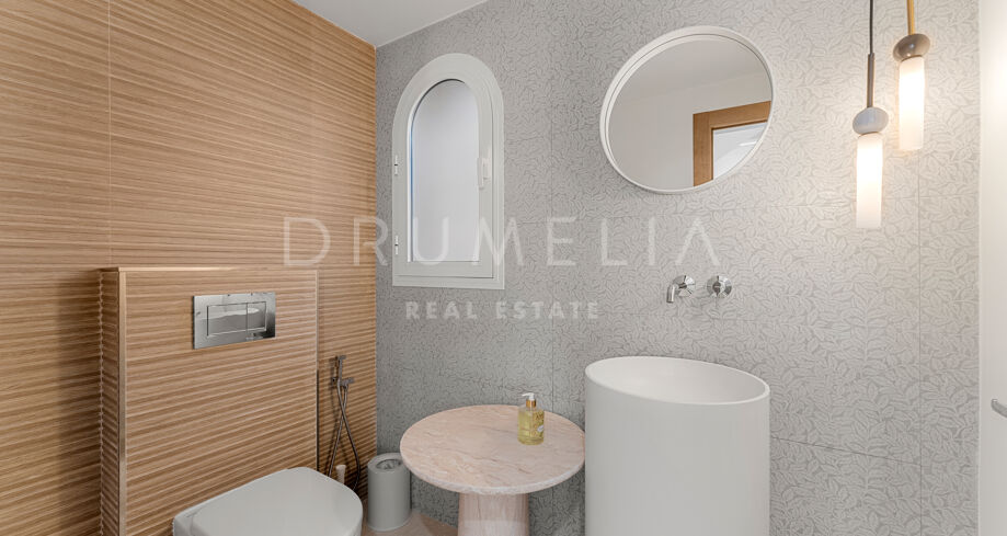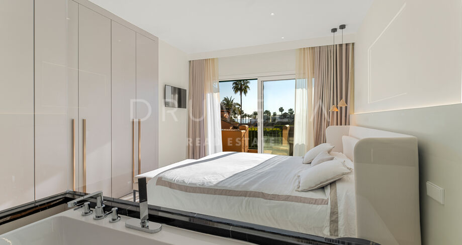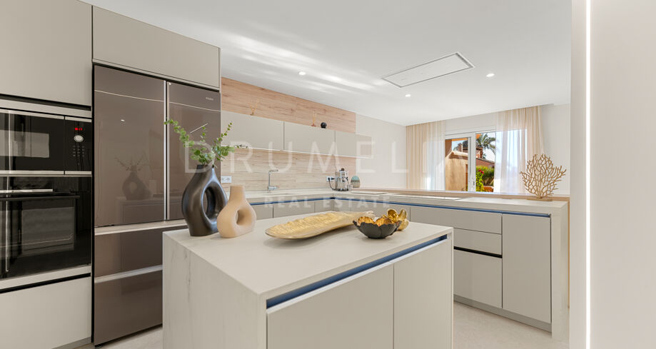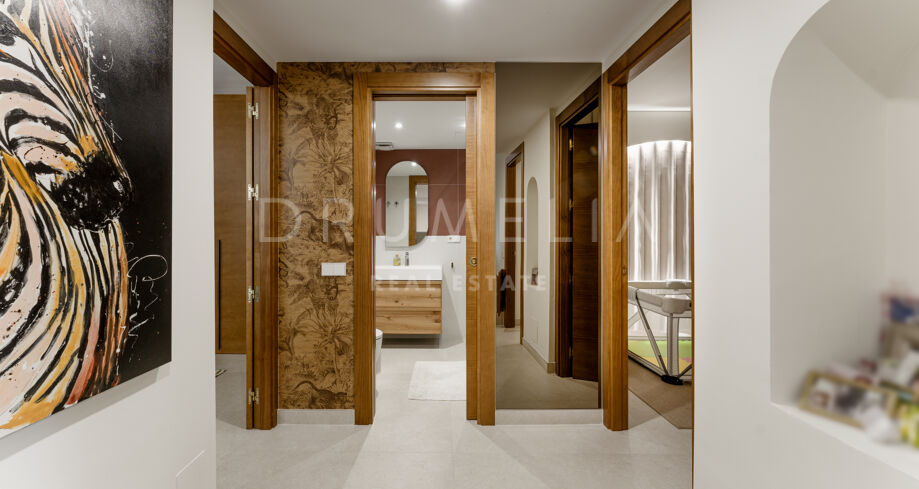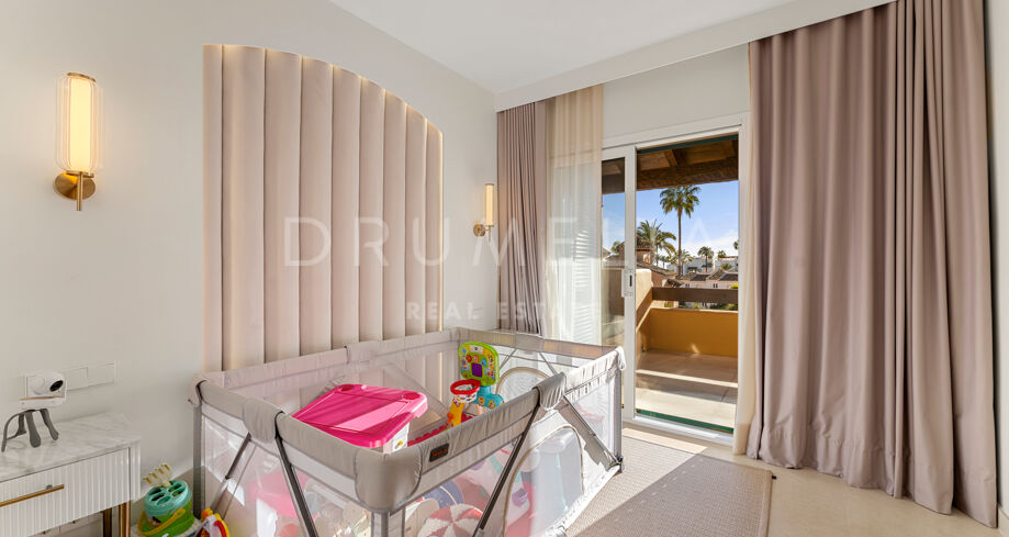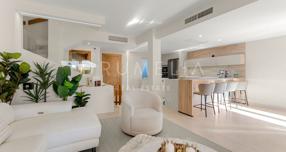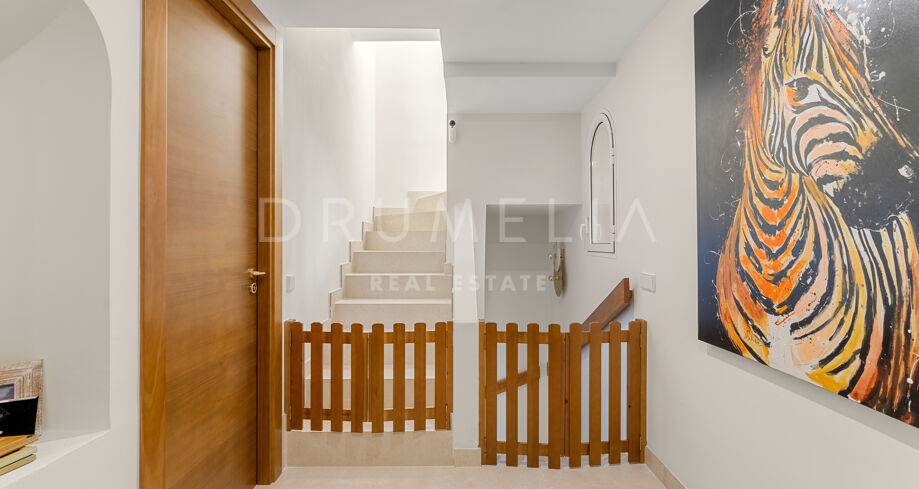 Dette nyoppussede, høykvalitets rekkehuset i tre etasjer med 4 soverom og 5 bad ligger i det eksklusive Alcazaba Beach Houses, et luksuriøst strandområde i Estepona. Med fantastisk panoramautsikt over havet og en elegant åpen planløsning kombinerer denne eiendommen moderne raffinement med det beste fra middelhavslivet.