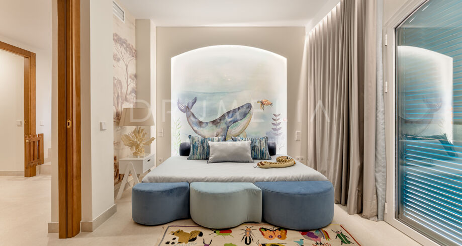 Første etasje består av tre utsøkt innredede soverom. Hovedsoverommet har eget bad, mens de to andre soverommene deler bad. To av soverommene har private terrasser med delvis havutsikt, noe som gir rolige rom for å slappe av.