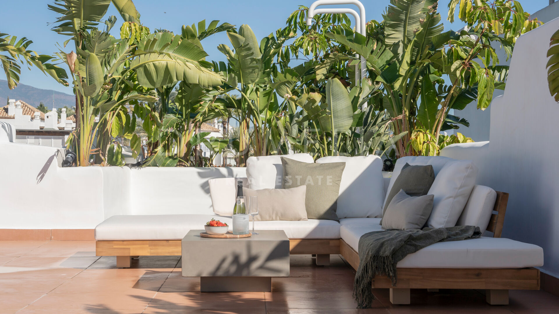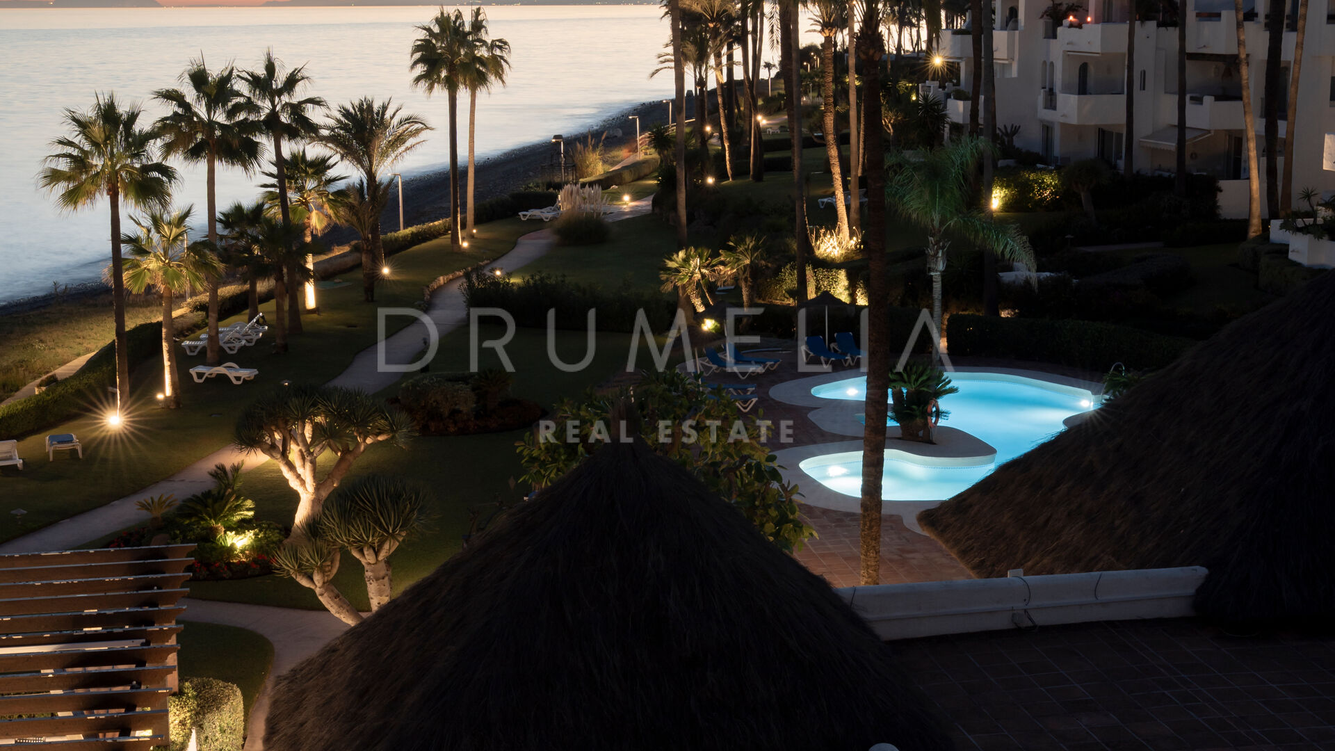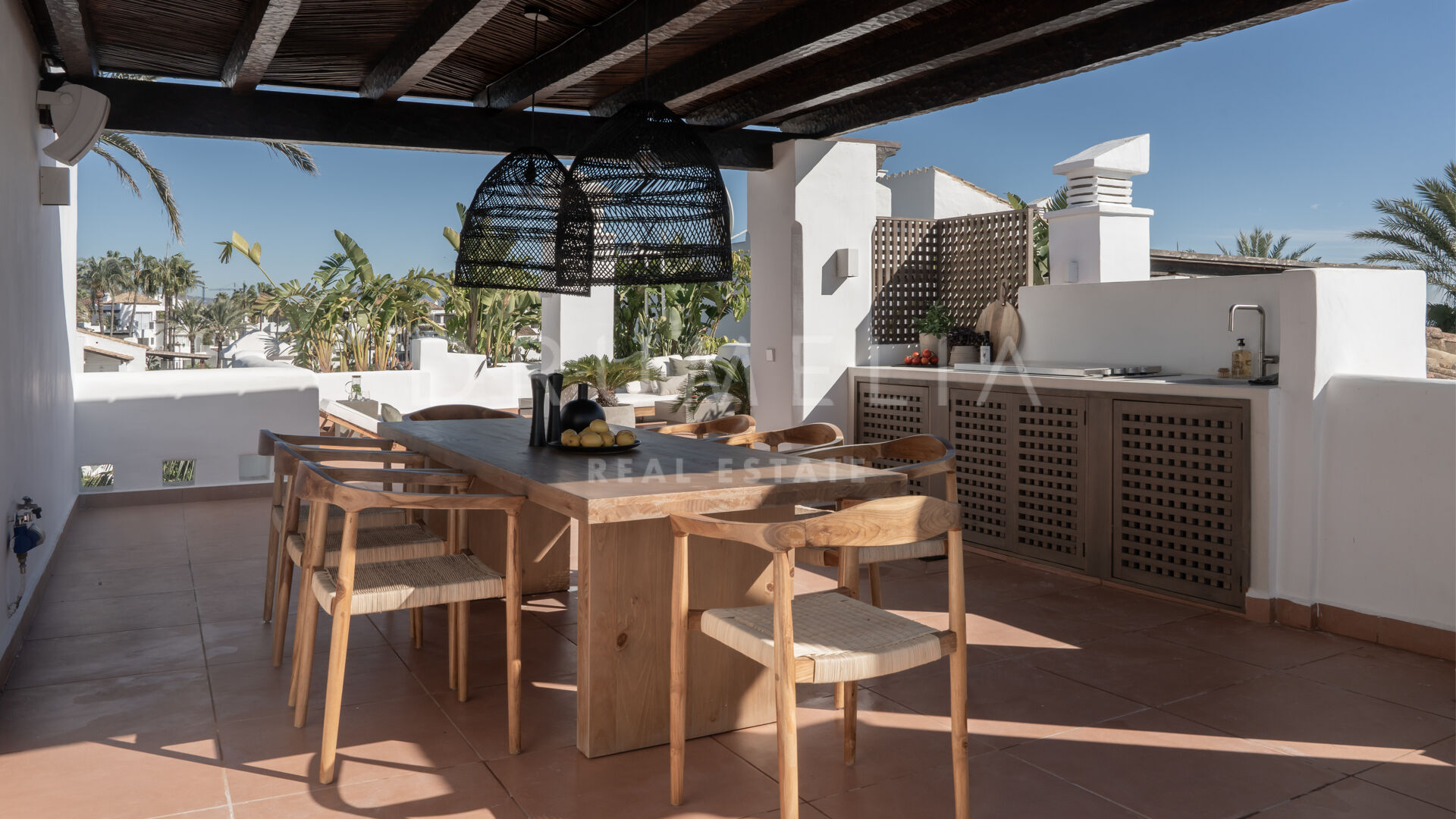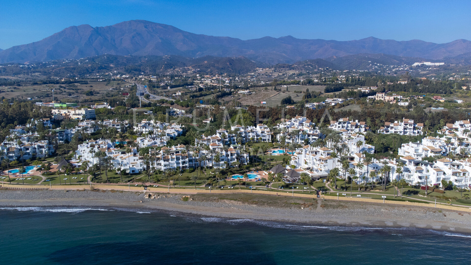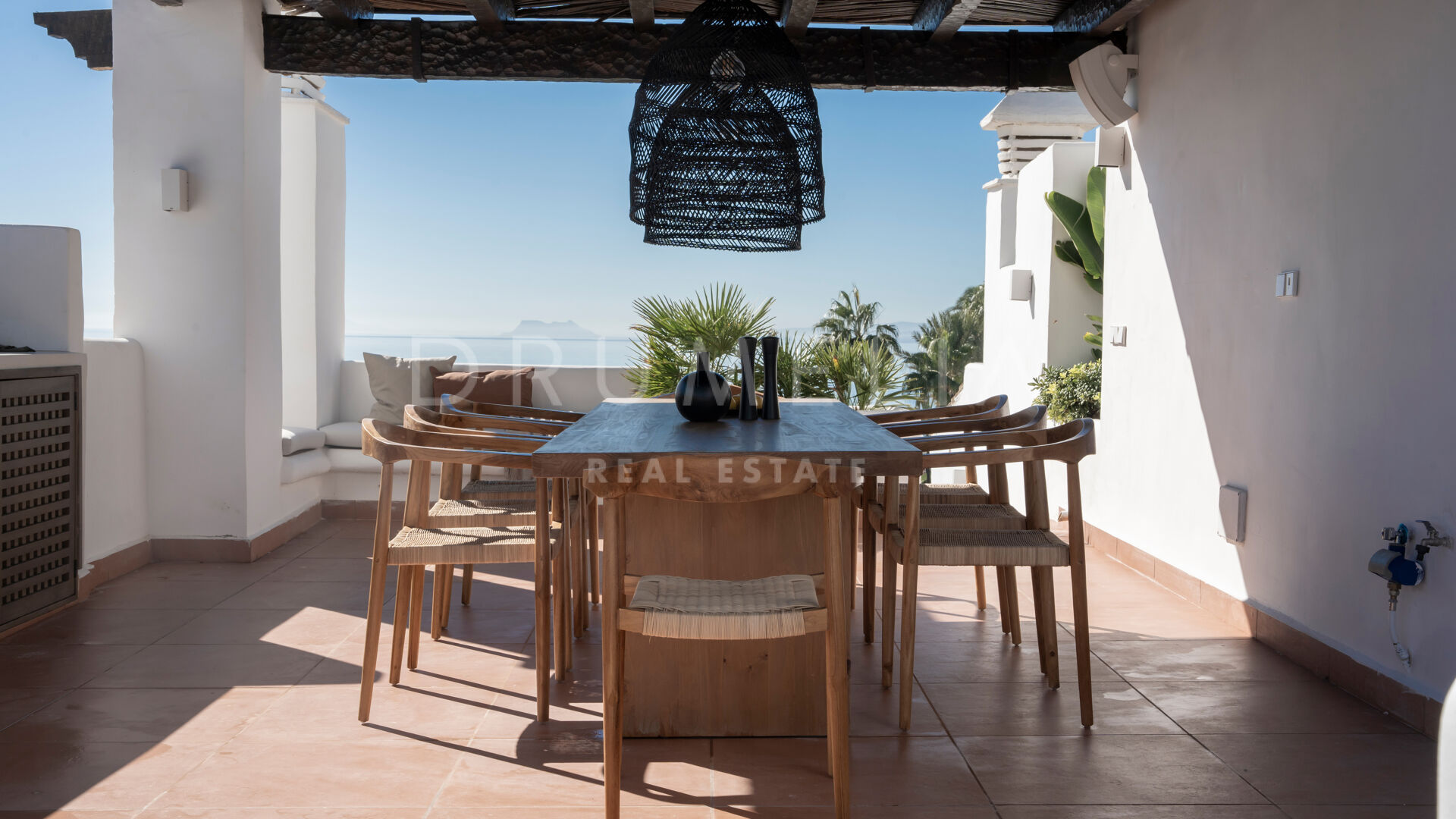 Toppleilighet til salgs i Alcazaba Beach, Estepona Øst med 2 soverom, 2 baderom, 2 baderom med eget bad, 1 toalett, innebygd 1989 og har basseng (felles) og hage (felles). Dimensjoner: 115m² bygget og 132m² terrasse.