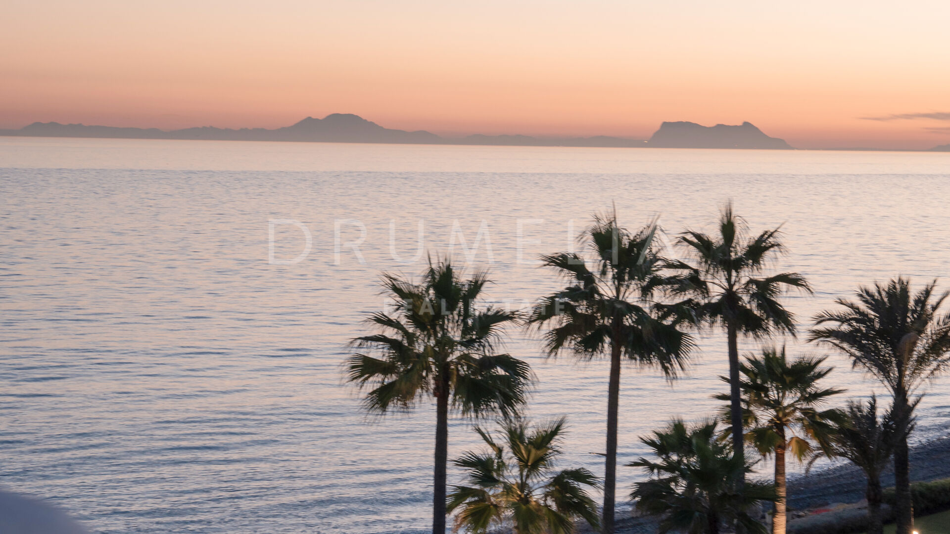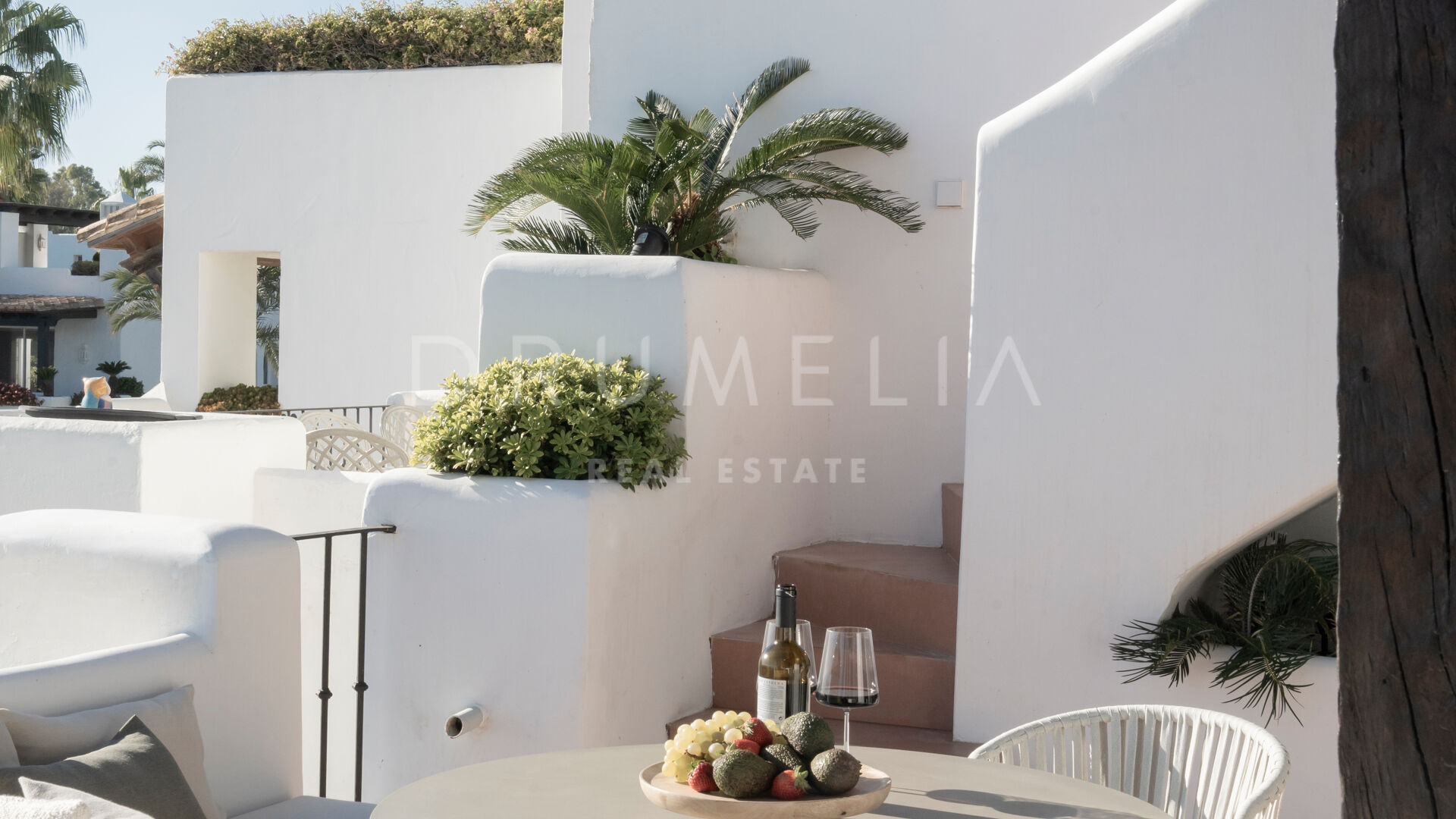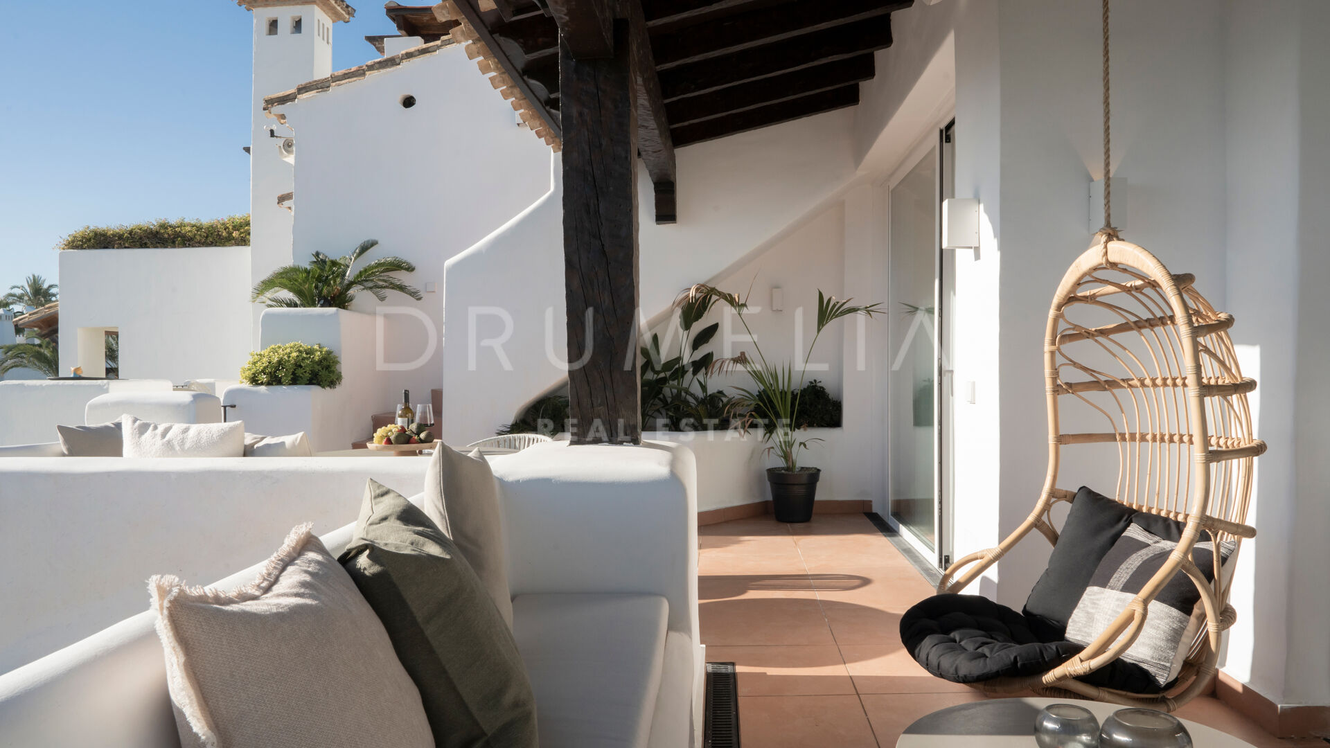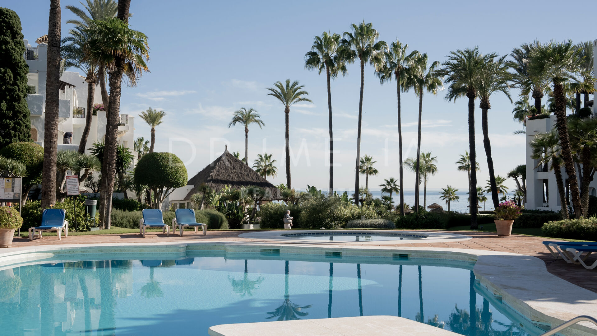 Toppleilighet til salgs i Alcazaba Beach, Estepona Øst med 2 soverom, 2 baderom, 2 baderom med eget bad, 1 toalett, innebygd 1989 og har basseng (felles) og hage (felles). Dimensjoner: 115m² bygget og 132m² terrasse.