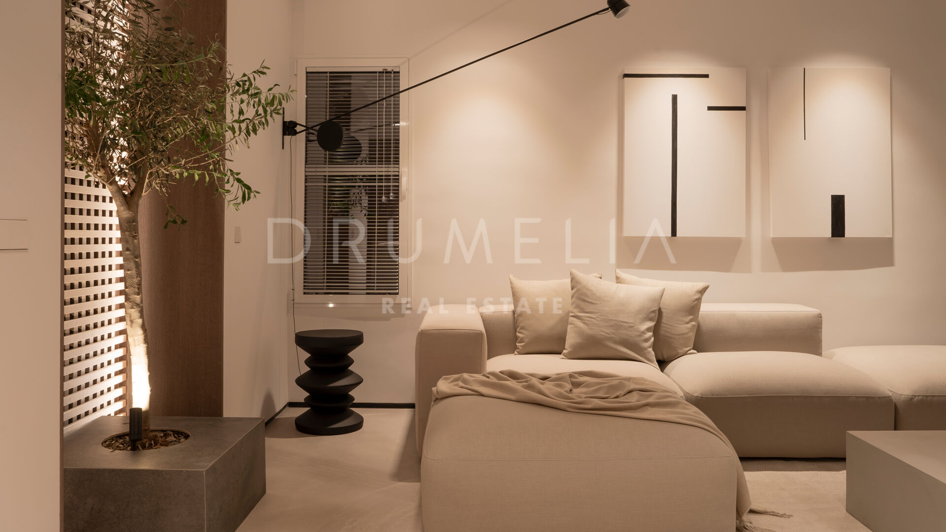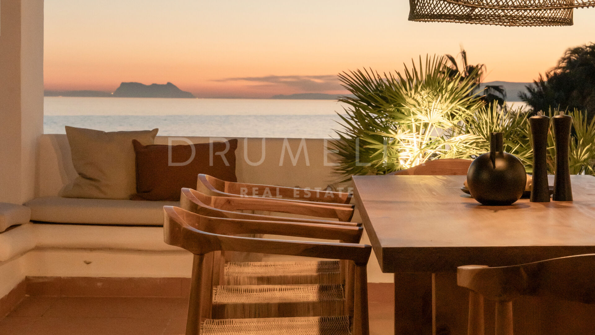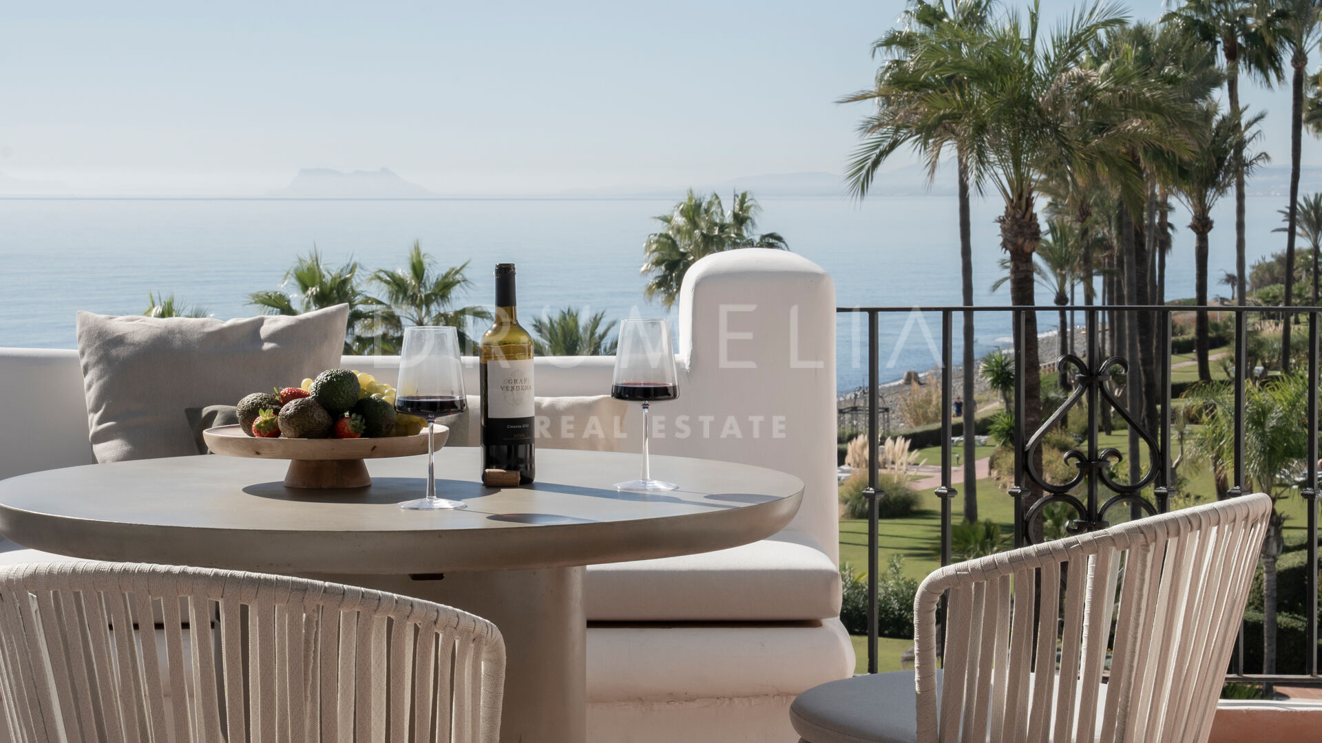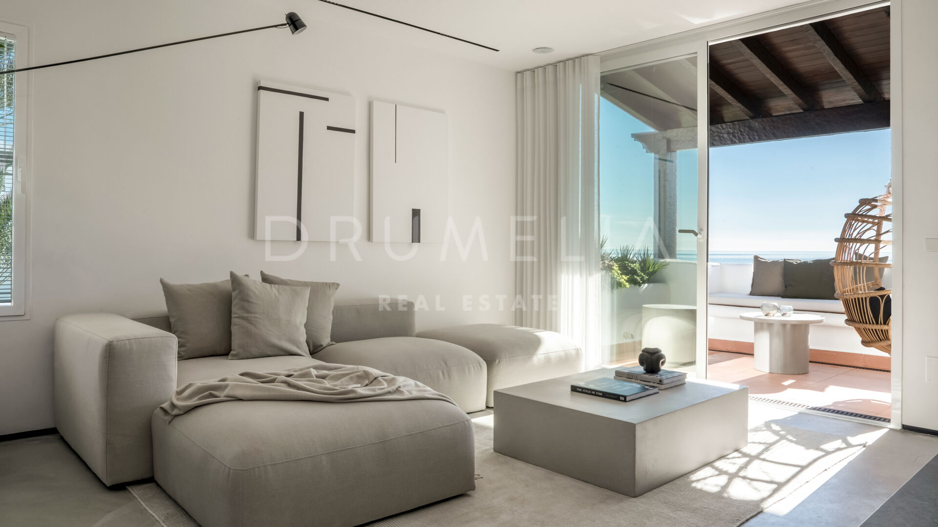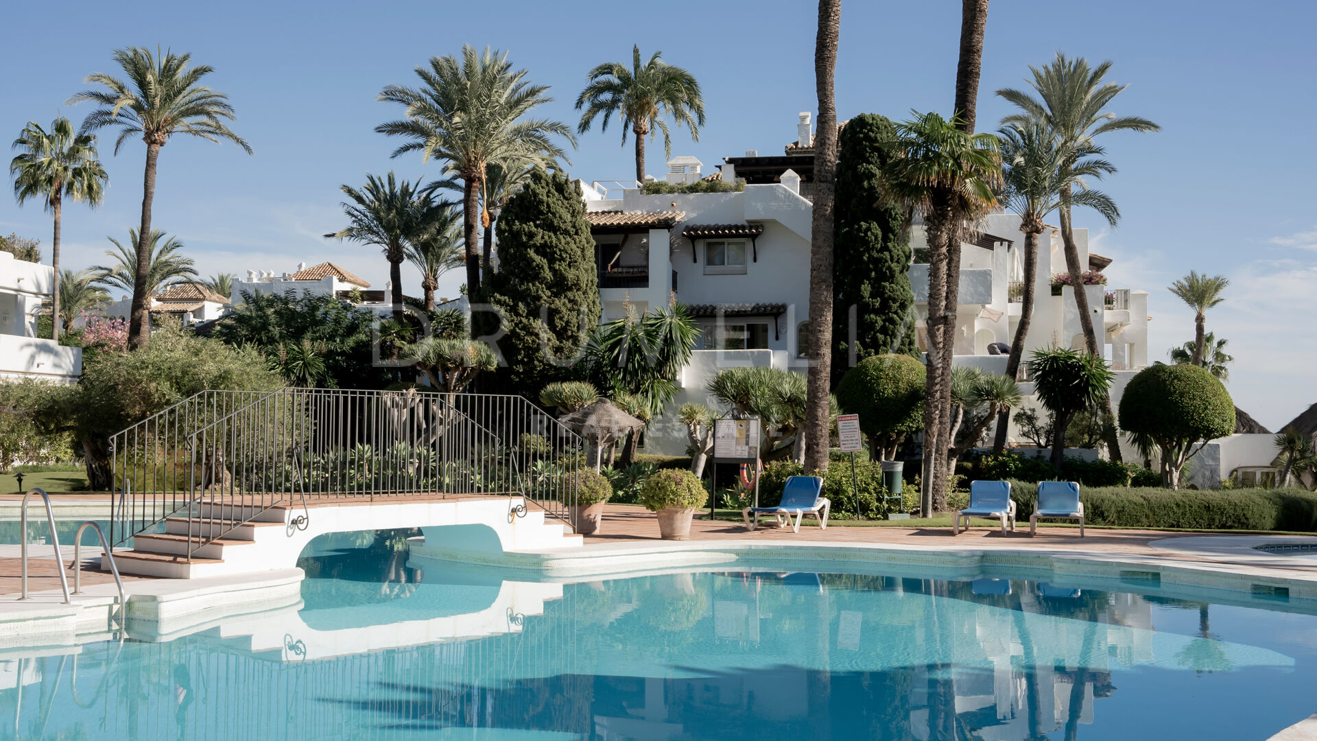 Toppleilighet til salgs i Alcazaba Beach, Estepona Øst med 2 soverom, 2 baderom, 2 baderom med eget bad, 1 toalett, innebygd 1989 og har basseng (felles) og hage (felles). Dimensjoner: 115m² bygget og 132m² terrasse.