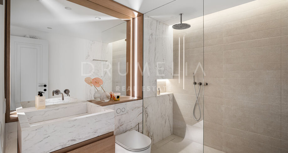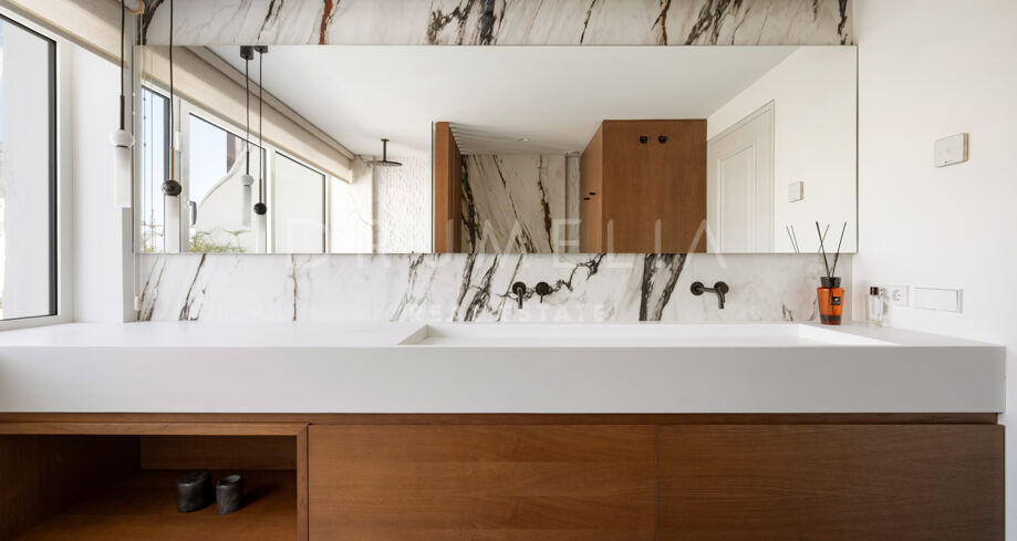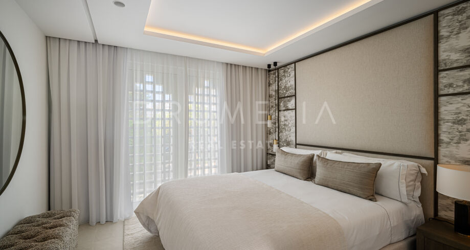Toppleiligheten tilbyr tre velutstyrte soverom, inkludert en romslig hovedsuite, alle utformet med komfort og funksjonalitet i tankene. Materialer av høy kvalitet, nøytrale toner og elegante overflater skaper en raffinert og innbydende atmosfære gjennom hele boligen.