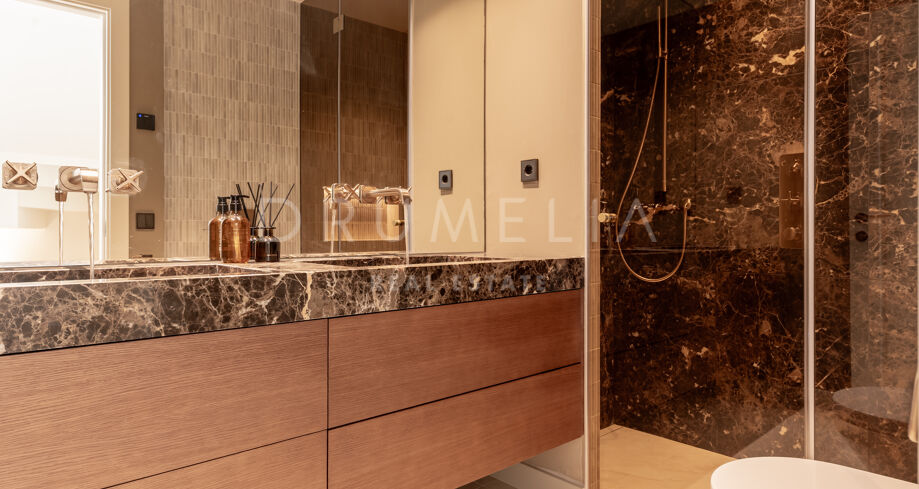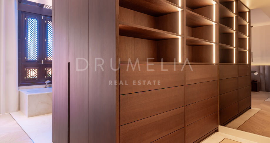 I første etasje er det to soverom som deler bad, i tillegg til hovedsoverommet med skreddersydde tre skap og privat terrasse. Takterrassen har et fullt utstyrt utekjøkken og tilbyr utsikt over havet og den vakre fjellkjeden. Kjelleren har et fjerde soverom med eget bad og et allsidig rom som kan gjøres om til treningsrom, kino eller underholdningsrom.