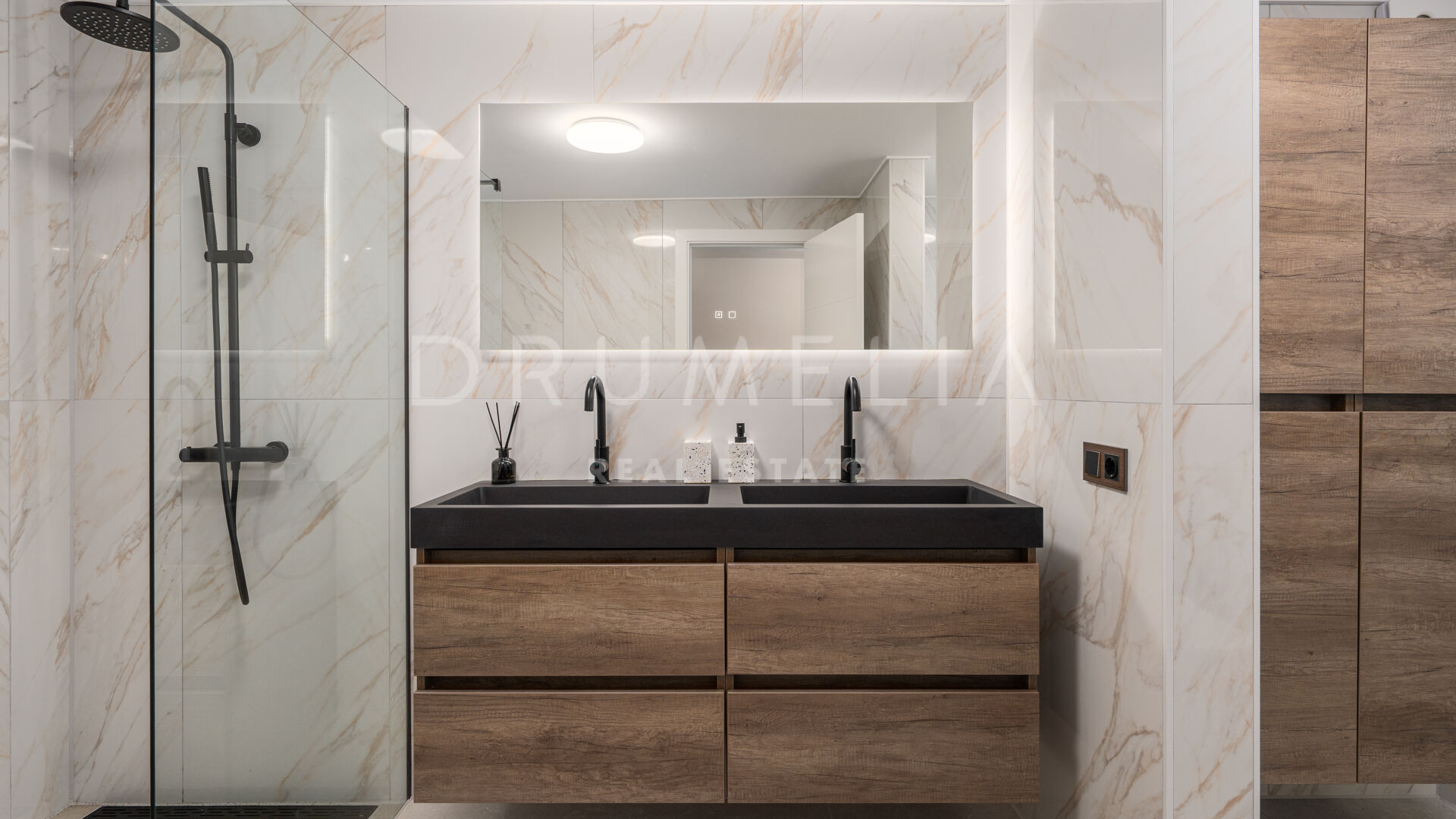 Villaen har en stor terrasse som sømløst kobles til det private bassenget, og skaper en innbydende plass for utendørs avslapning, bespisning eller sammenkomster, samt en takterrasse og en hage. Orienteringen sikrer rikelig naturlig lys og rolige omgivelser, mens den åpne planløsningen fremhever flyten mellom inne og ute.