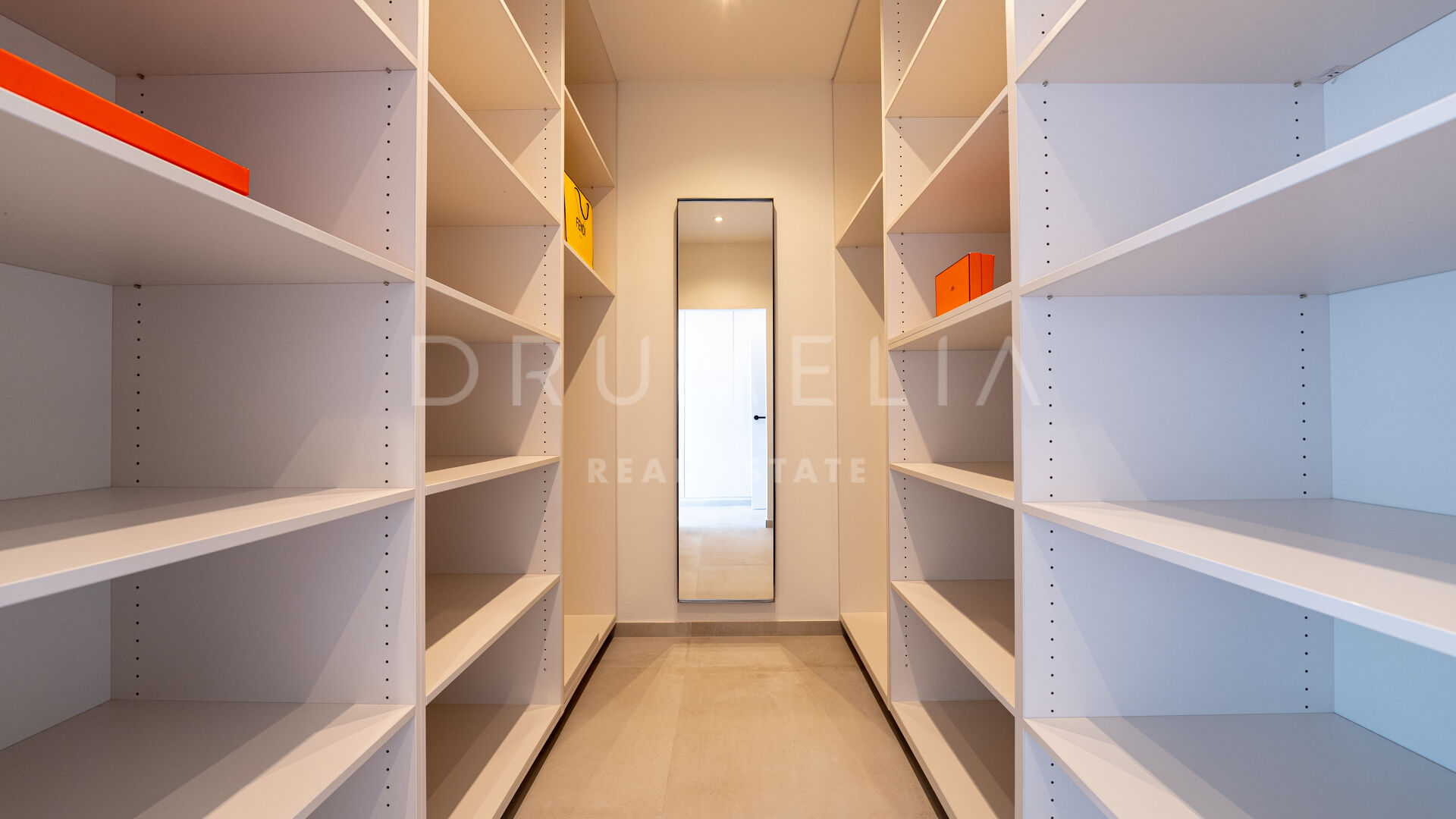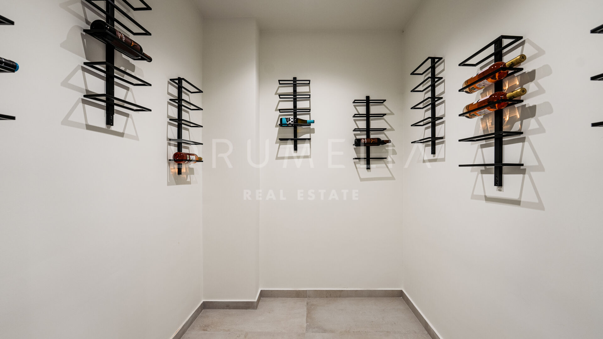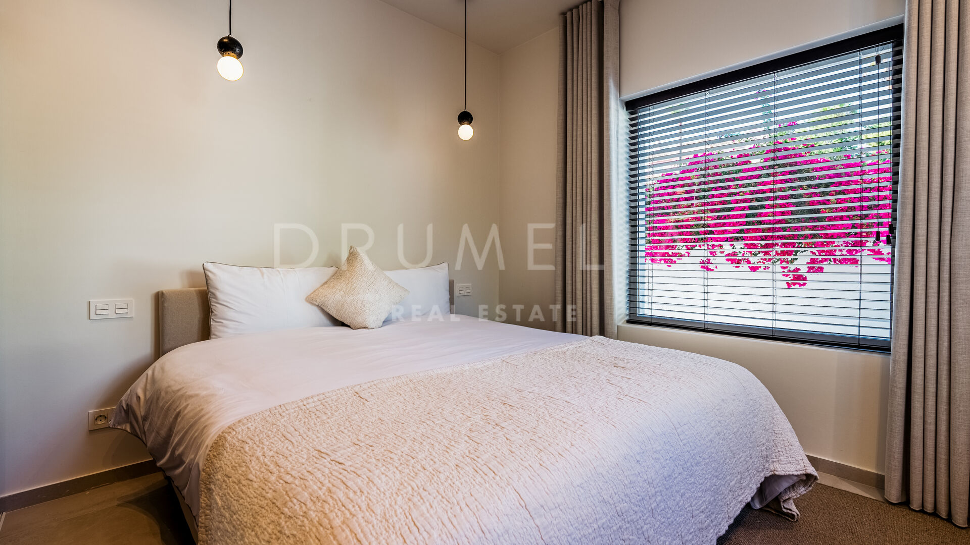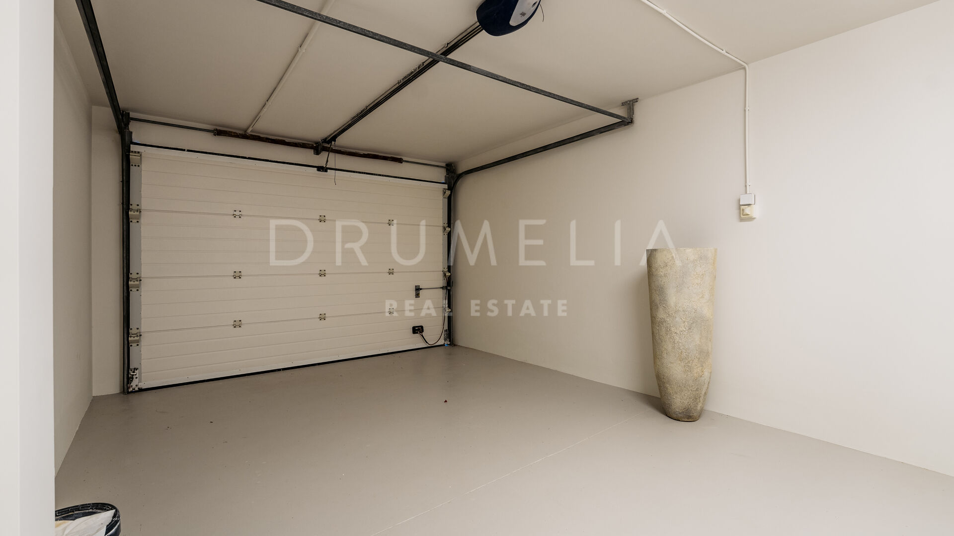 Den 470 m² store eiendommen, som ligger på en 990 m² stor tomt, passer perfekt inn i de vakre omgivelsene. Den moderne designen har en unik blanding av glasspartier med svarte stålrammer og store, åpne rom. Det totalrenoverte interiøret består av lyse oppholdsrom, et romslig, fullt utstyrt kjøkken med hvitevarer fra Siemens og Bosch, en sjarmerende sittebenk og en spisestue med orangeri og panoramavinduer. Villaen har fem romslige soverom, alle med eget bad, og hovedsoverommet har egen terrasse med fantastisk havutsikt og et separat omkledningsrom.