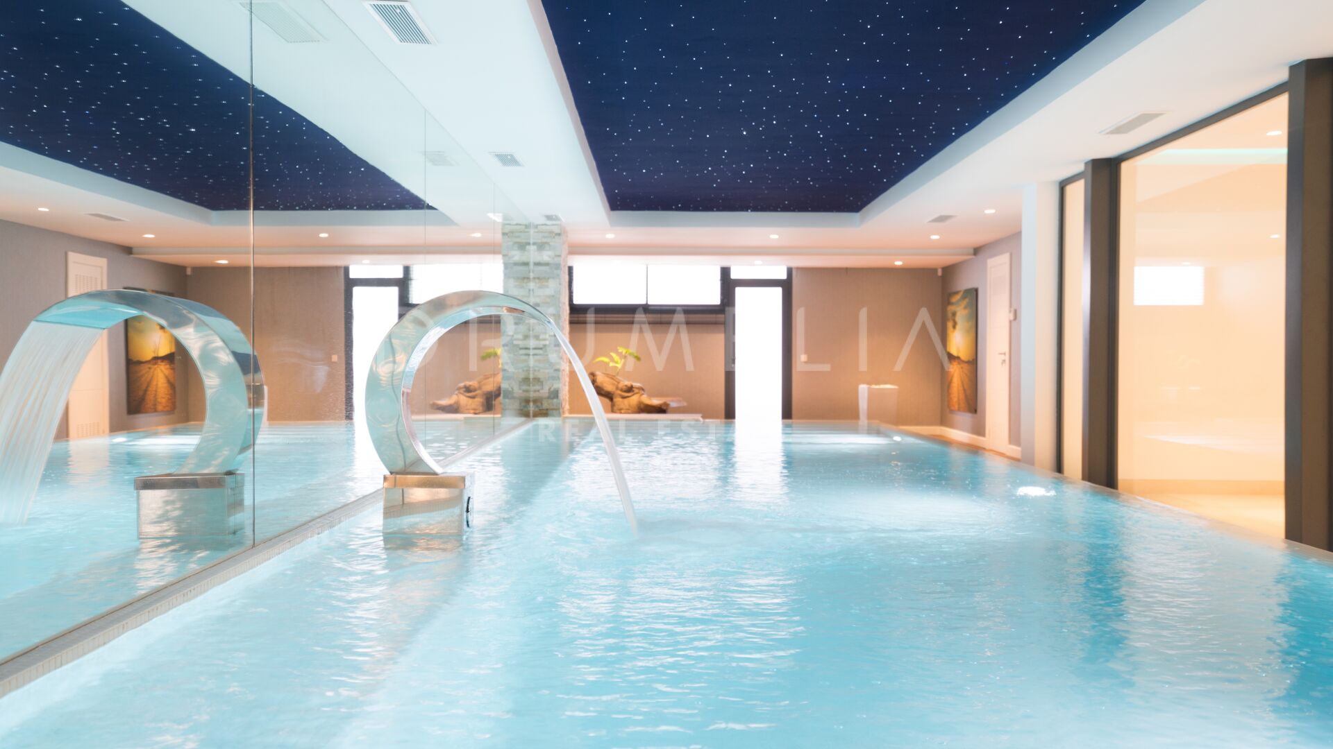 Denne egenskapen, orientering sør, har følgende funksjoner: privat terrasse, nær butikker, nær byen, nær havnen, separat leilighet, havutsikt, innendørs svømmebasseng, barer, vaskerom, dekket terrasse, heis, utsikt over hagen, ustikt over basseng, panoramautsikt, frontline beach, ved stranden, hjemmekino, klimaanlegg, vinkjeller, maskinrom, peis, marmorgulv, jacuzzi, nære sjø/strand, sauna, udekket terrasse, game room, treningsrom, spa, utmerket tilstand og grill.