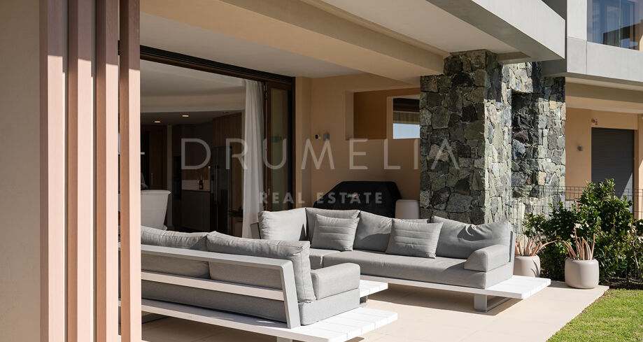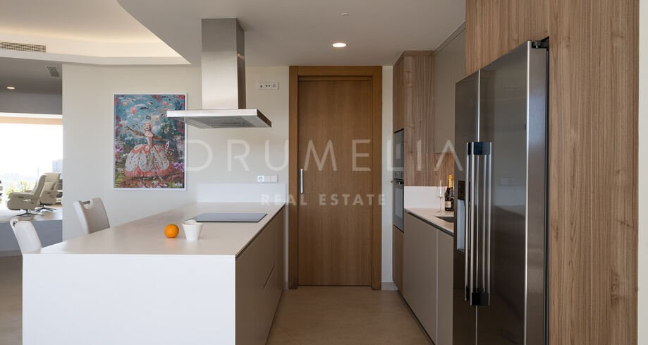 Denne imponerende leiligheten i første etasje med 3 soverom og 3 bad kombinerer moderne luksus med en eksepsjonell naturskjønn beliggenhet. Den sørvendte orienteringen gir lyse rom og spektakulær utsikt over havet og solnedgangene, mens det moderne designet og de førsteklasses materialene skaper en elegant og innbydende atmosfære.