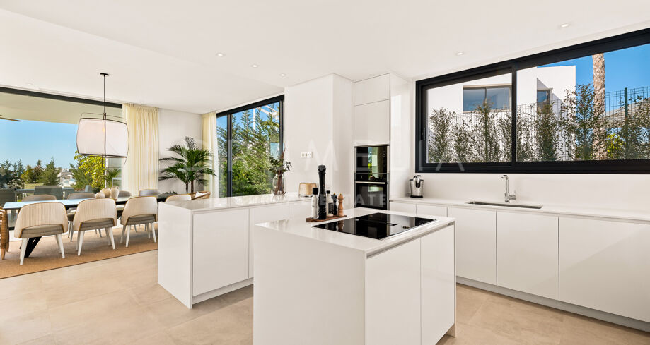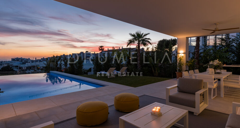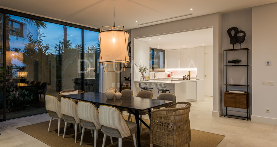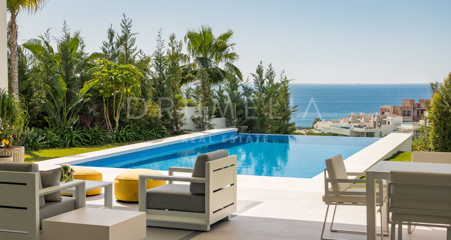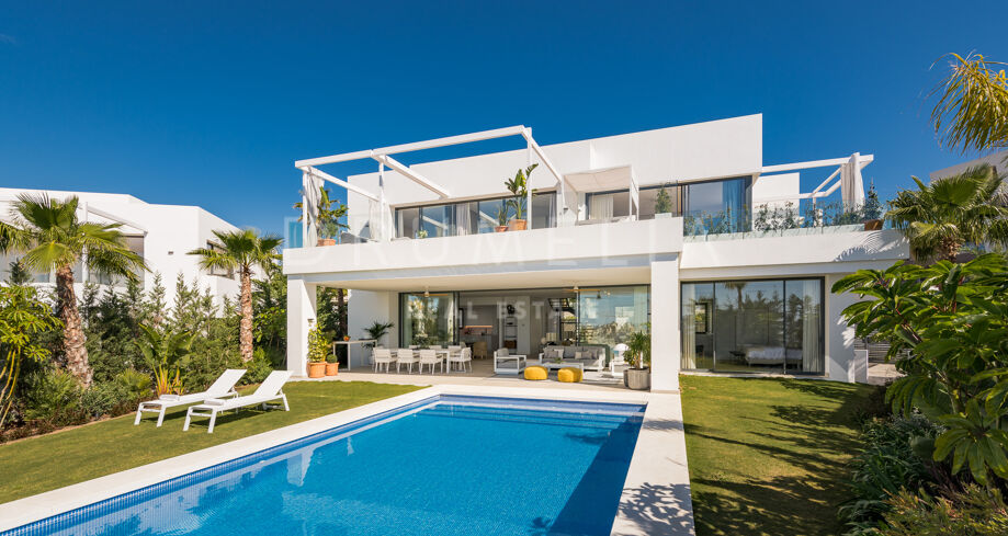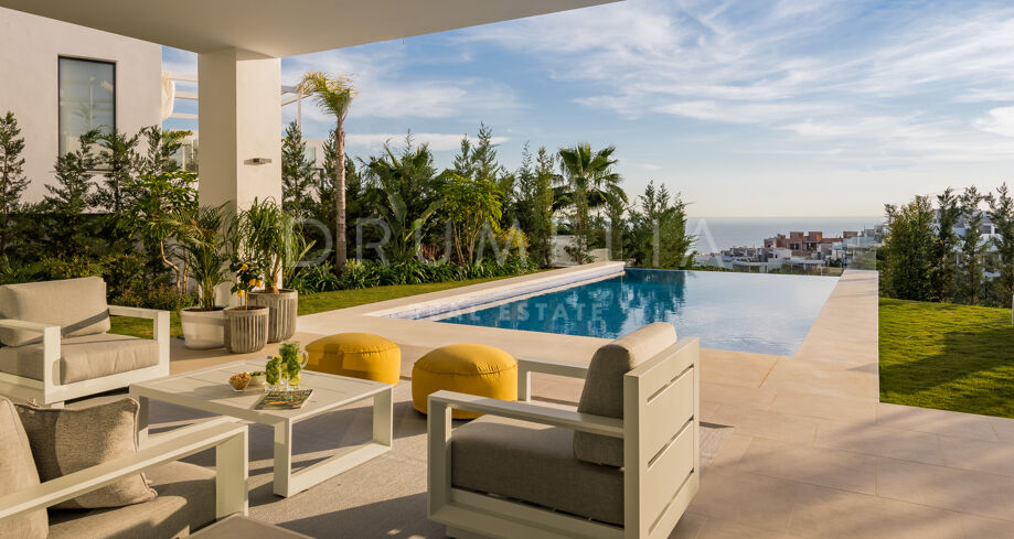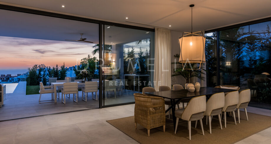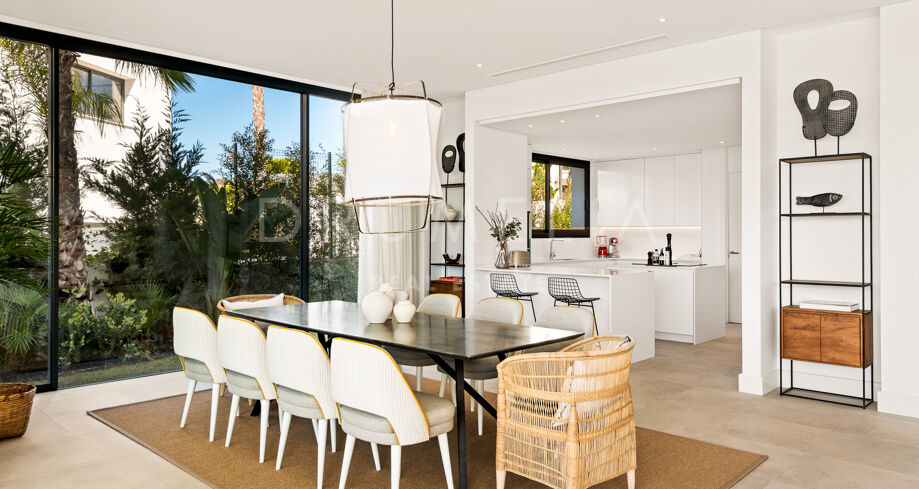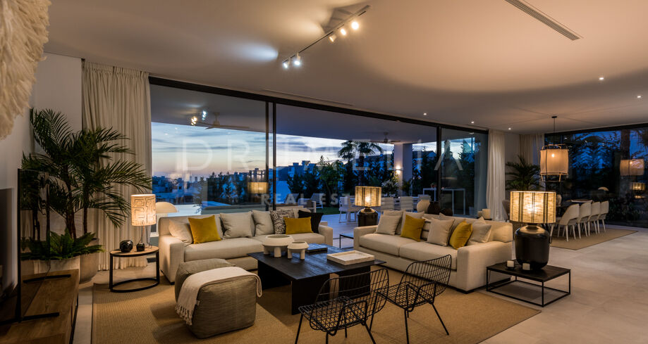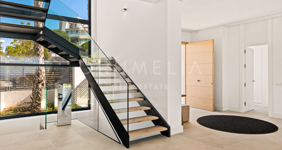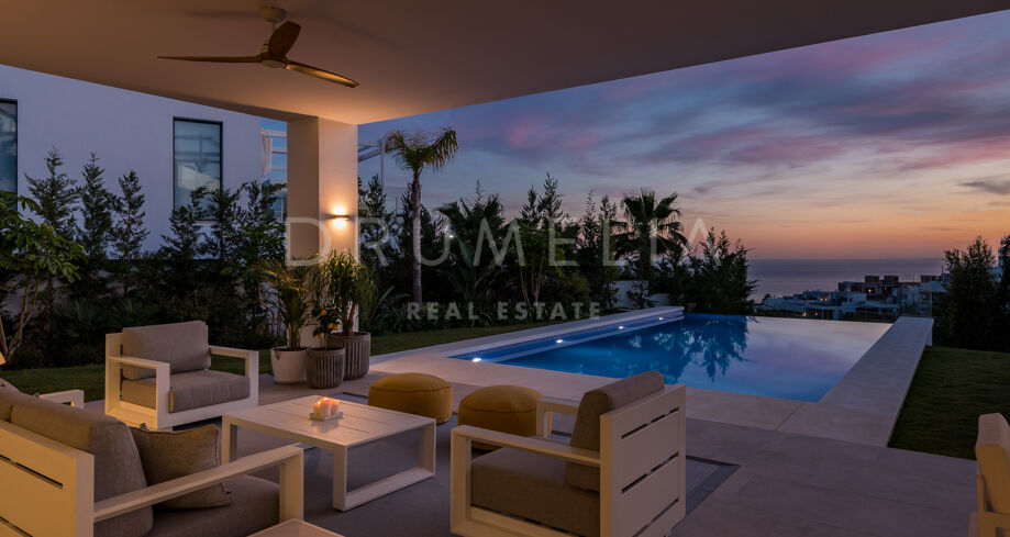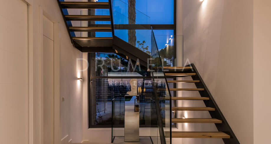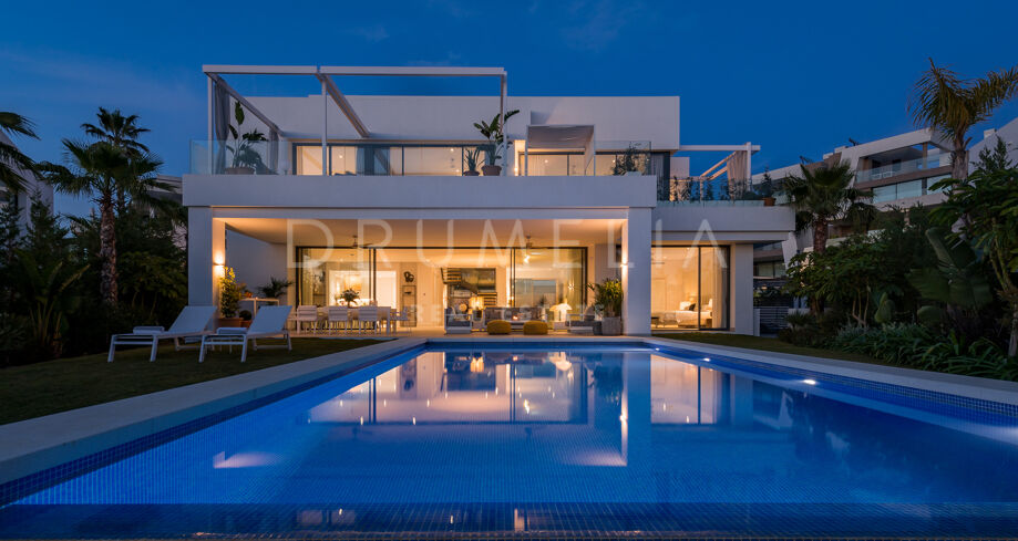 Villa til salgs i Cabopino, Marbella Øst med 5 soverom, 5 baderom, 1 toalett, innebygd 2021 og har basseng (privat), garasje (carport) og hage (privat). Dimensjoner: 635m² bygget, 852m² tomt og 149m² terrasse.