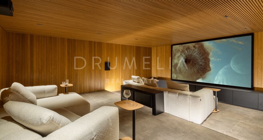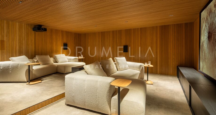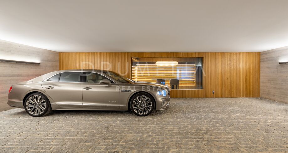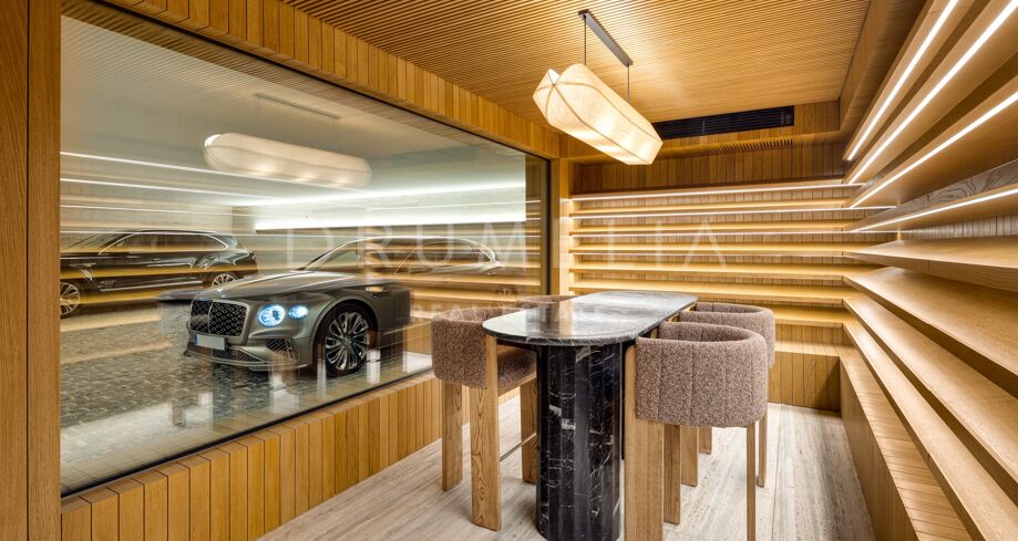 Boligen strekker seg over tre etasjer og tilbyr syv soverom med egne bad, en gjestetoalett og romslige oppholdsrom med naturlig lys og sømløs overgang til solrike terrasser. Åpen planløsning gjør den ideell for både sosiale sammenkomster og avslapning. Eksklusive fasiliteter som oppvarmet basseng, tyrkisk bad, privat kino og vinkjeller hever komfortnivået.