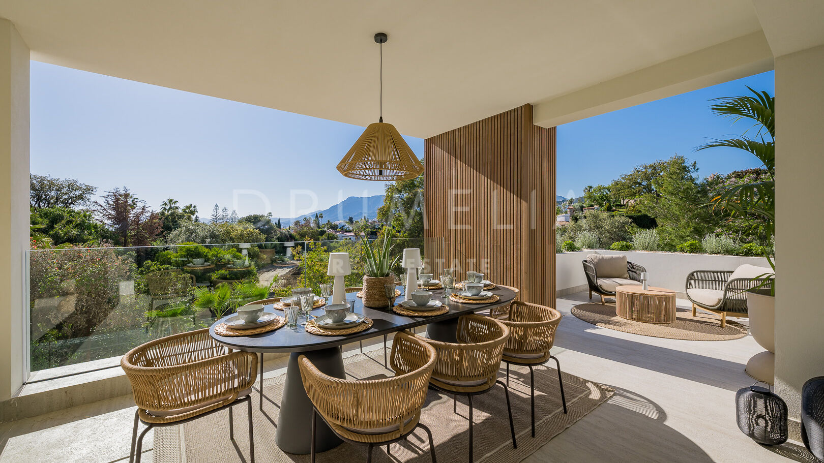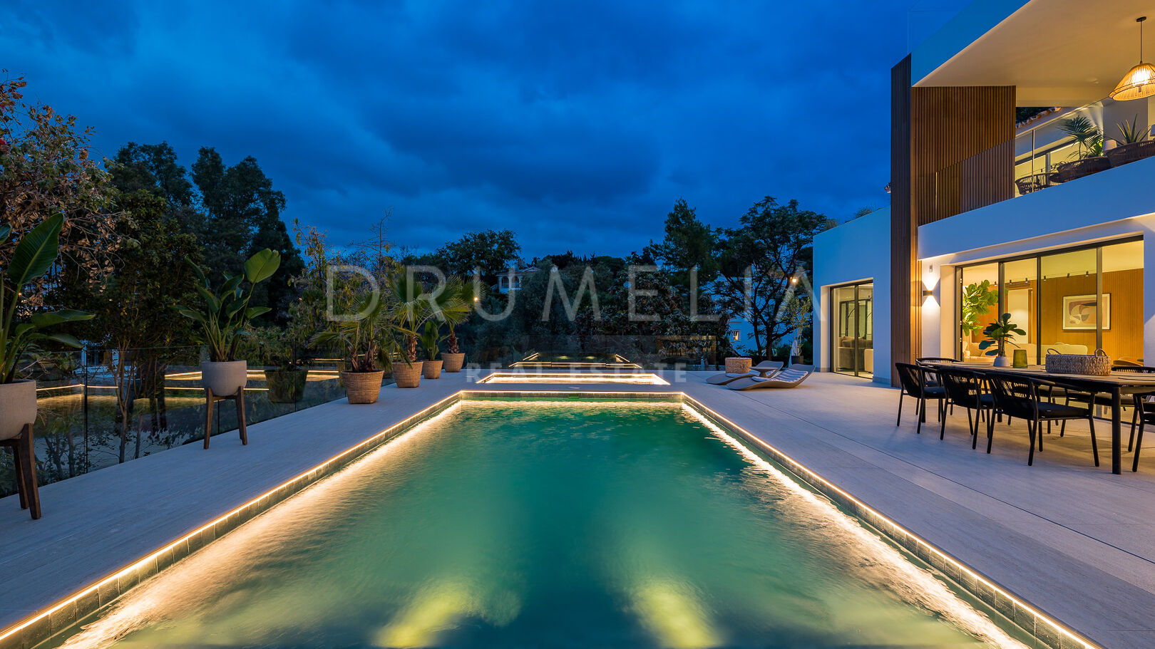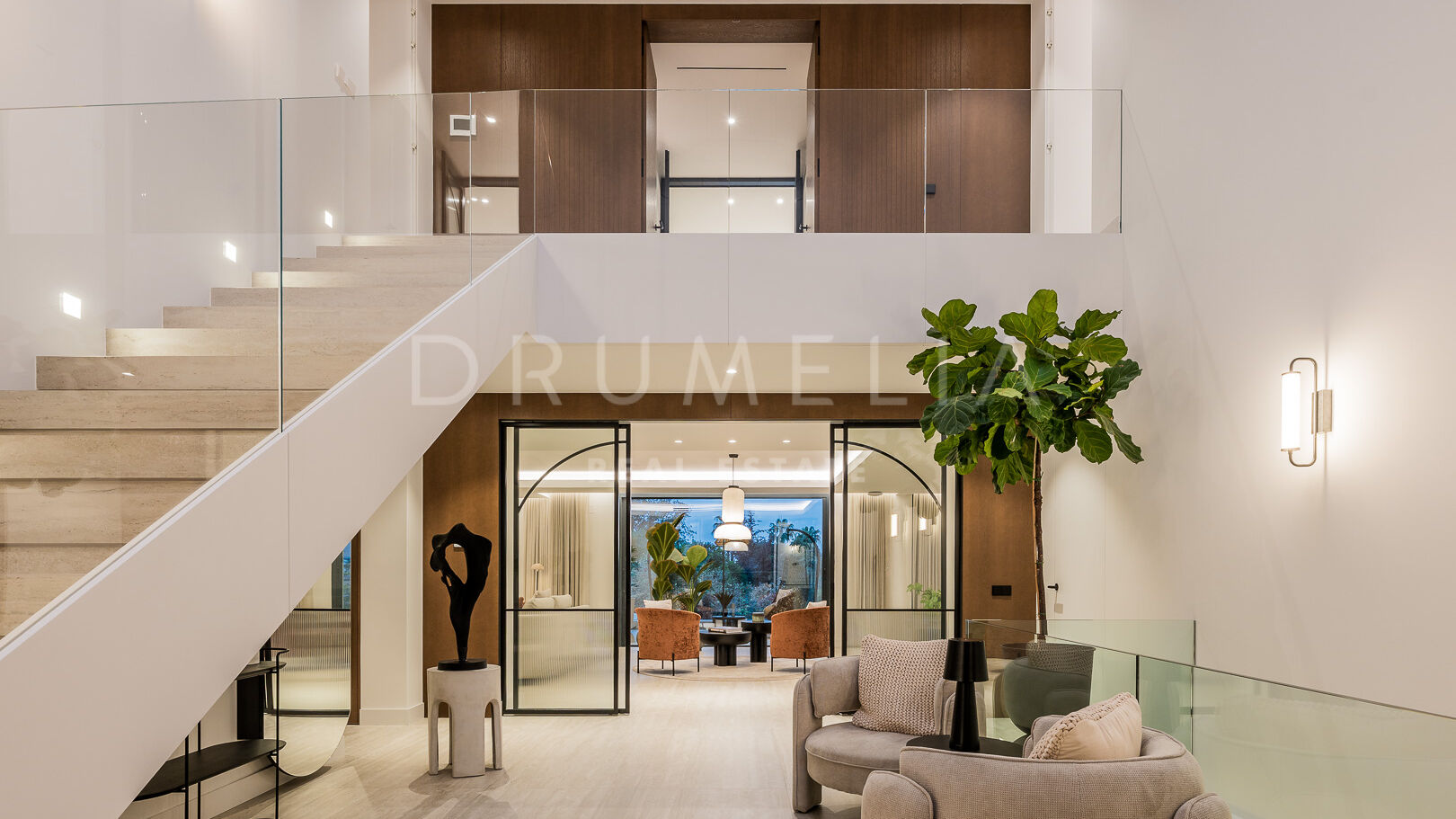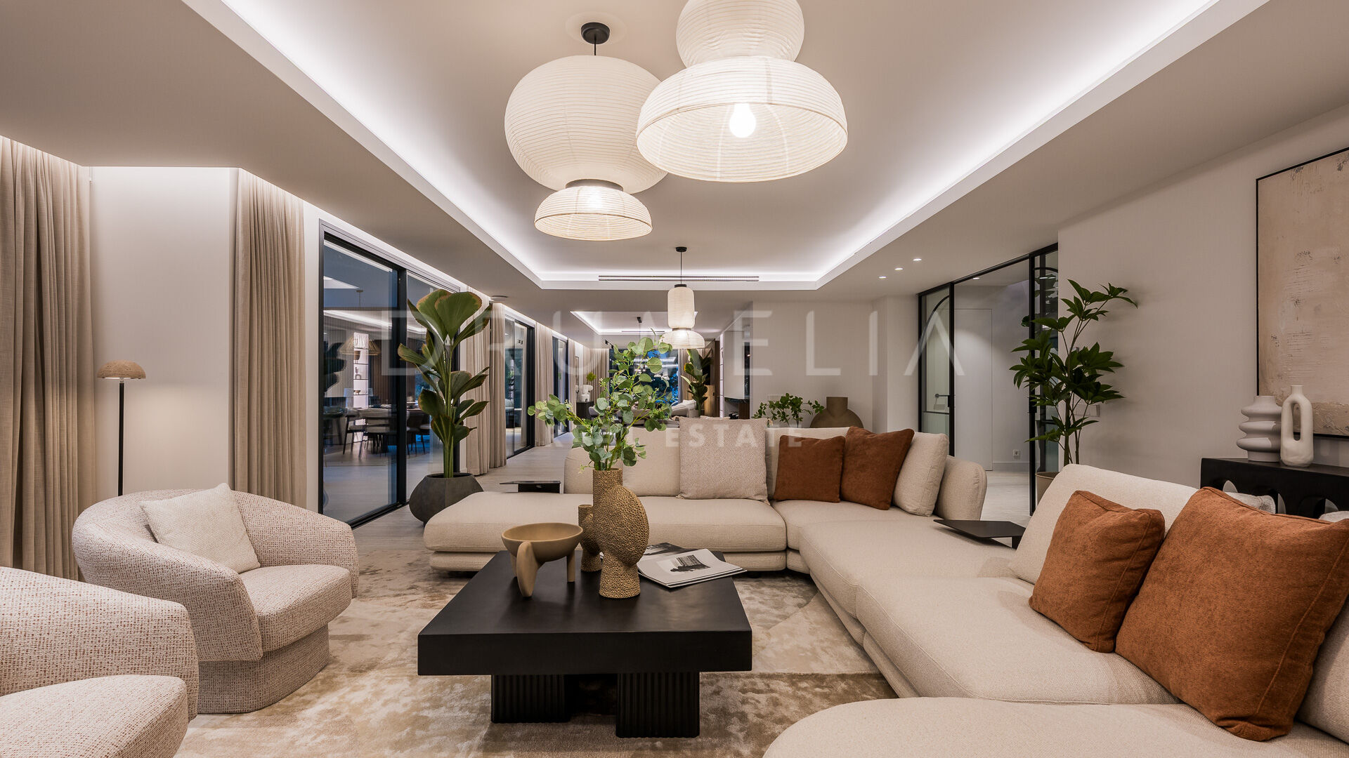 Denne imponerende villaen kombinerer moderne design med naturlig eleganse. Store vindusflater slipper inn rikelig med dagslys og fremhever luksuriøse detaljer som fiskebensparkett, steinoverflater og gjennomtenkt belysning. Den åpne planløsningen knytter sammen det minimalistiske kjøkkenet, spiseområdet og to separate stuer – en intim og koselig, den andre romslig og perfekt for sosiale sammenkomster. En nøytral fargepalett med innslag av grønne planter gir en moderne og avslappende atmosfære.