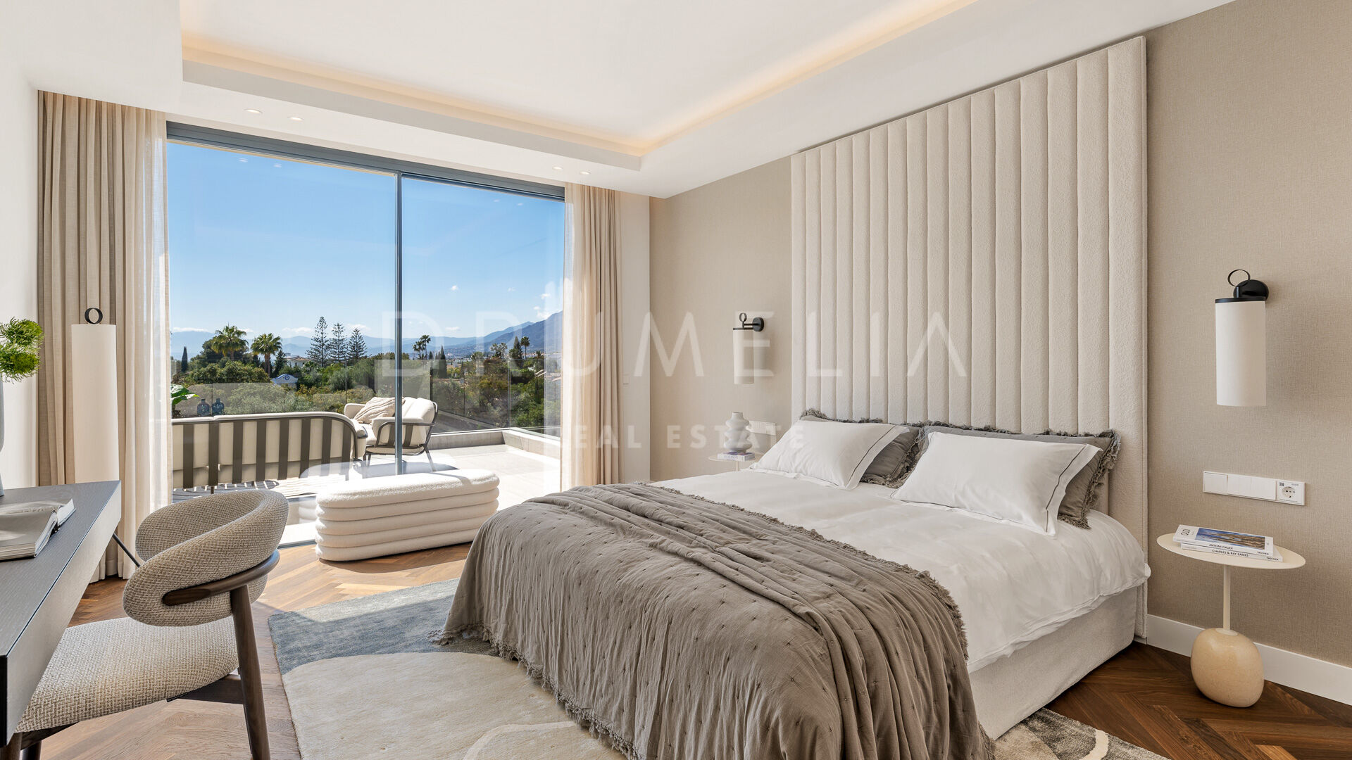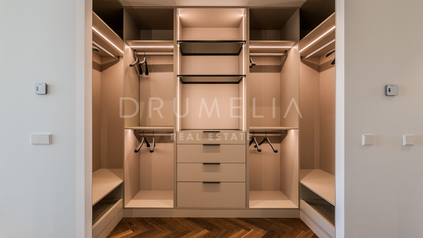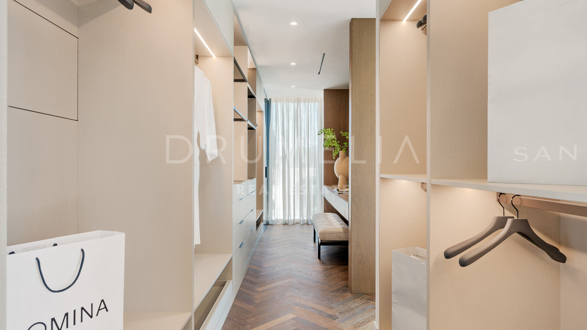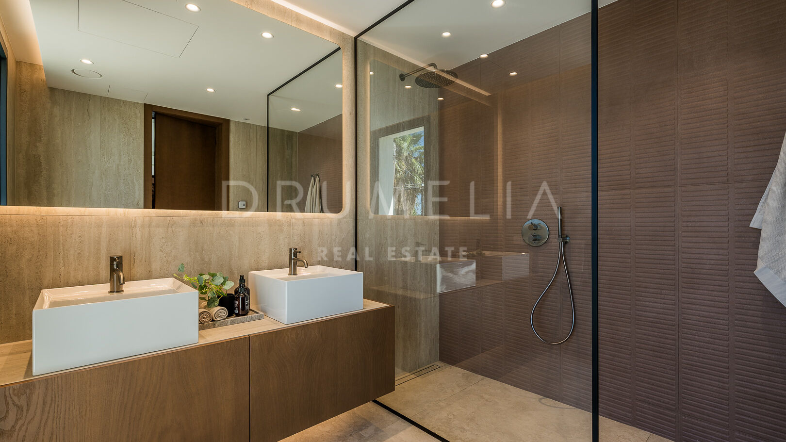 Hovedsuiten oser av ro og tilbyr direkte tilgang til utsikt over hage eller fjell, mens walk-in-garderoben har rikelig med oppbevaringsplass med innebygde løsninger og stemningsbelysning. Badene har en spa-lignende stil, med frittstående badekar, doble servanter og dusjer med rillet glass og varme steindetaljer. Hver detalj reflekterer høy kvalitet – fra bakbelyste speil til elegant innebygd vinoppbevaring.