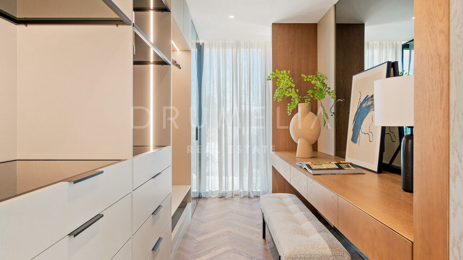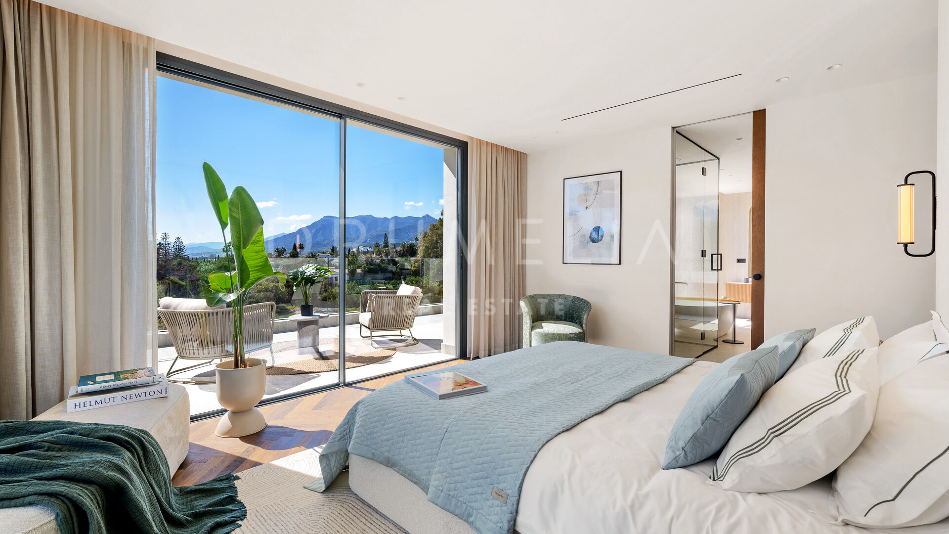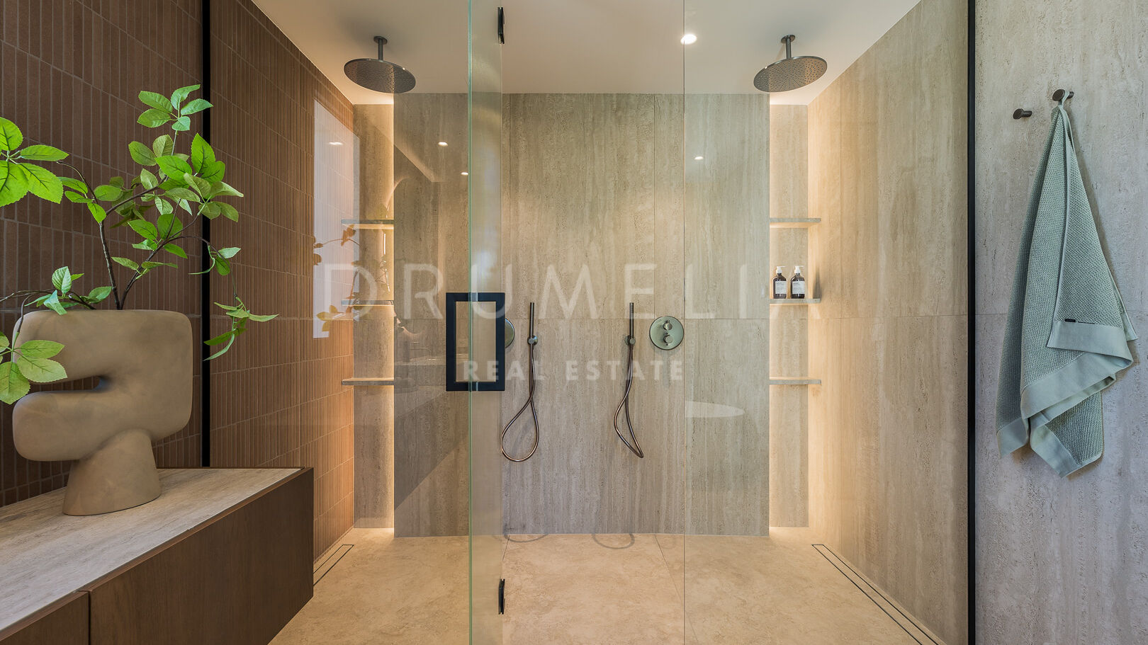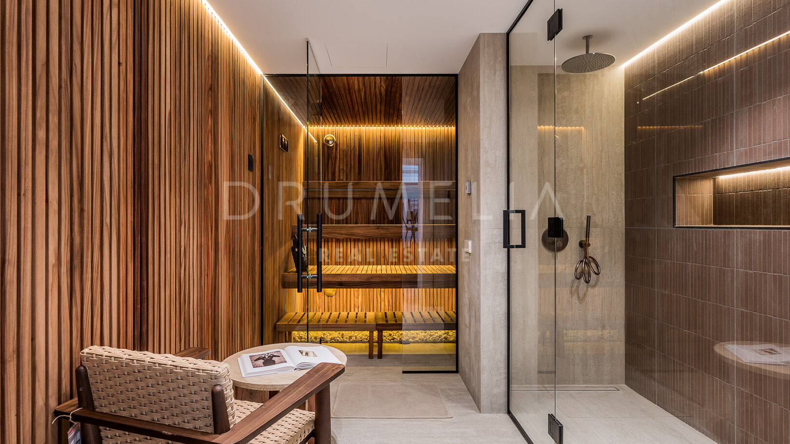 Hovedsuiten oser av ro og tilbyr direkte tilgang til utsikt over hage eller fjell, mens walk-in-garderoben har rikelig med oppbevaringsplass med innebygde løsninger og stemningsbelysning. Badene har en spa-lignende stil, med frittstående badekar, doble servanter og dusjer med rillet glass og varme steindetaljer. Hver detalj reflekterer høy kvalitet – fra bakbelyste speil til elegant innebygd vinoppbevaring.