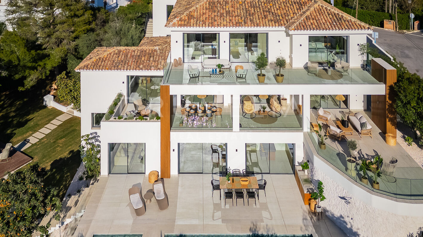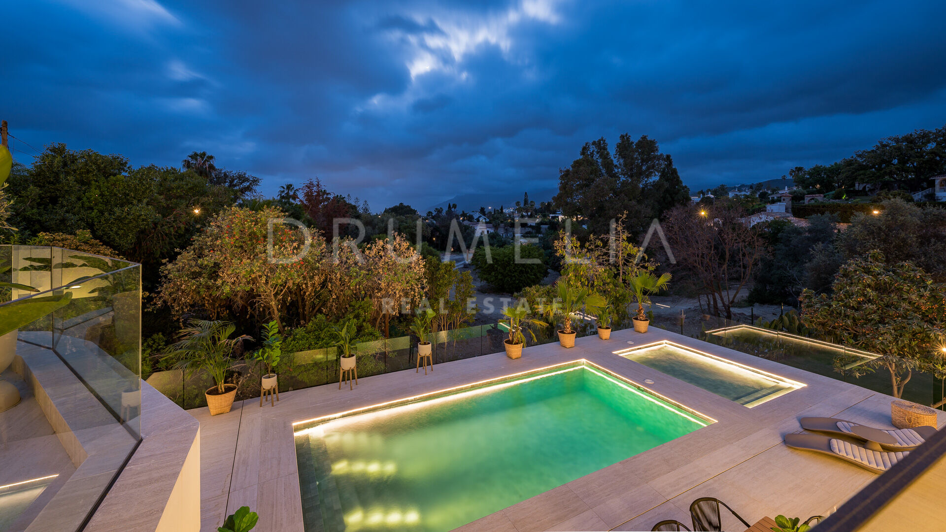 Utendørs byr de romslige terrassene på perfekte rammer for både avslapning og sosiale sammenkomster, med vestvendt beliggenhet og vakker fjellutsikt. Et privat treningsrom og en badstue gir velvære i toppklasse, mens det oppvarmede bassenget kan brukes hele året. Enten du nyter solnedgangen fra badekaret eller en sommerkveld med venner, kombinerer denne villaen luksus, komfort og stil på en perfekt måte.