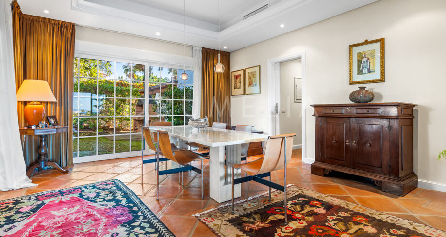 Denne elegante villaen med seks soverom og syv bad ligger i det eksklusive inngjerdede området El Rosario, Marbella Øst, og tilbyr spektakulær utsikt over havet og fjellene. Med en tomt på 2595 m² og et bygget areal på 844 m² kombinerer denne eiendommen tradisjonell andalusisk sjarm med luksuriøse moderne bekvemmeligheter.